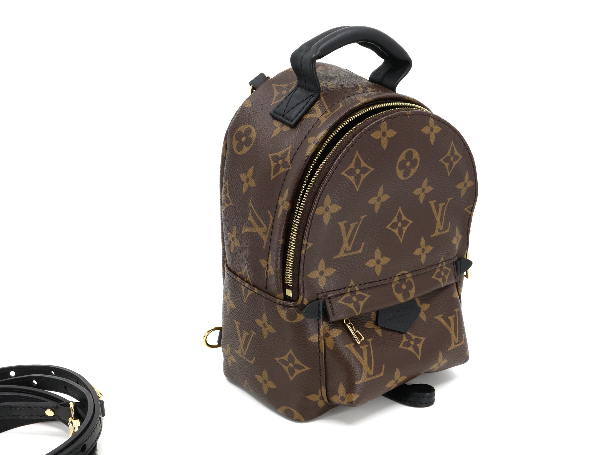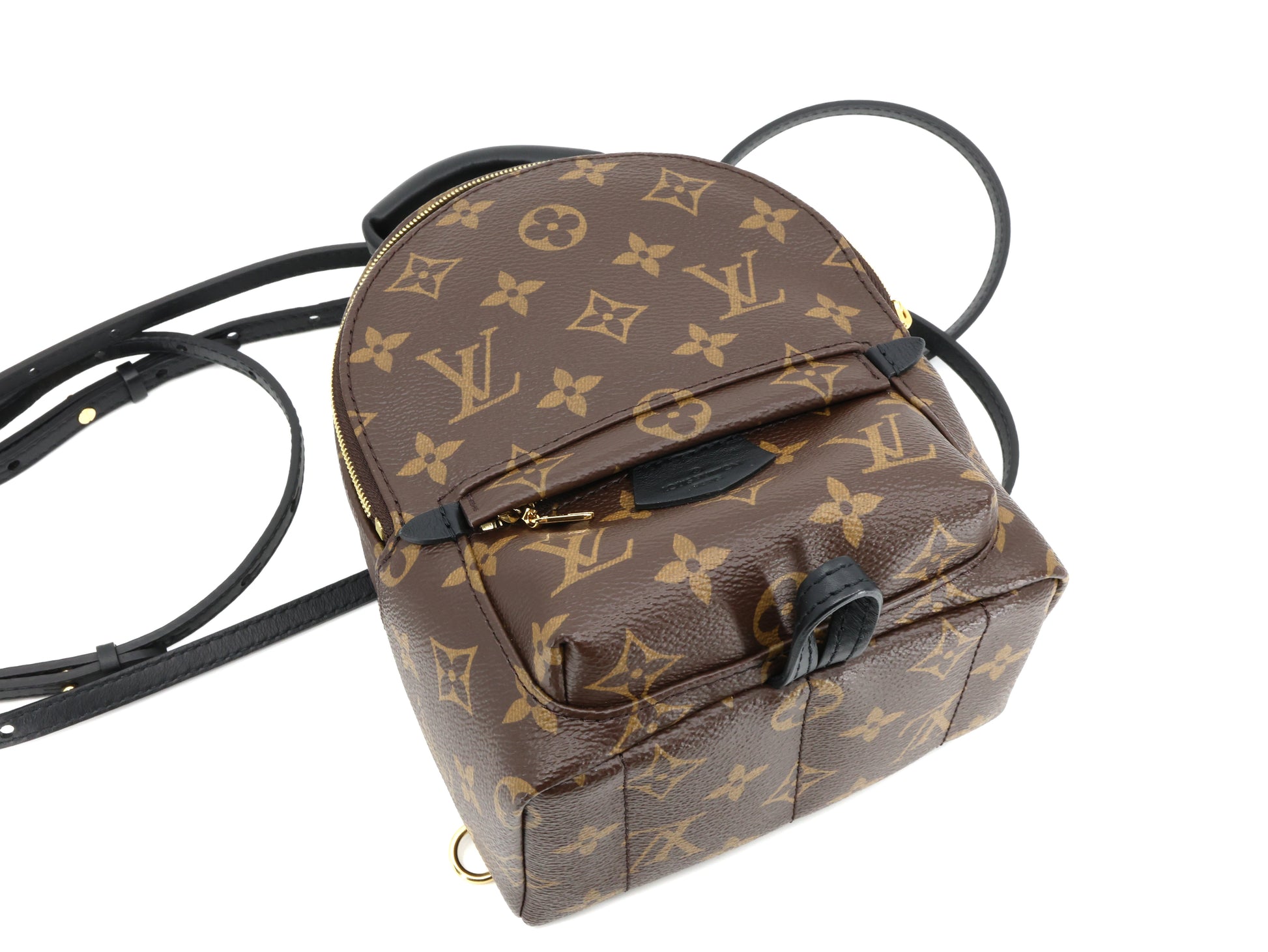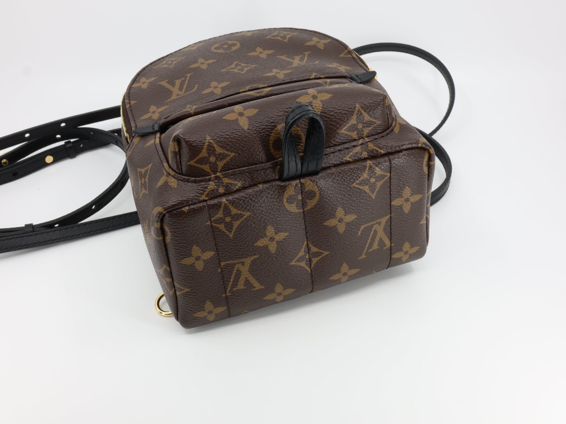 This is an Louis Vuitton Monogram Palm Springs Backpack Mini. This small backpack is made of dark brown monogram canvas with black leather trim. It has a padded leather handle, adjustable shoulder straps, and a front zipper pocket. opens to a black fabric interior with a patch pocket.