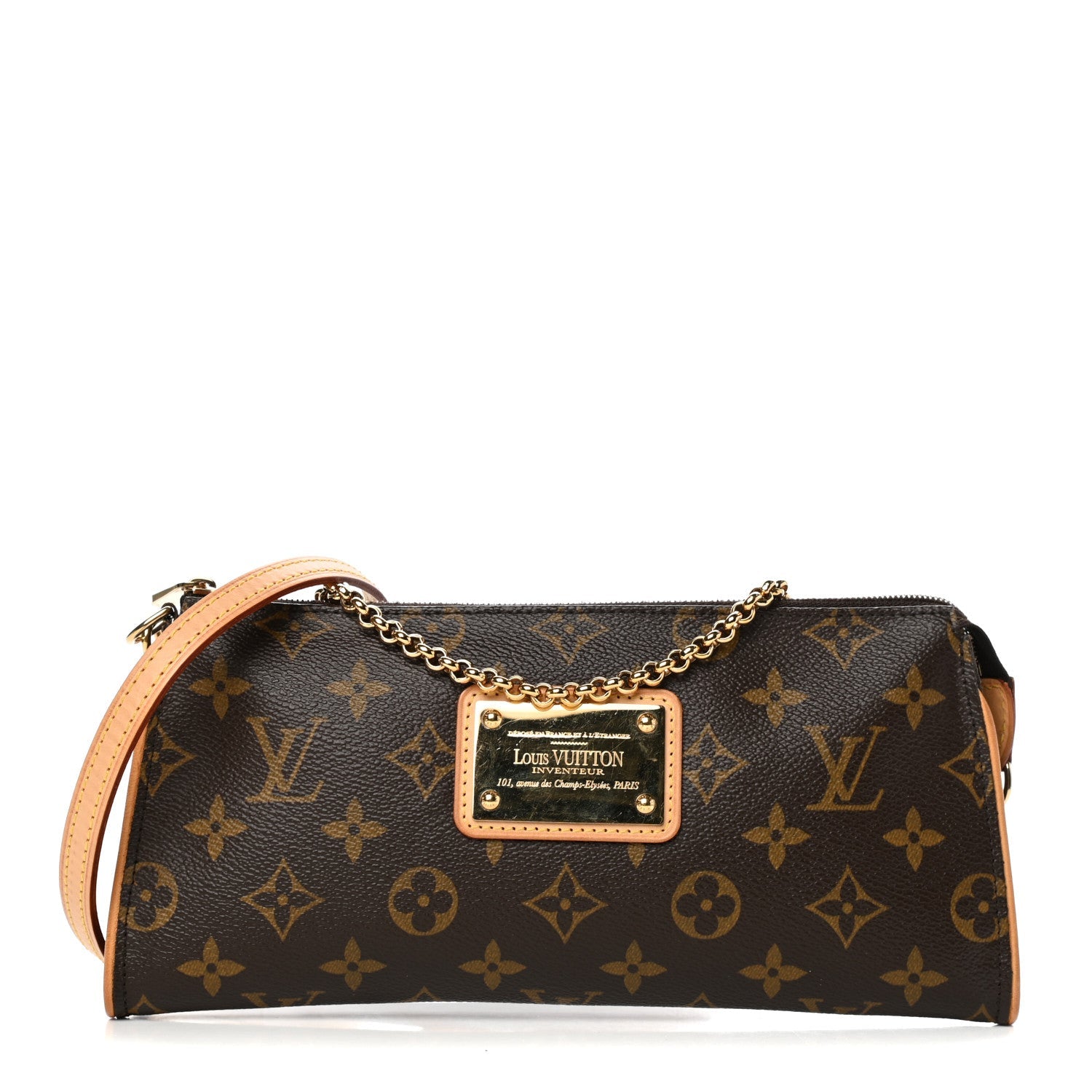 The Clutch Features an Elegant polished brass chain wrist strap, Vachetta trim, and Polished brass hardware including a Louis Vuitton signature nameplate.