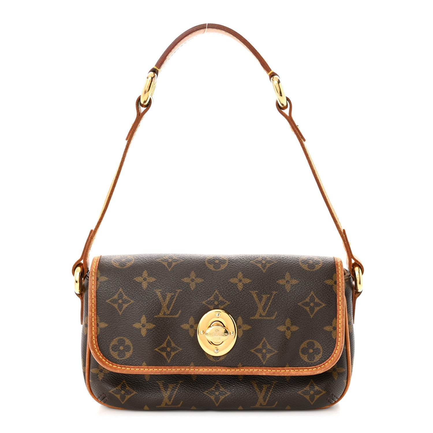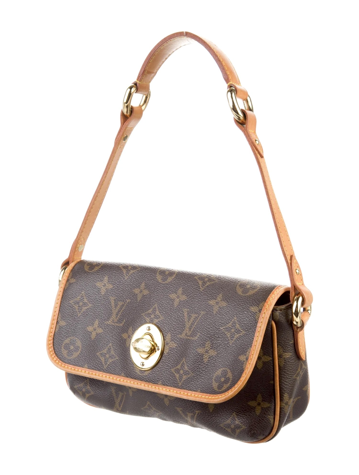 This Chic Handbag/ Shoulder Bag is Crafted of Signature Louis Vuitton Monogram coated canvas. The Bag Features a natural Vachetta leather strap and trim, polished Gold links, and a facing flap with a gold turn lock. This opens to a cocoa brown fabric interior with a patch pocket.