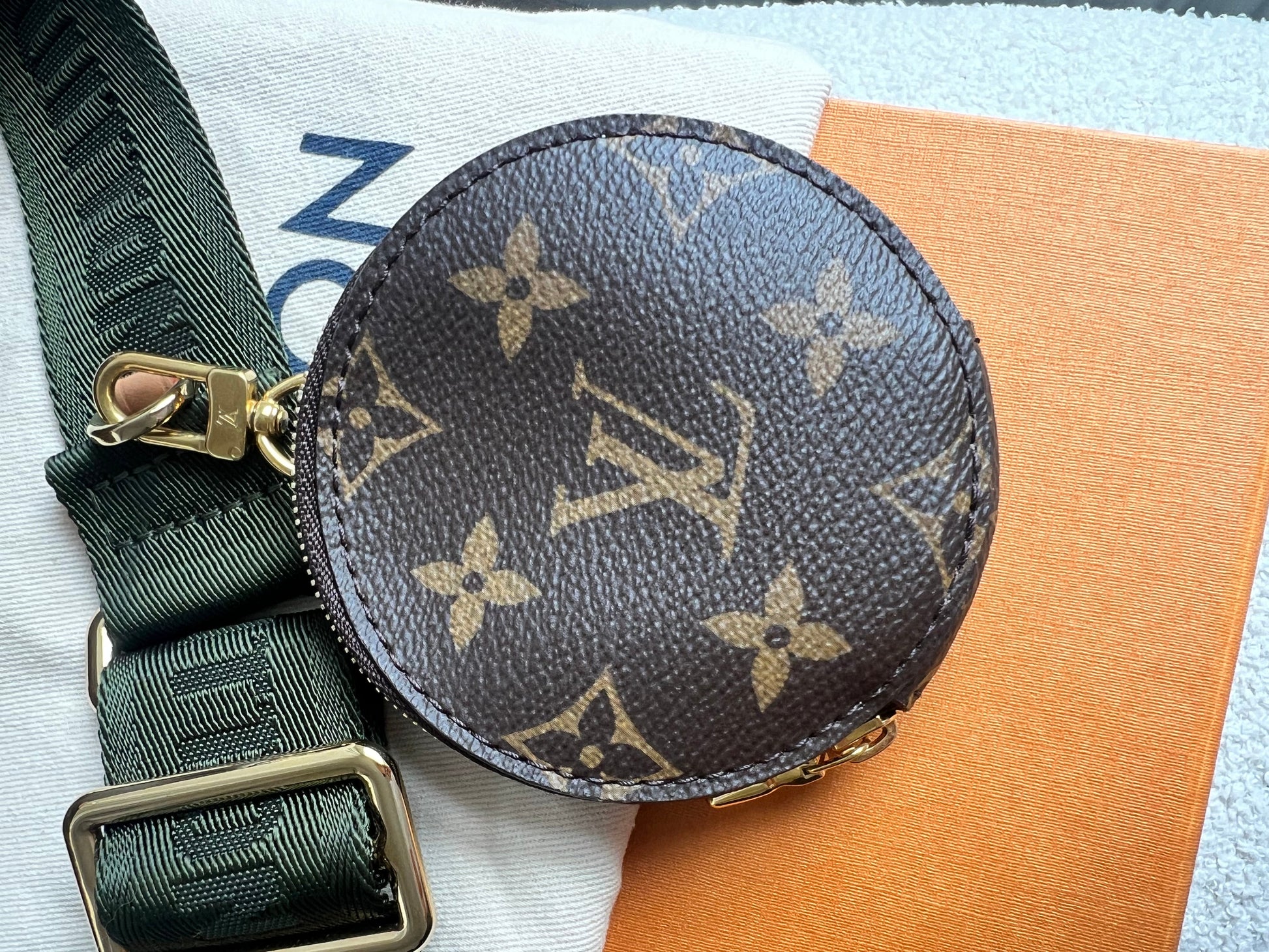 Louis Vuitton Multi Pochette Accessoires in monogram canvas and khaki strap. The Multi PA is a hybrid cross body bags bringing together a pochette accessories, Mini Pochette accessories and a round coin purse. Crafted from monogram canvas, it comes with a removable short gold-tone chain and an adjustable jacquard strap of multiple carrying options. Each component can be used separately or carried together as a cross body bag. This is a highly sought after style.
