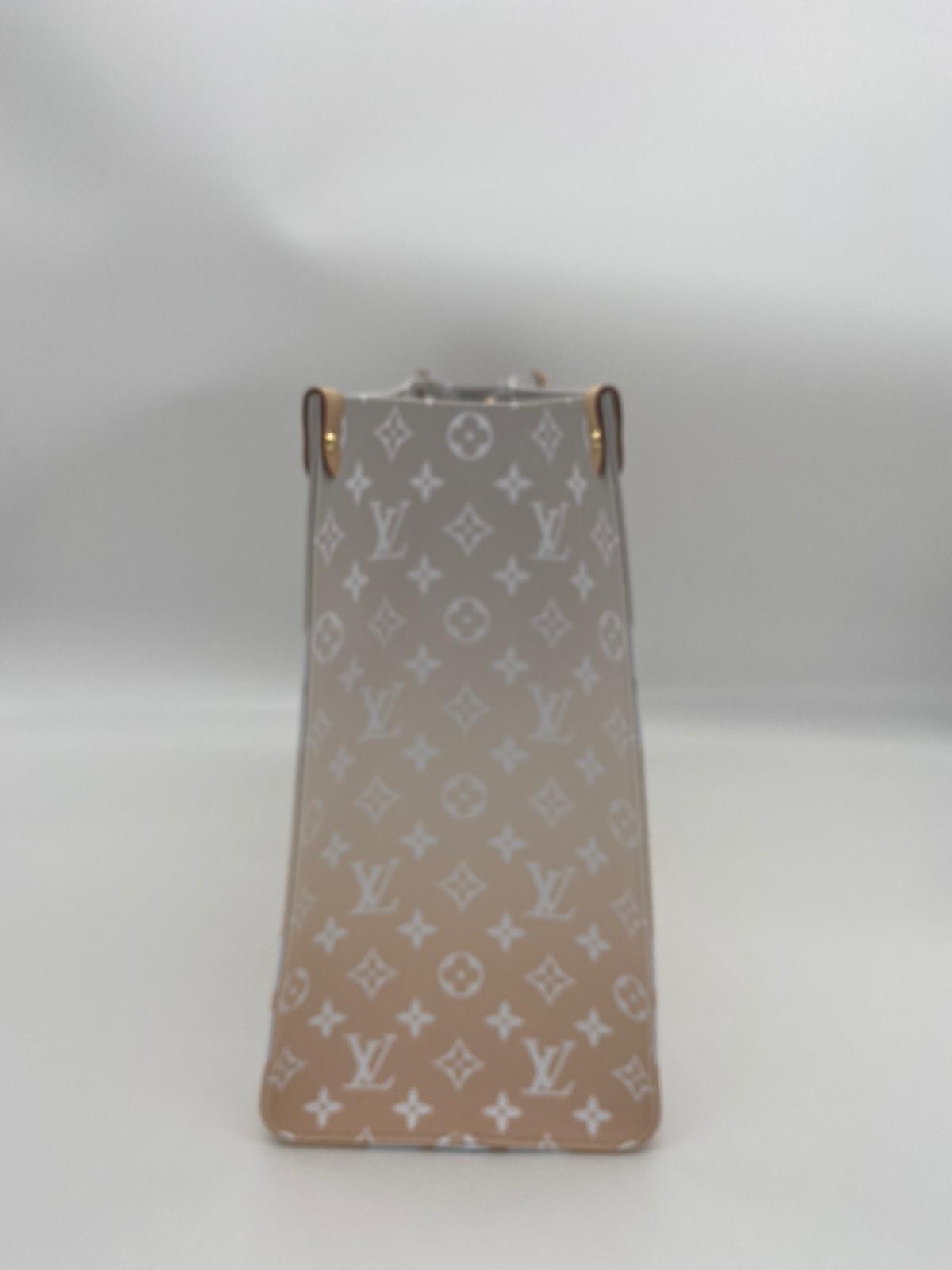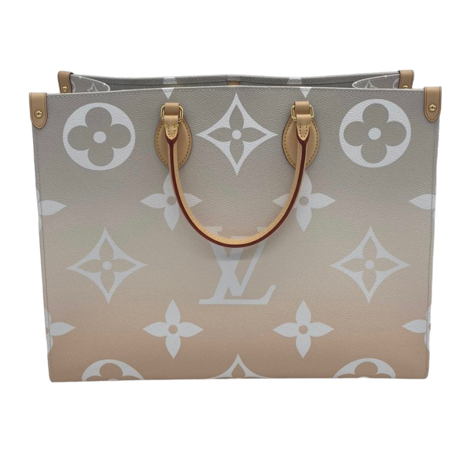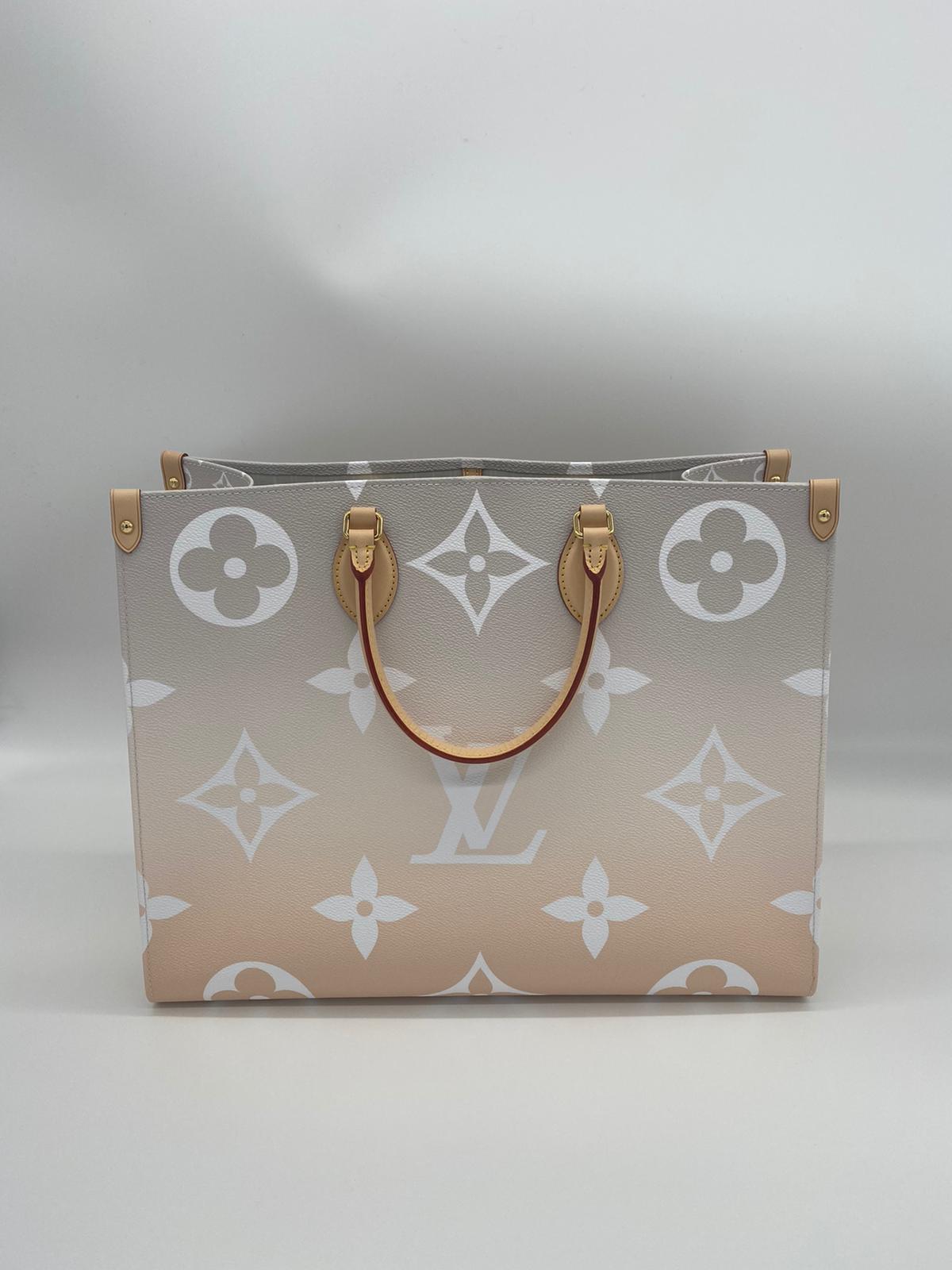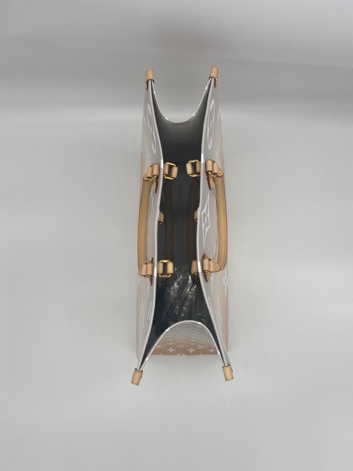 Louis Vuitton's classic On The Go bag is effortlessly chic in a two-tone cream leather. It's square oversized shape makes it practical, with room for a laptop, documents and all your essentials.