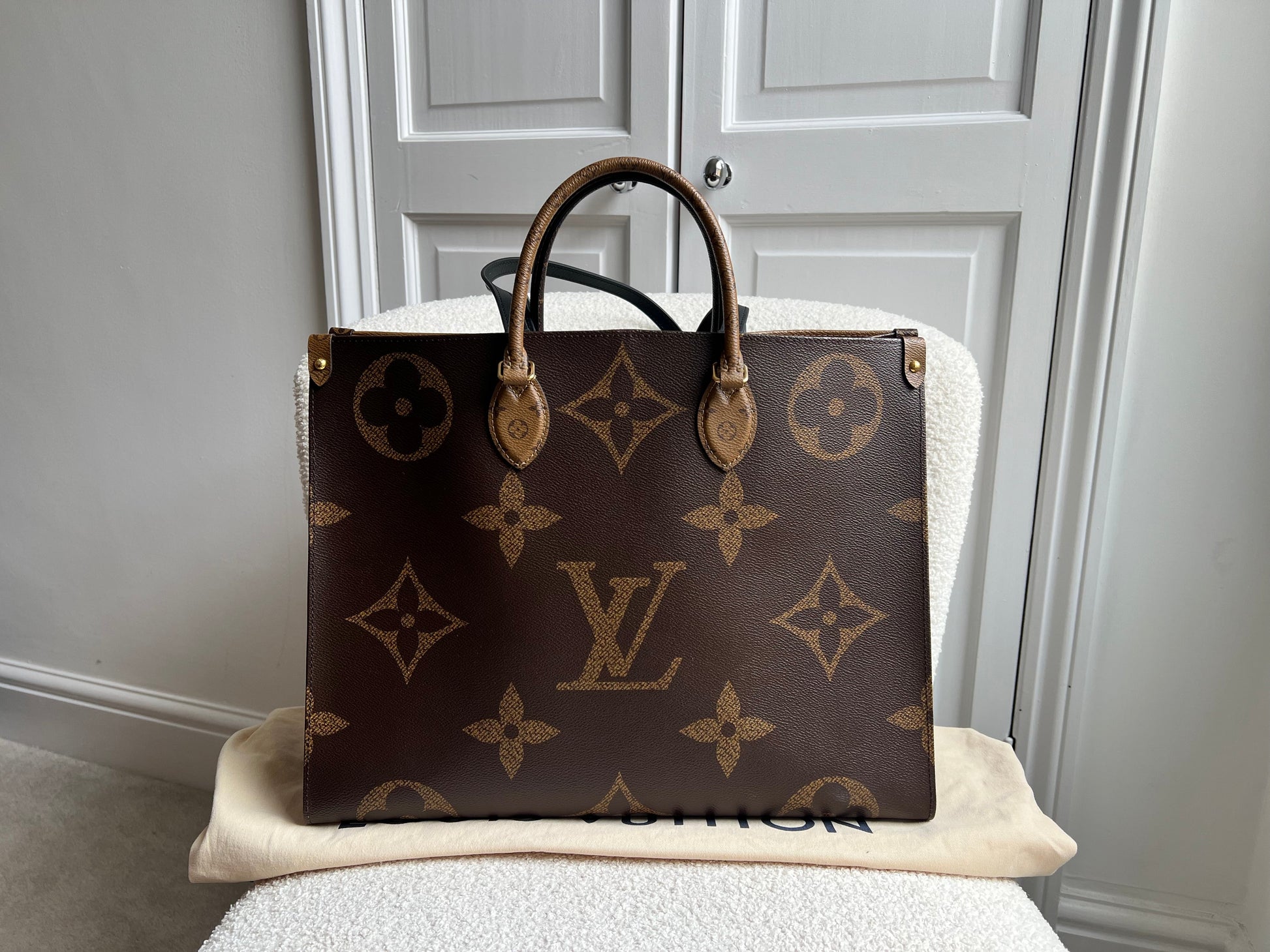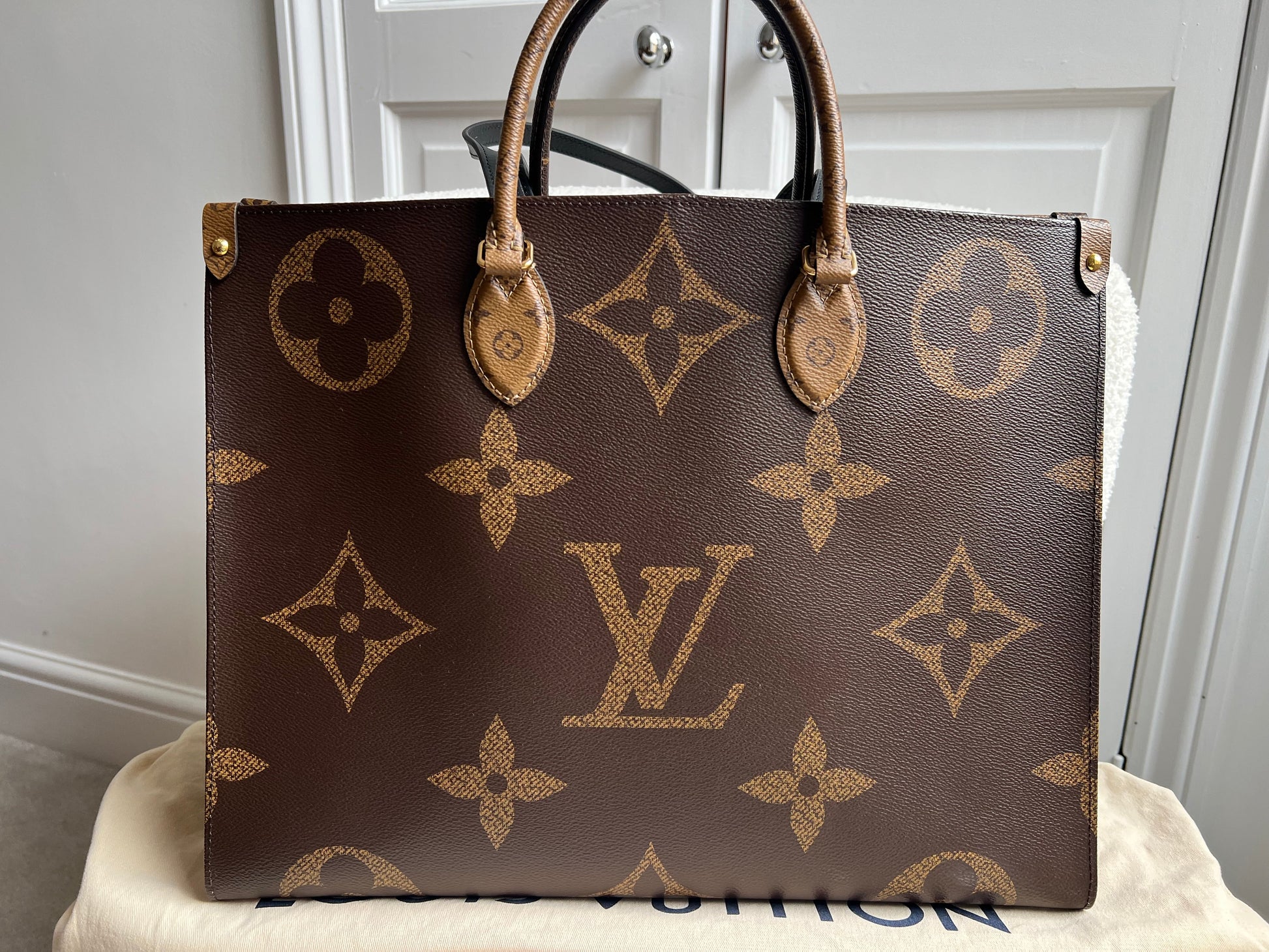 Louis Vuitton On The Go GM in Giant Monogram Canvas with gold hardware. Fashioned from Monogram Giant canvas, the Onthego tote bag is as striking as it is practical. A Monogram Reverse pattern on the sides and handles creates a stylish contrast in colour and scale. With its generous capacity, shoulder straps and iconic Toron top handles, this versatile GM model is an ideal bag for everyday wear.