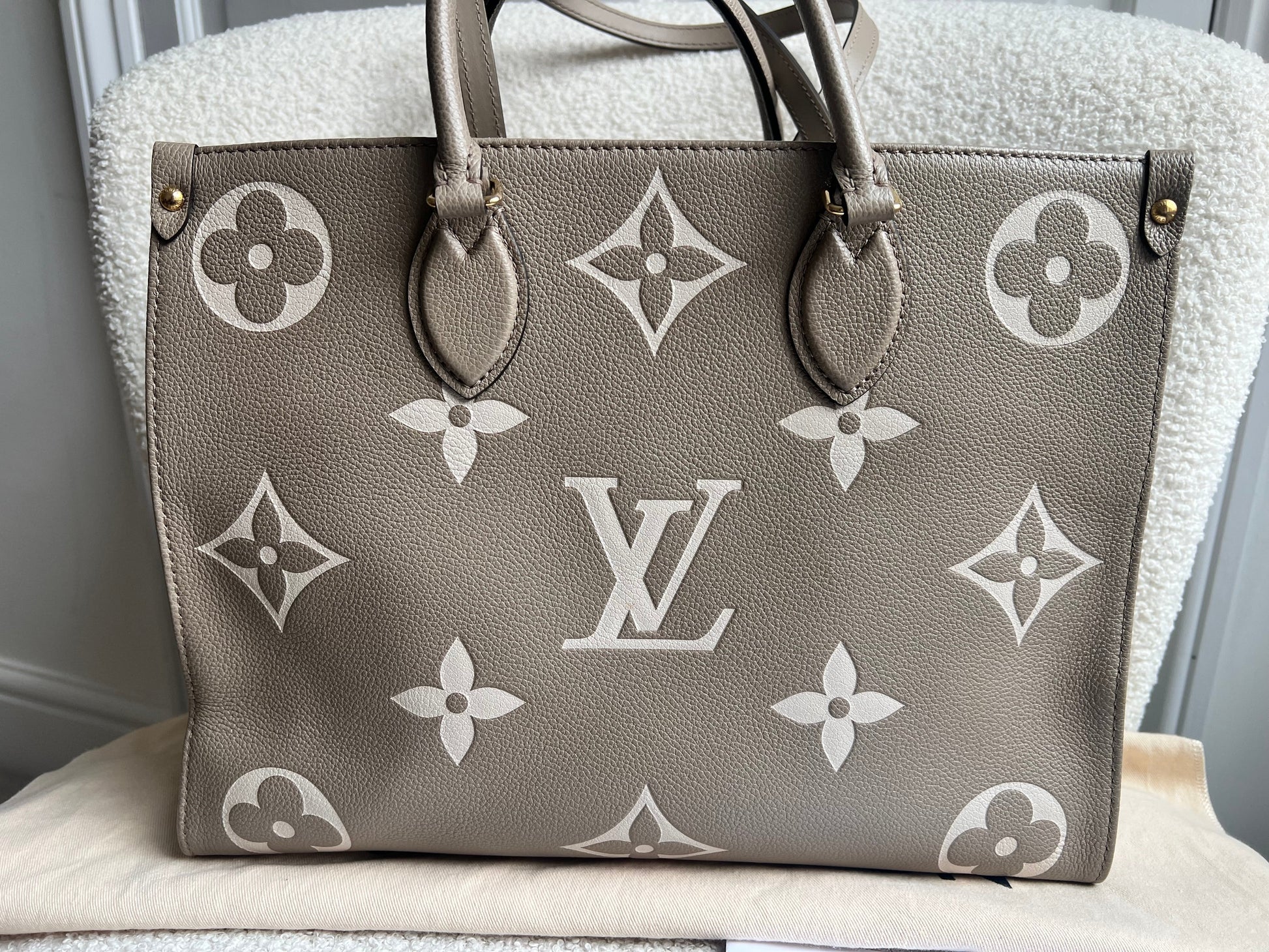 Louis Vuitton On The Go MM in Tourterelle and creme bicolour Empreinte Leather with gold hardware. The stylishly large Sized Onthego MM tote goes from workday to weekend. The bag’s square shape affords plenty of room for day to day use. For the first time, this model is offered in Monogram Empreinte Giant, a supple embossed leather, Versatile, it can be carried by hand or worn over the shoulder on its two long straps.
