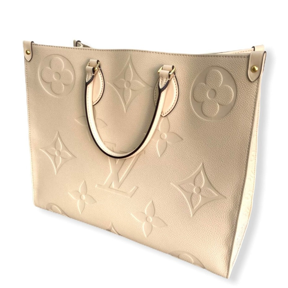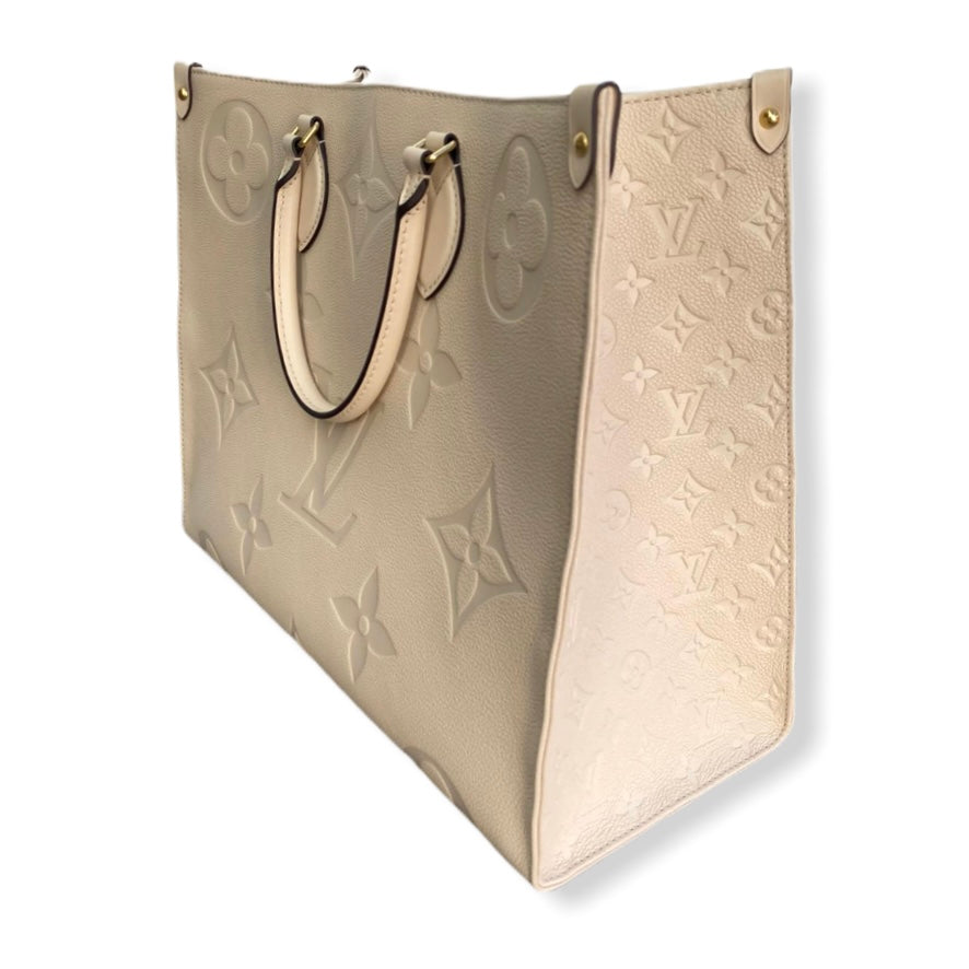 Louis Vuitton's classic On The Go bag is effortlessly chic in cream empreinte leather. It's square oversized shape makes it practical, with room for a laptop, documents and all your essentials. Carry in-hand or over the shoulder with it's two longer straps.