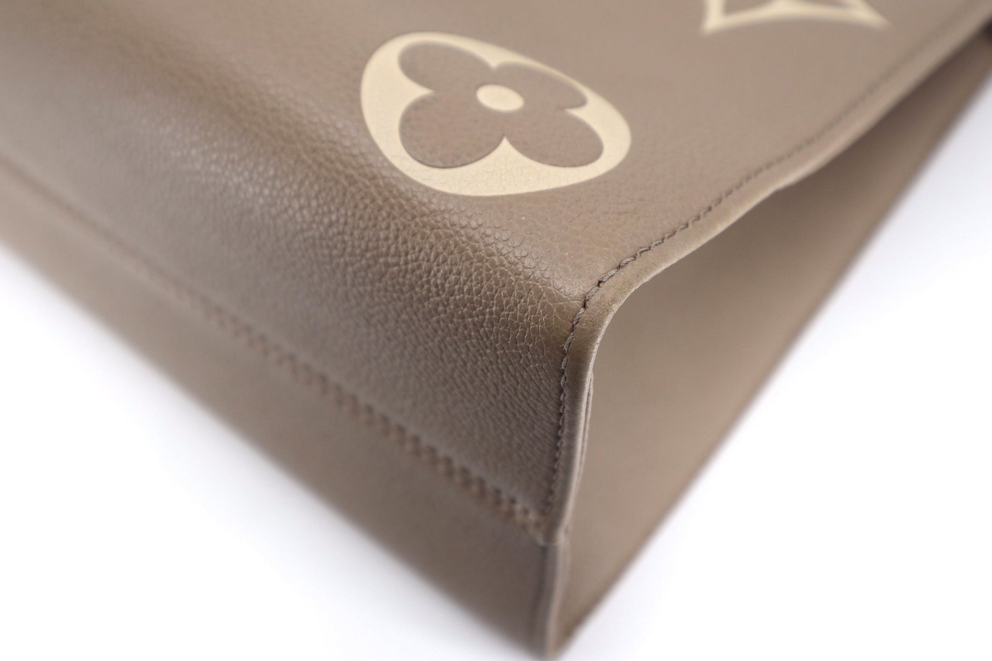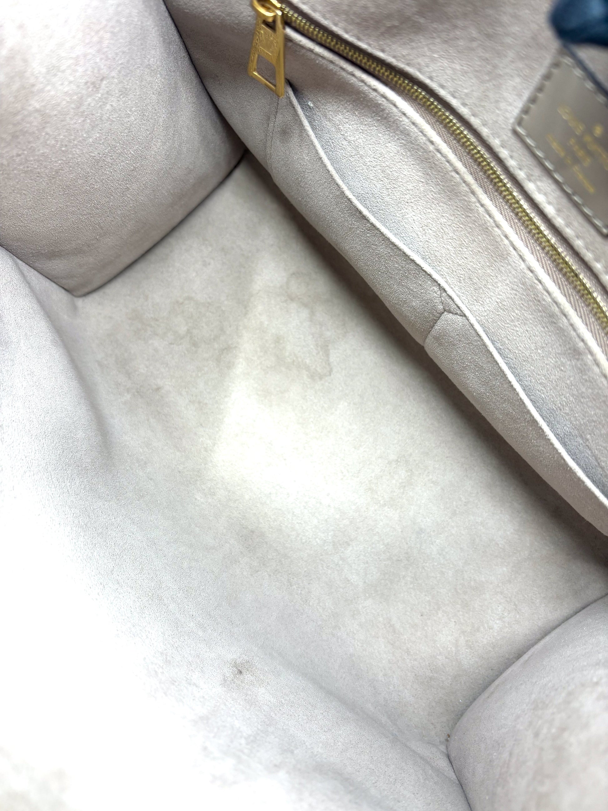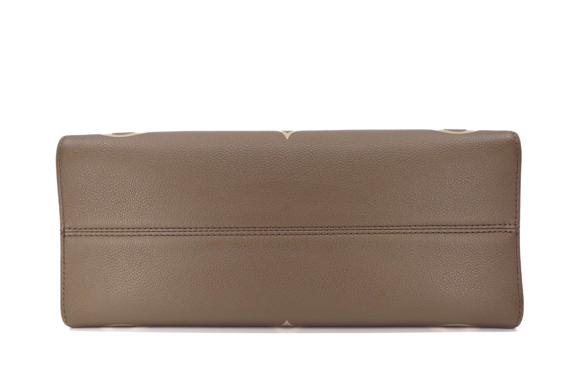 This is an pre-loved Louis Vuitton OnTheGo MM Giant Monogram Empreinte MM Tourterelle in Creme.
