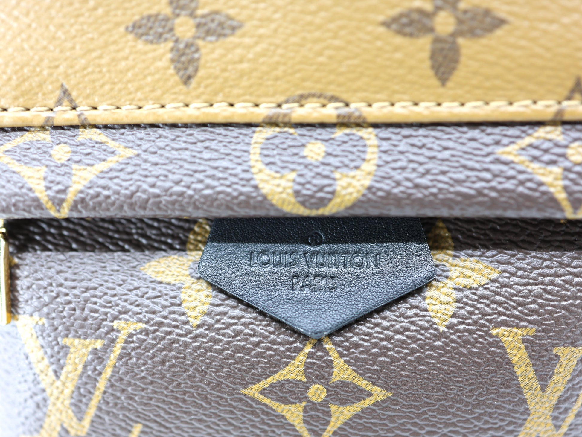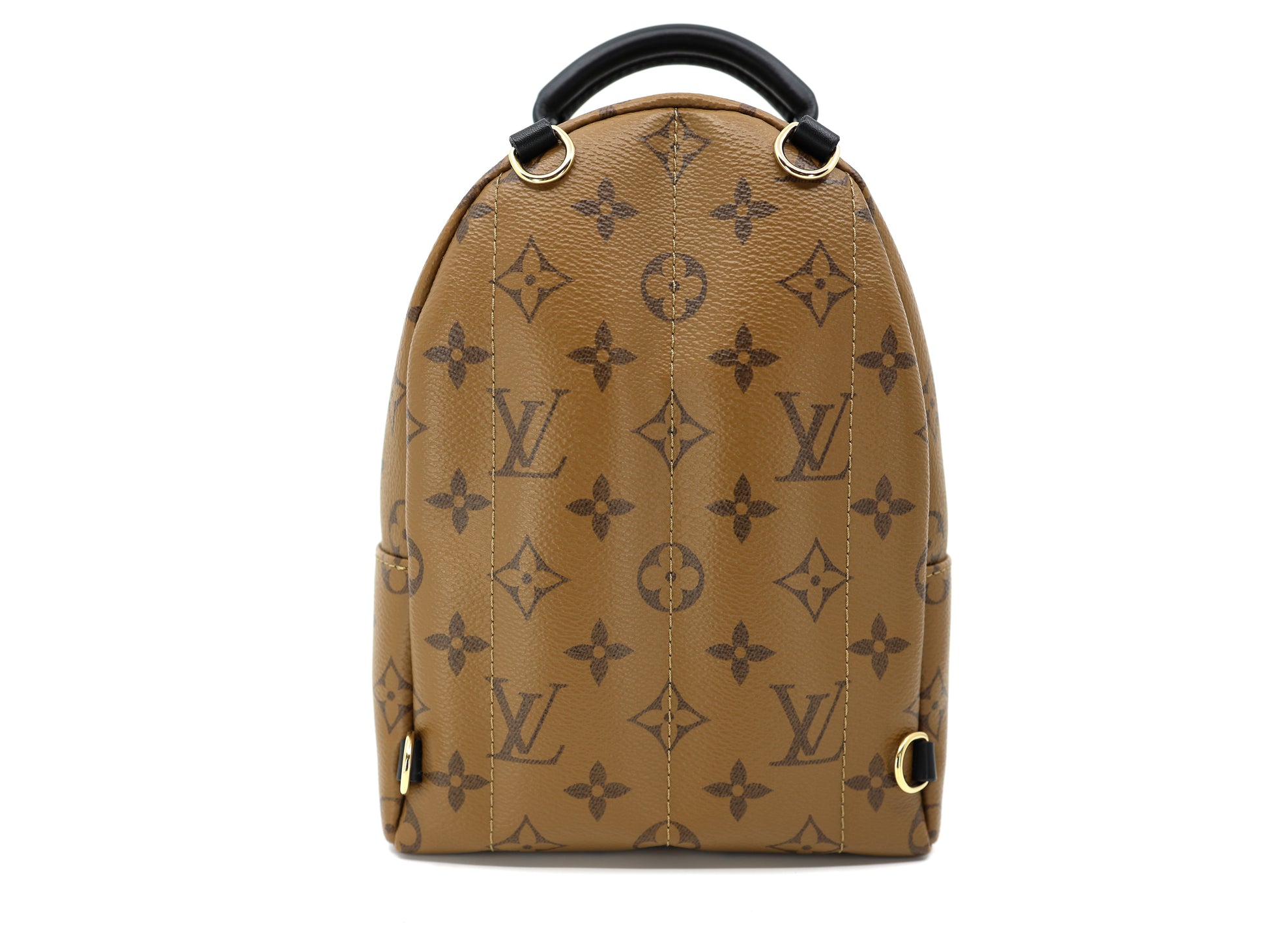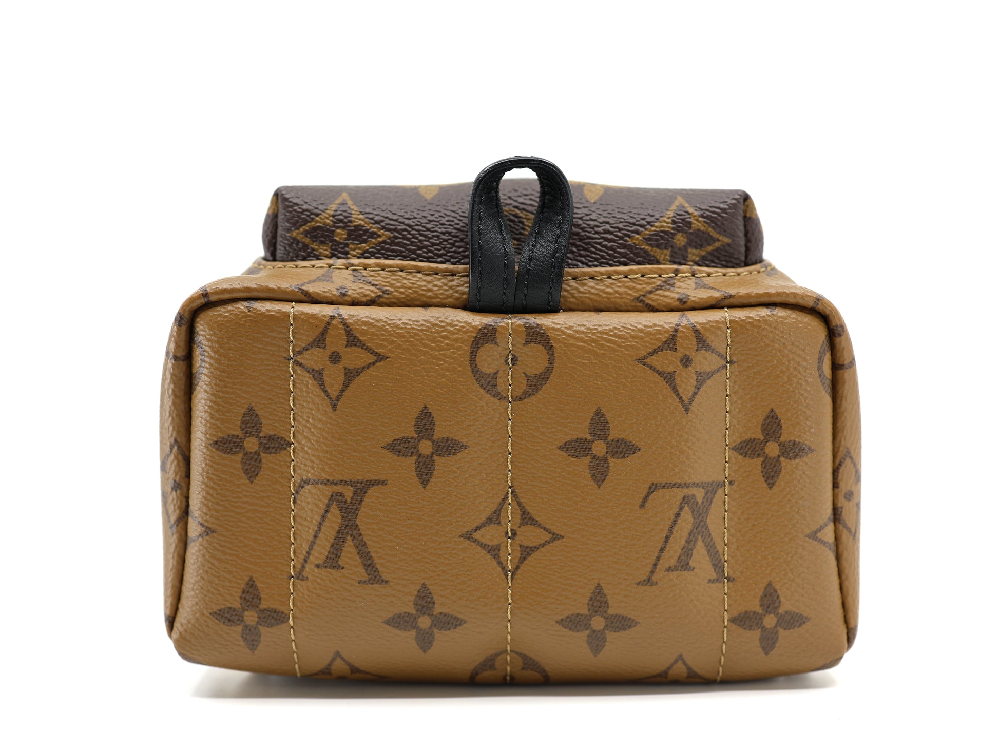 Experience luxury with the Louis Vuitton Palm Springs Reverse Monogram Backpack mini, Constructed using a combination of light and dark brown monogram coated canvas.. The backpack features sleek black cowhide leather trim and a padded top handle, as well as long adjustable shoulder straps and a front zipper pocket with tabs. Unzip the wrap-around closure to reveal a spacious black fabric interior with a convenient patch pocket.