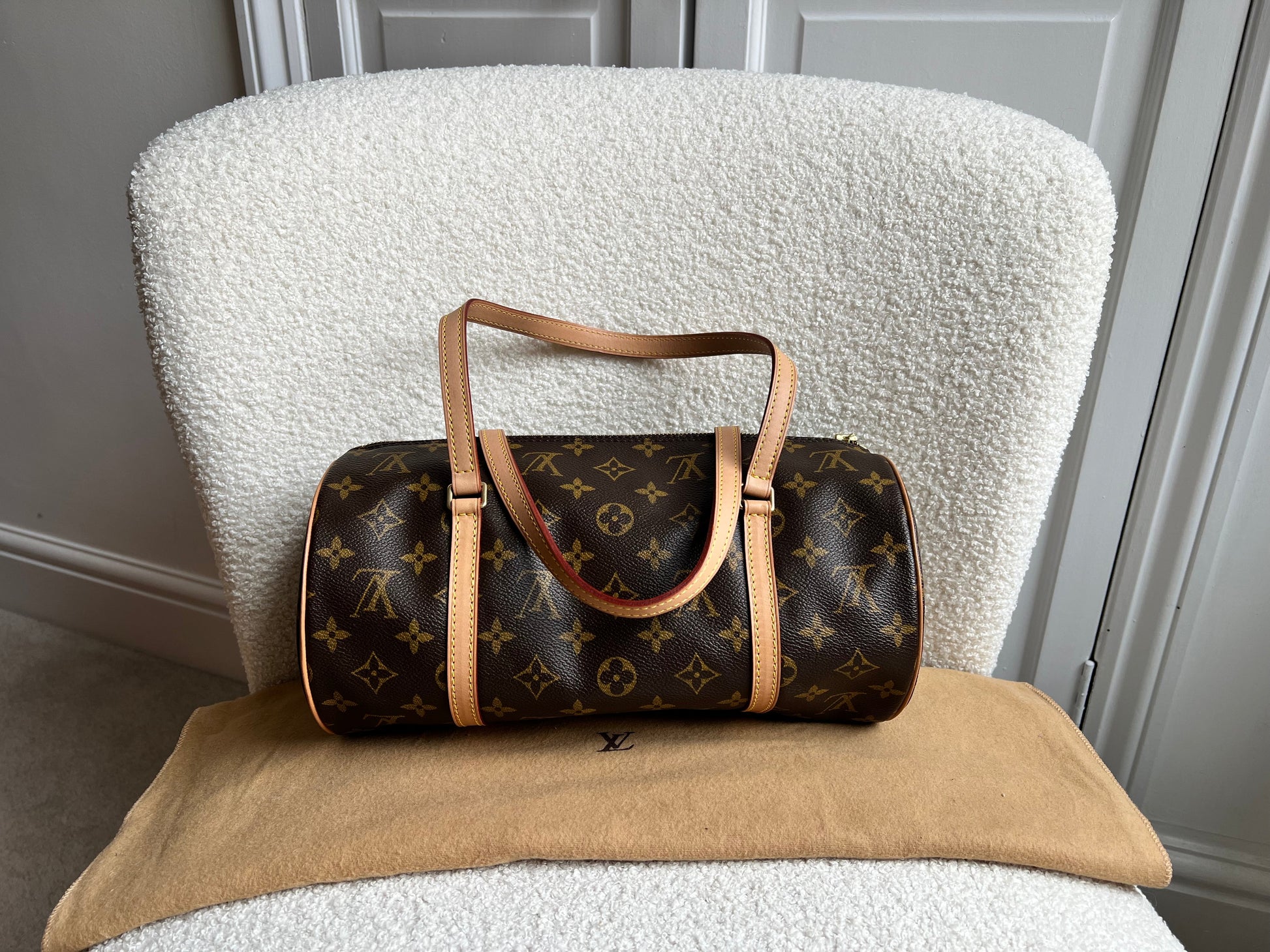 Louis Vuitton Papillon 30 Monogram. This cute bowling style bag is perfect as a grab bag for day to day use. Featuring zipper closure and two top handles and natural leather trim. Can be carried in the crook of the arm, by hand or over shoulder.