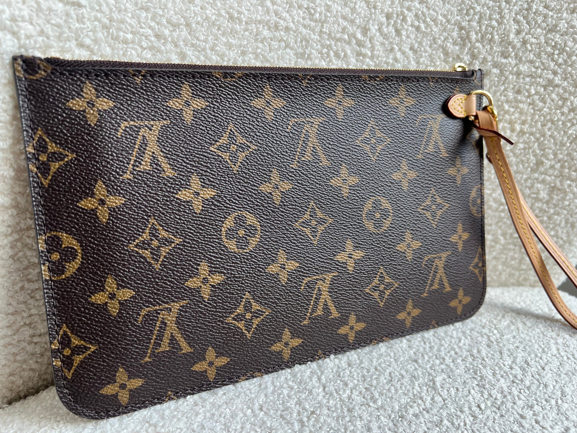 Louis Vuitton Pouch in Monogram with beige interior. This handy pouch comes with the Neverfull MM. Zip top closure, can be used as a clutch, or attached to the inside of a bag using the short strap.