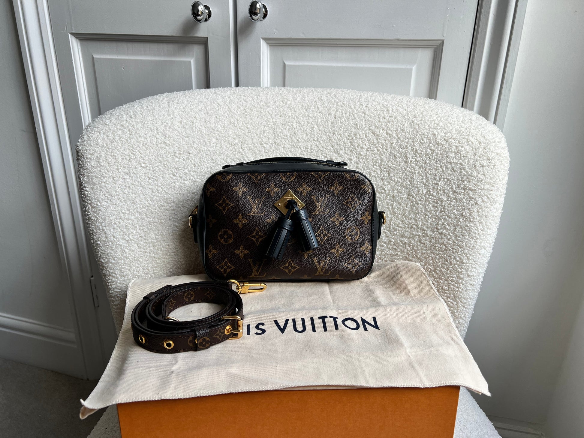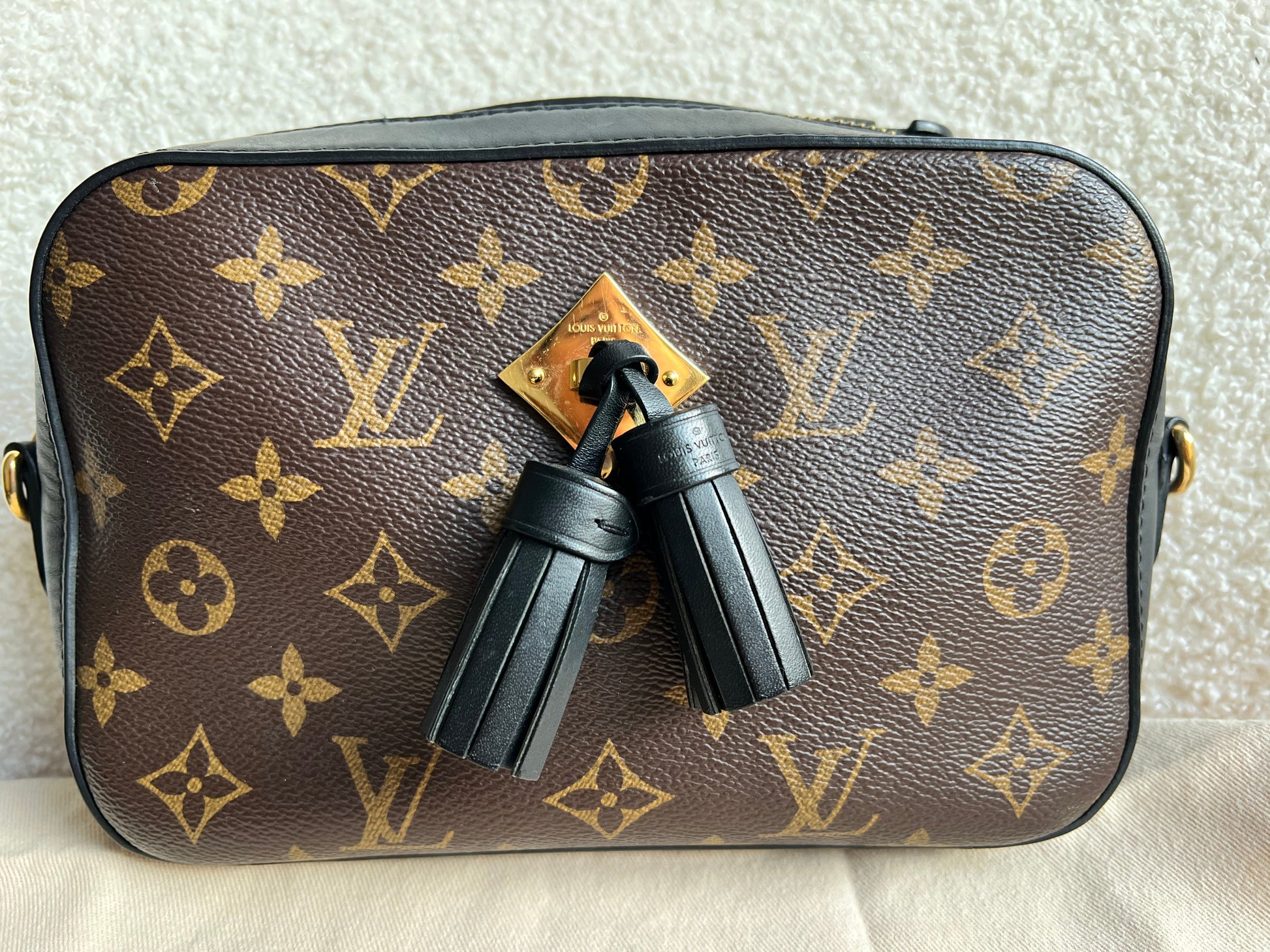 Louis Vuitton Saintonge in Black Monogram Canvas and black tan leather with gold hardware. This chic, practical, camera style bag has a compact structure and is perfect for day to day wear for carrying the essentials. Featuring a zip closure to secure your belongings, it can be worn over shoulder or cross body using the detachable long monogram strap. Can also be carried by hand using the top handle. Now discontinued, this style is highly sought after.