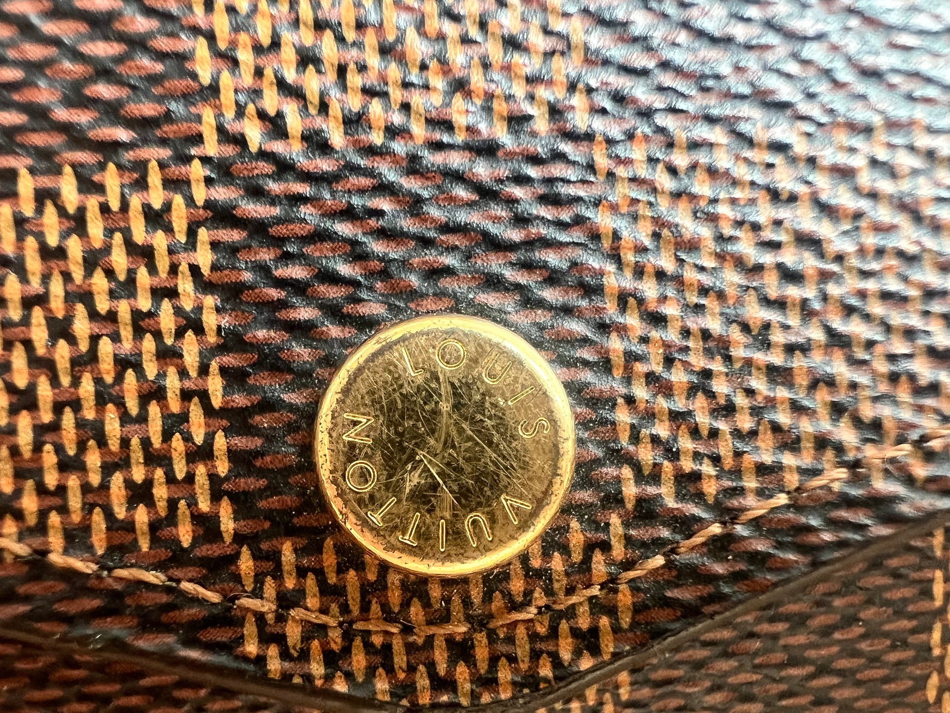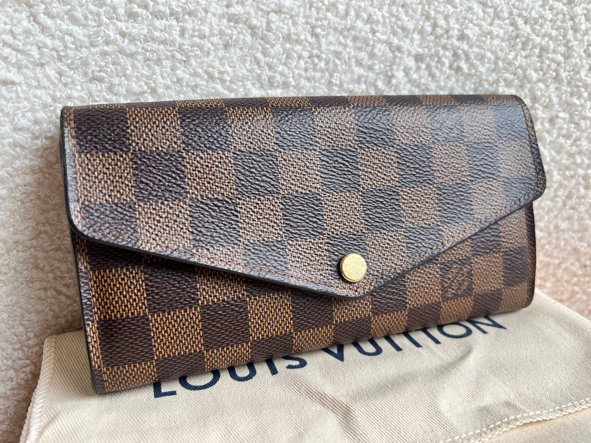 Louis Vuitton Sarah Wallet in Damier Ebene Canvas with Rose Ballerine interior. One of Louis Vuitton's classic models, the Sarah Wallet combines Monogram canvas with a grained leather lining. Its elegant envelope-style design conceals a spacious interior with two large compartments, a central zipped coin pocket and multiple card slots. The perfect choice to keep all essentials in one safe place.