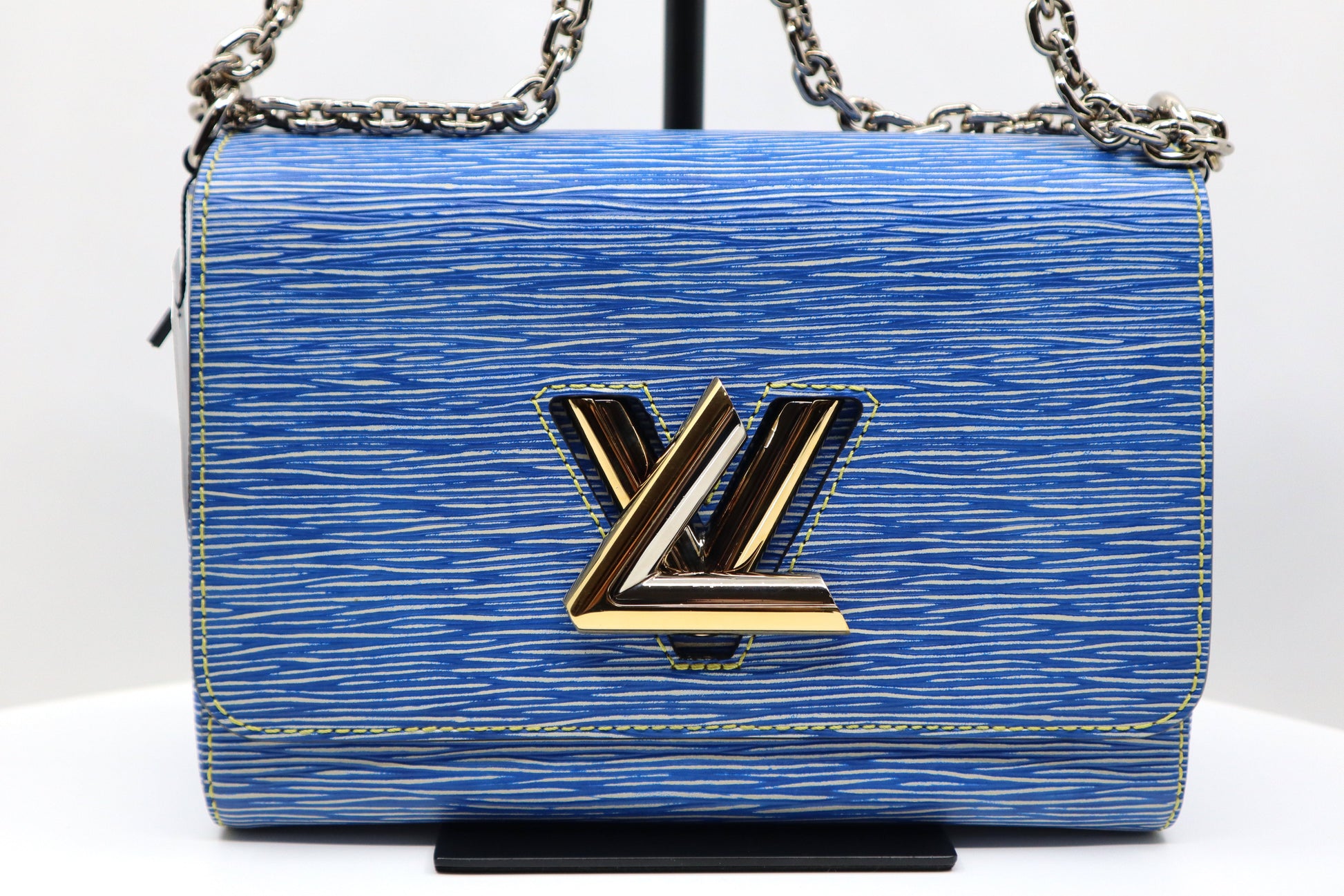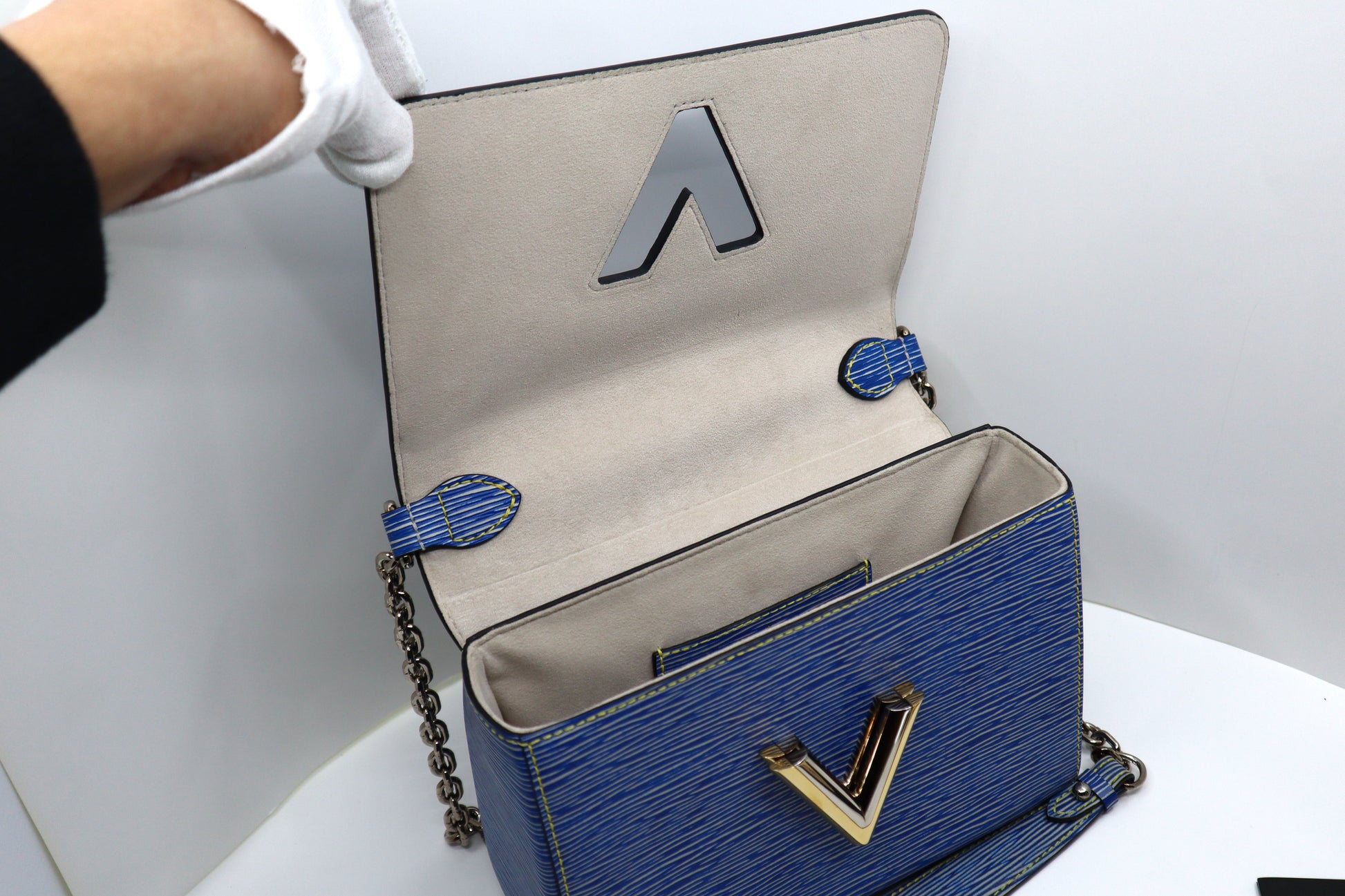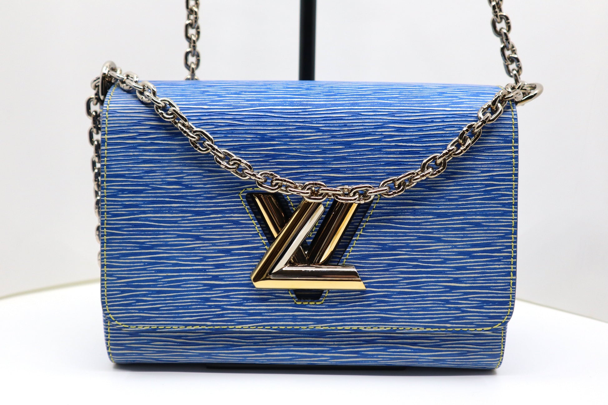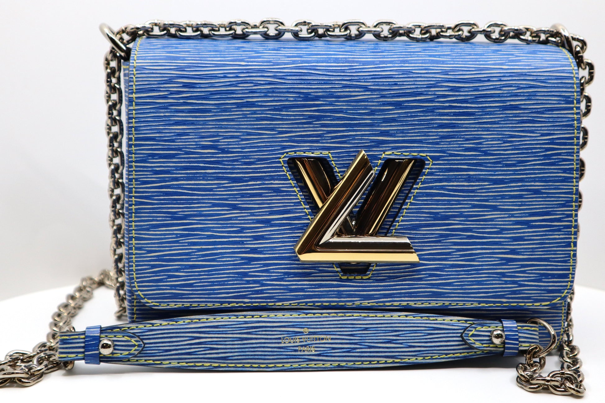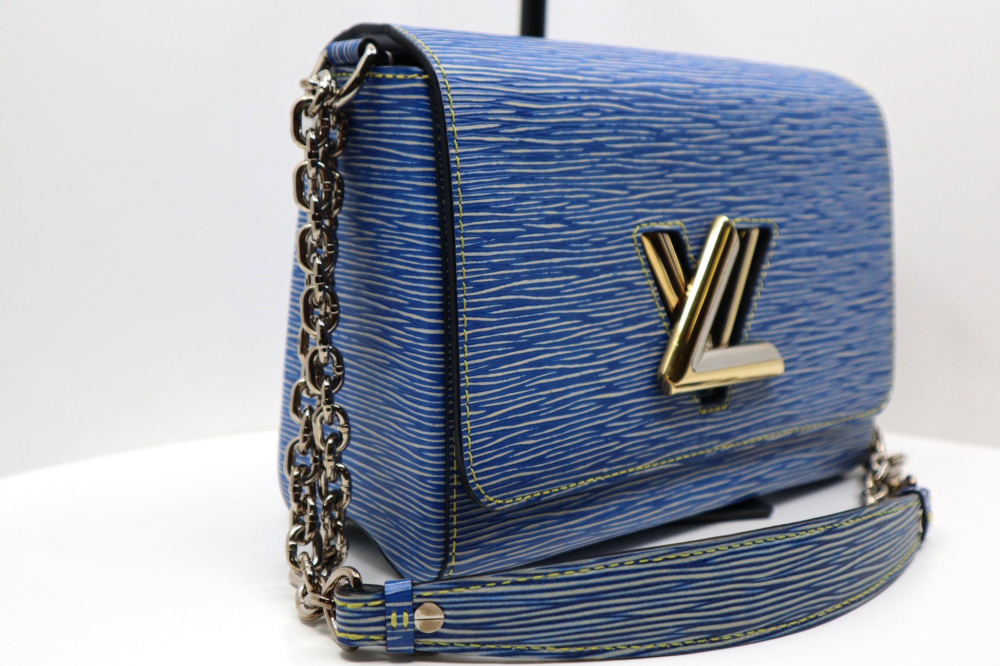 This is an preloved Louis Vuitton Twist MM in Denim Blue Epi Leather.