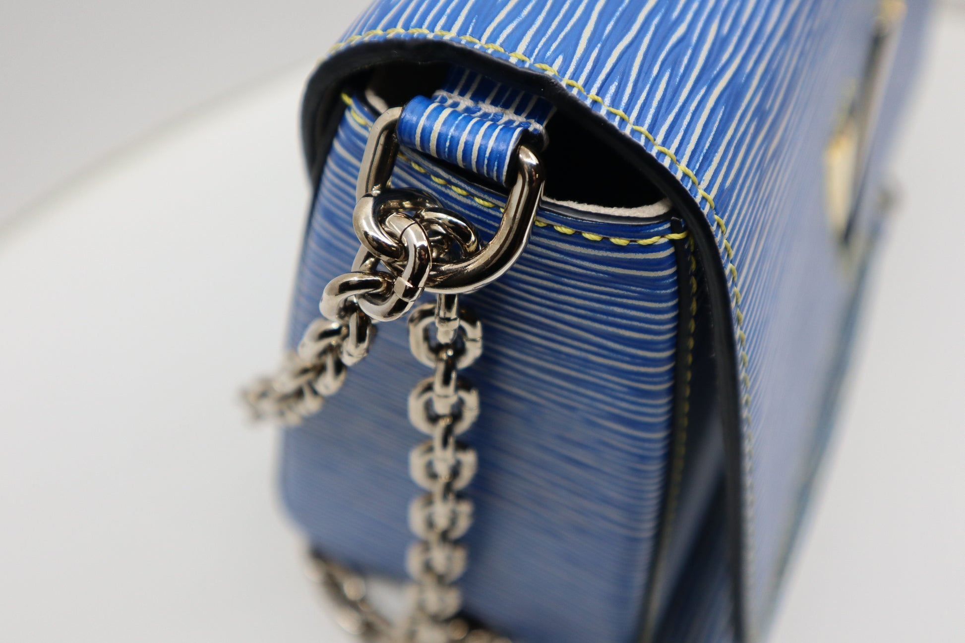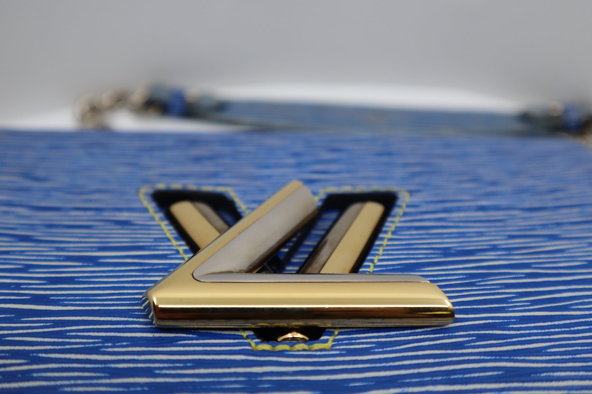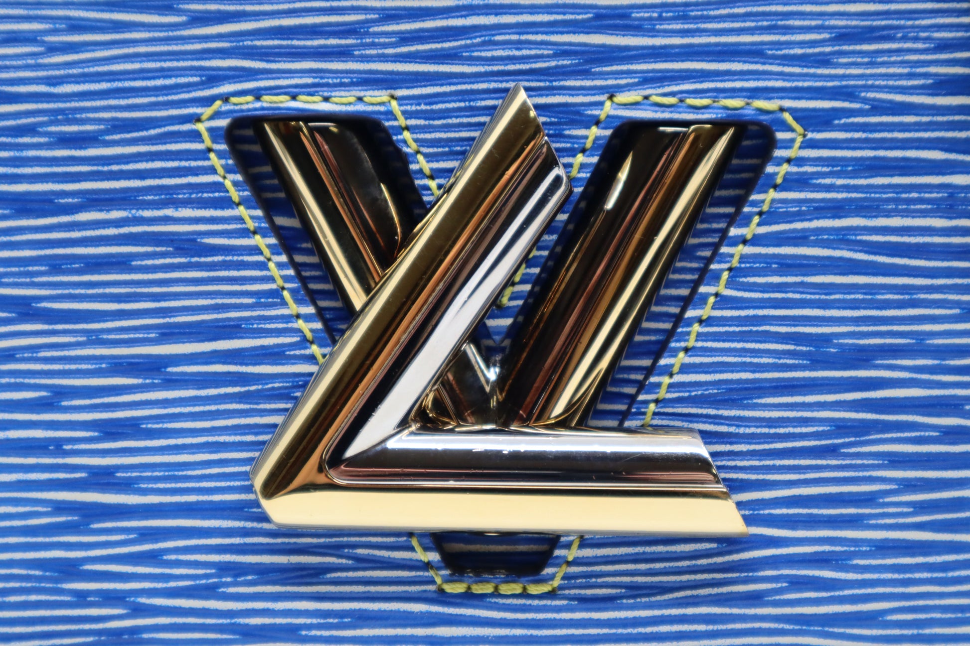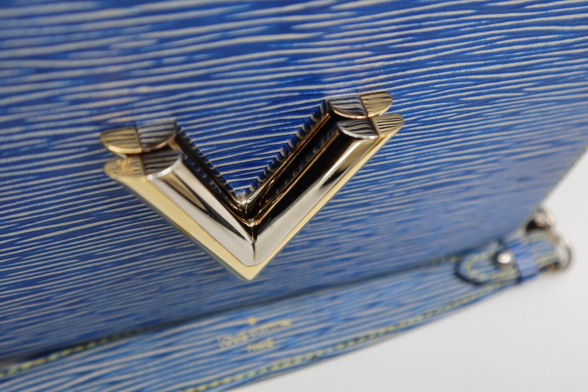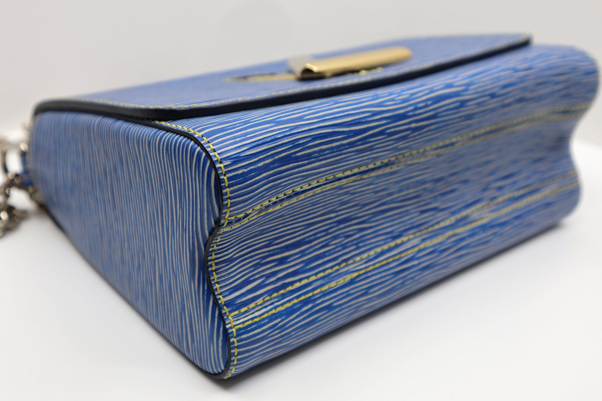 This is an preloved Louis Vuitton Twist MM in Denim Blue Epi Leather.