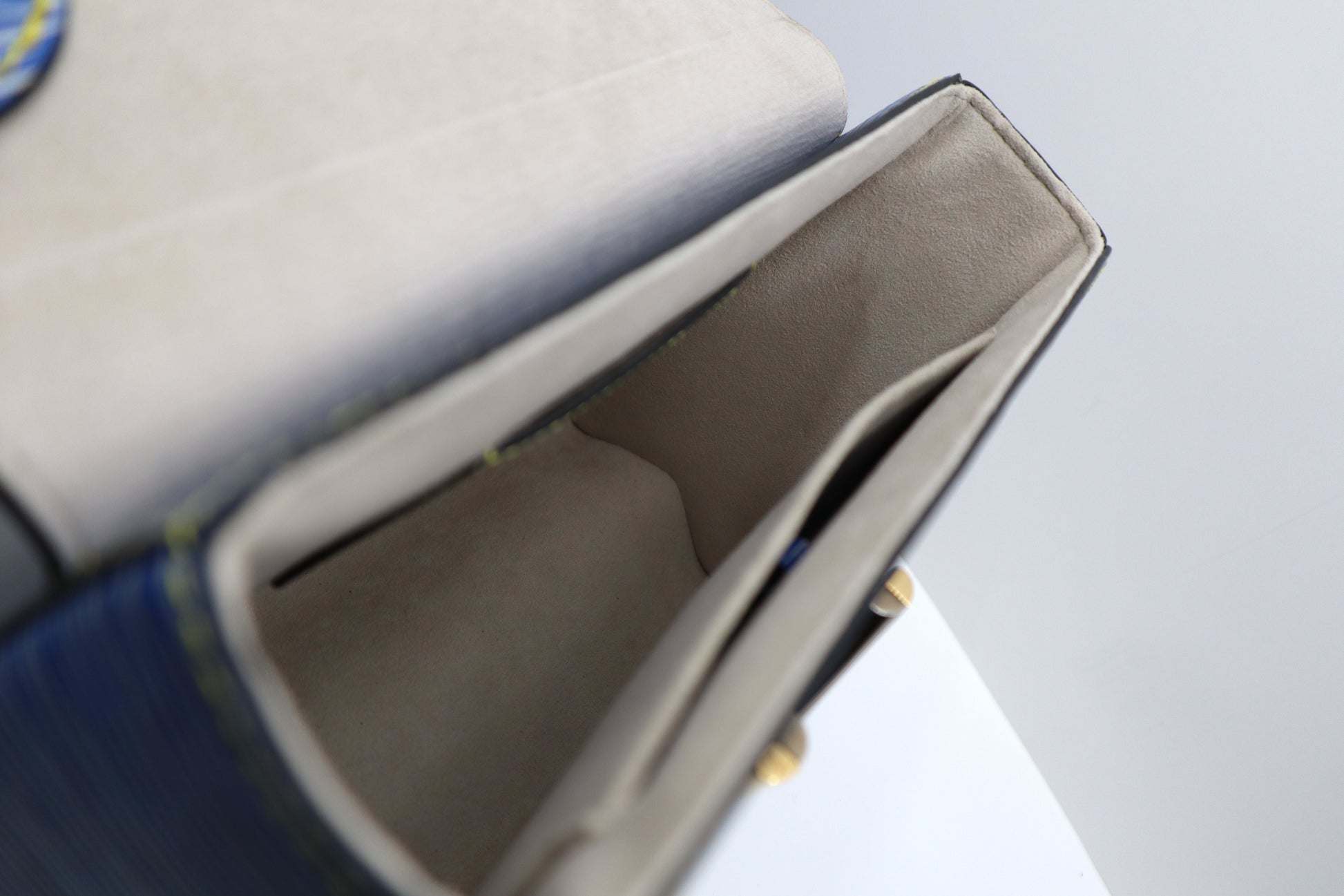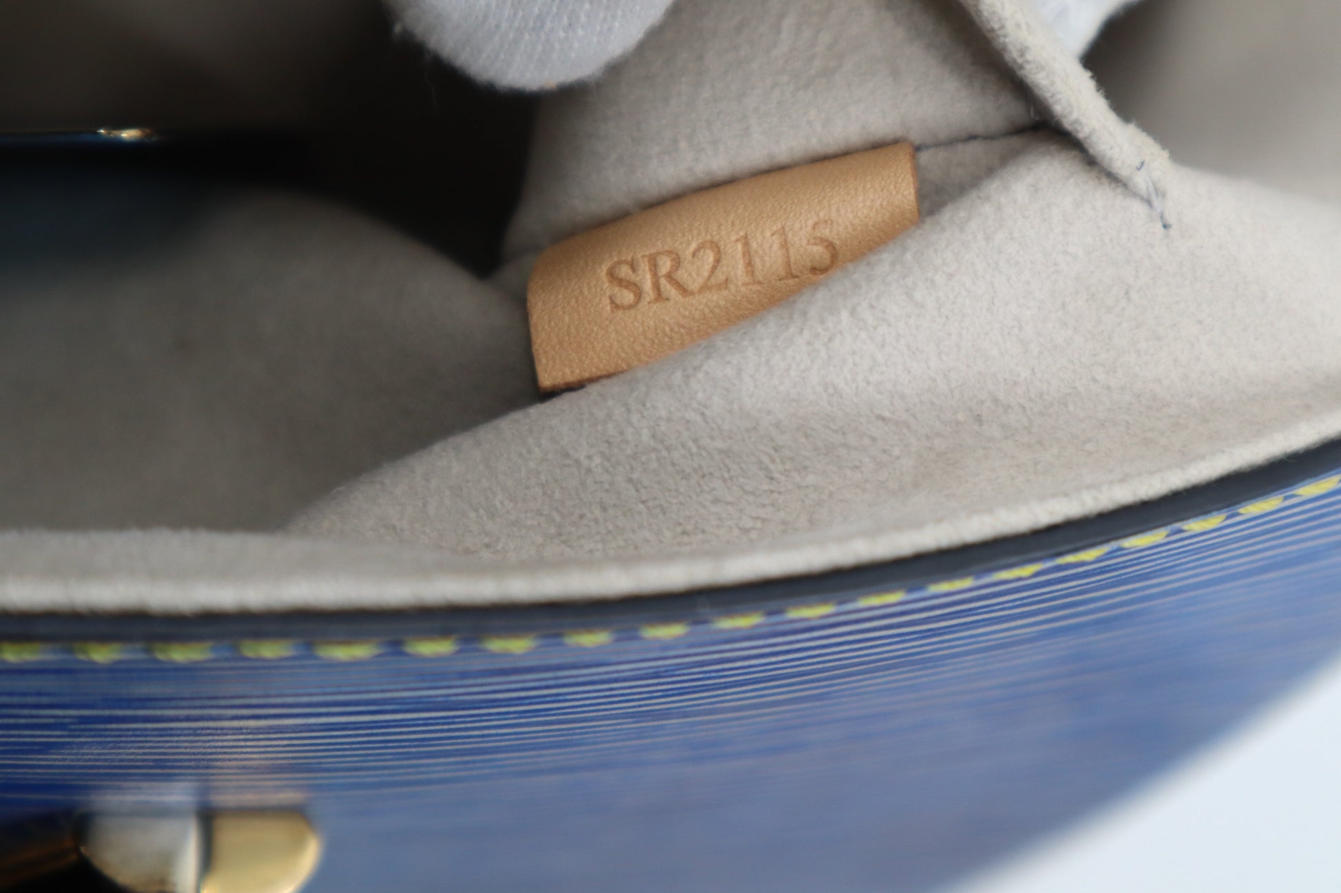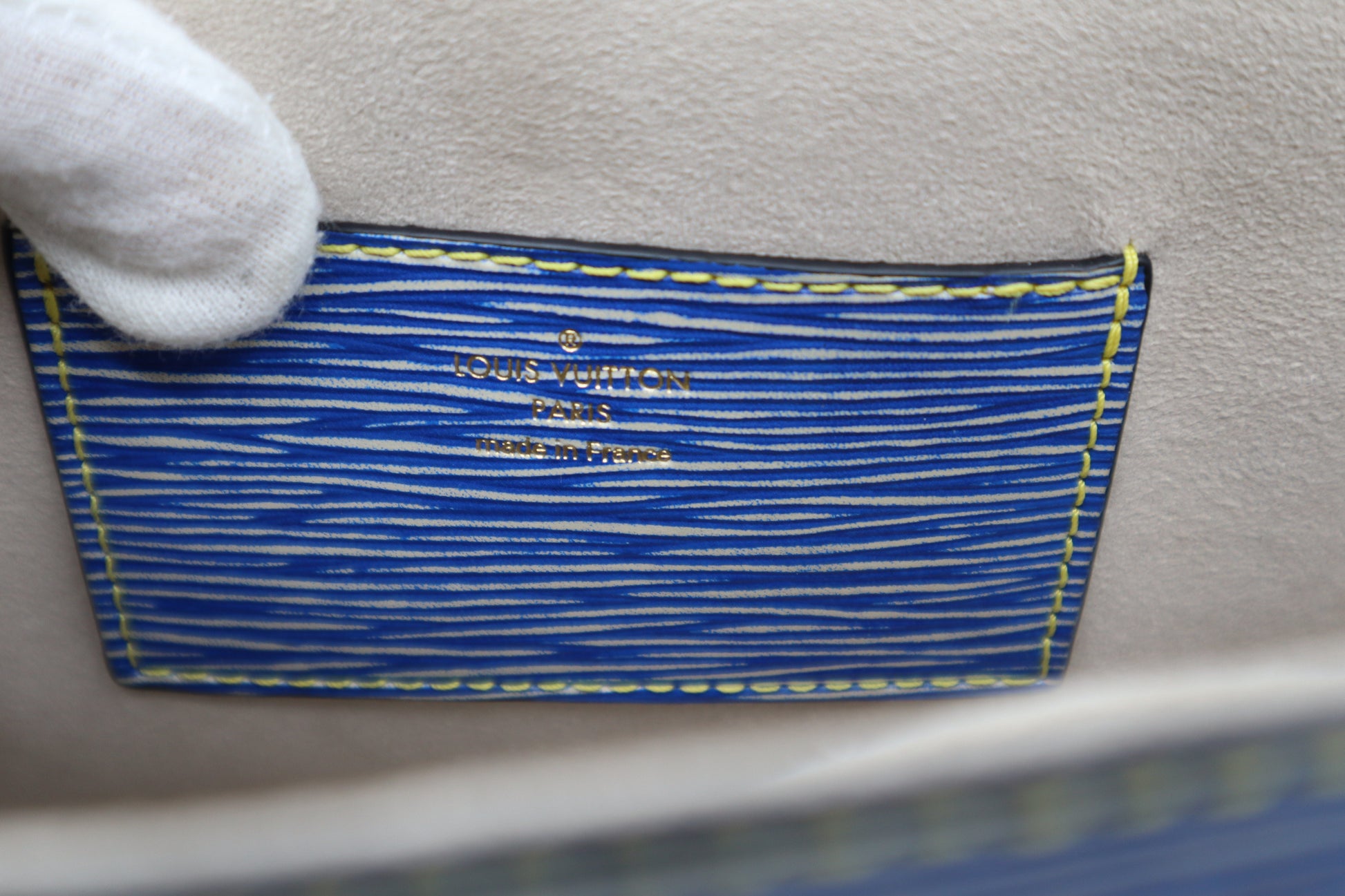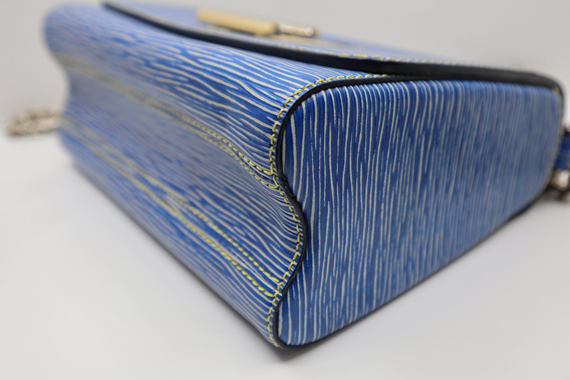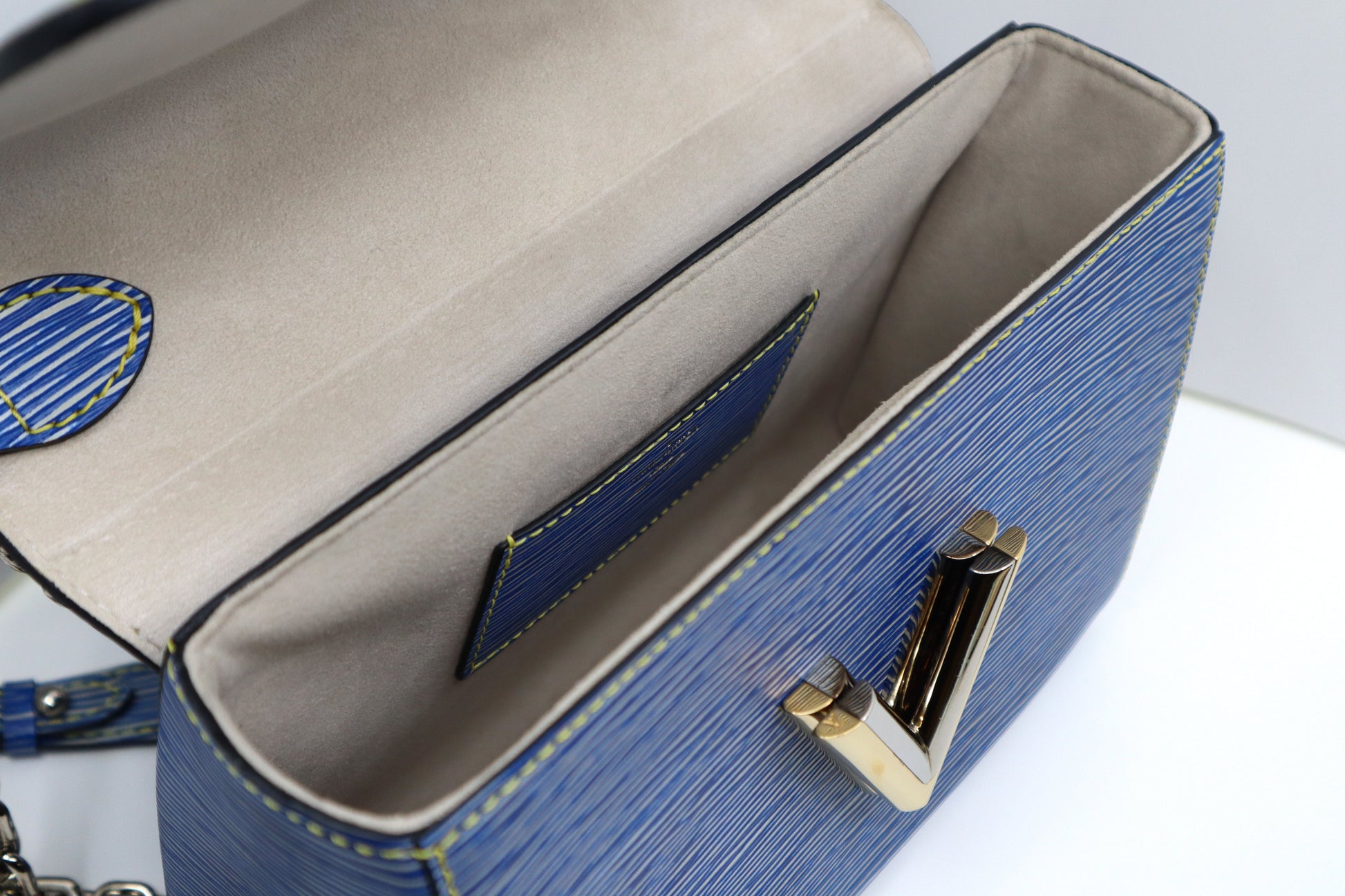 This is an preloved Louis Vuitton Twist MM in Denim Blue Epi Leather.