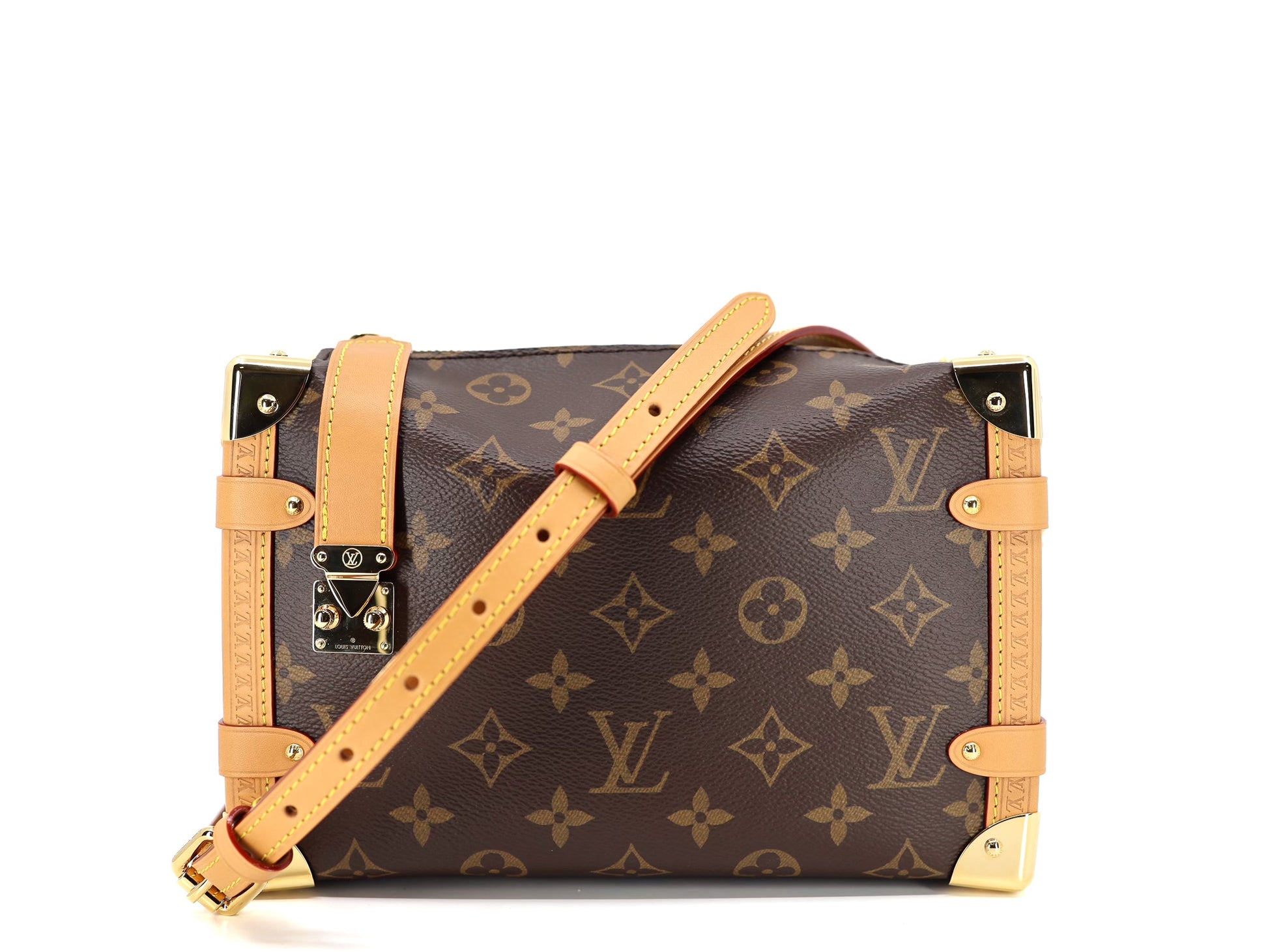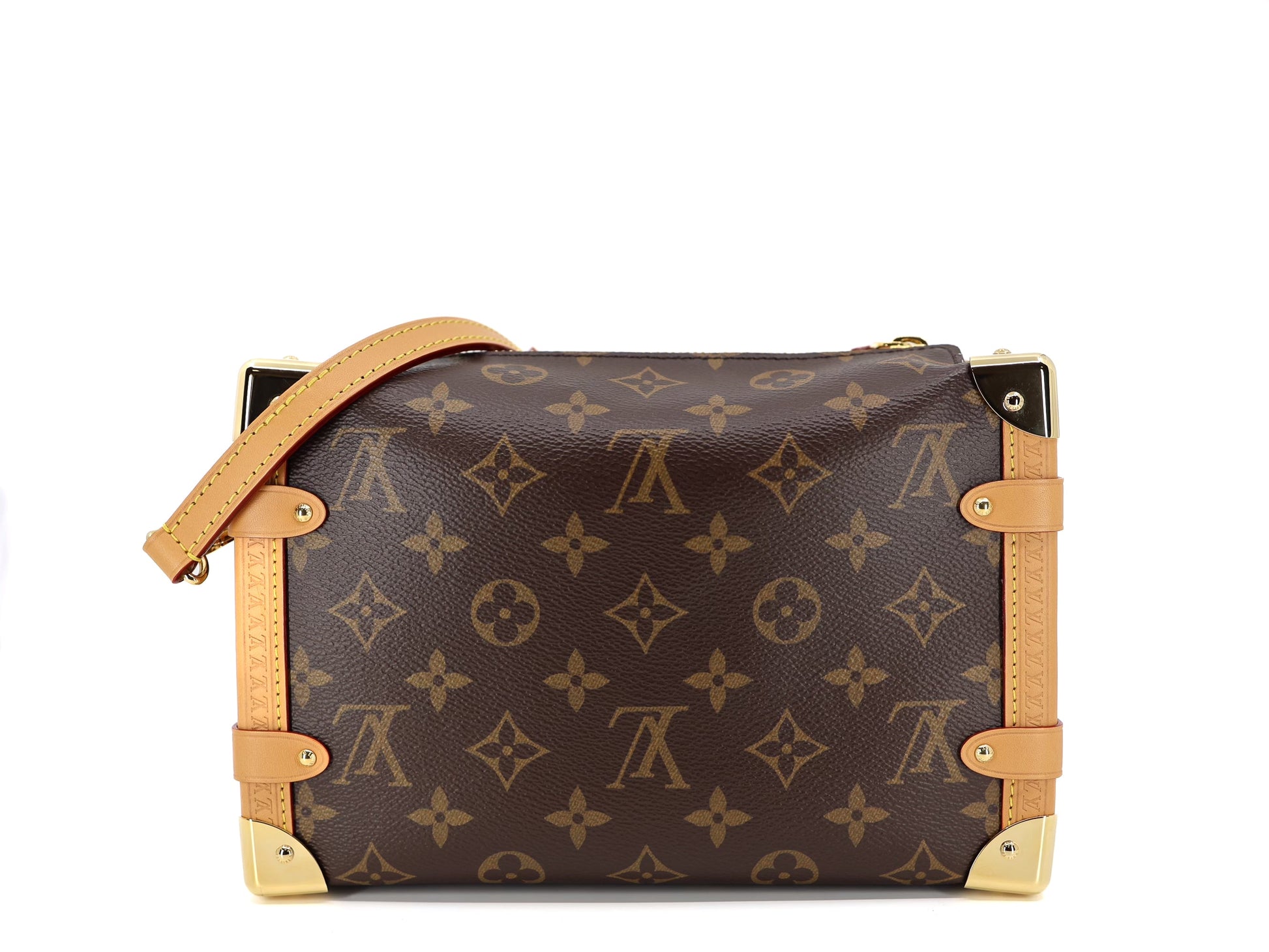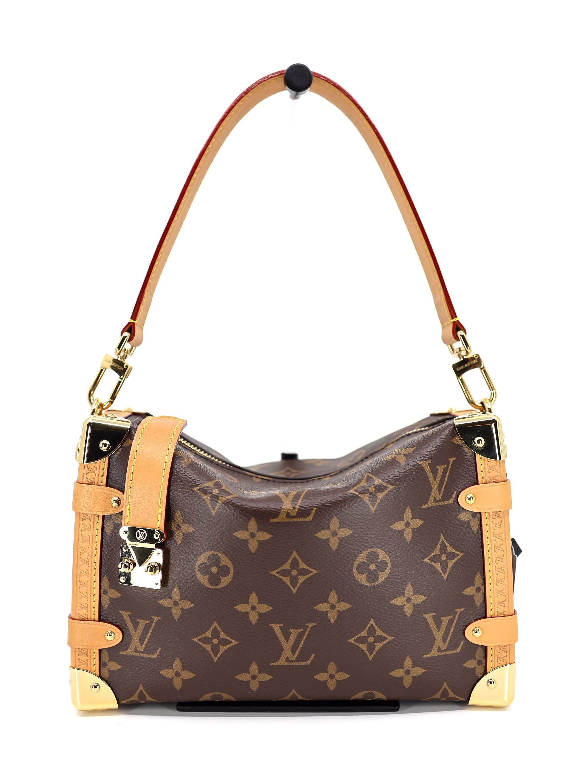 Created by Nicolas Ghesquière, the Side Trunk MM handbag combines Monogram canvas and leather trim, paying homage to the House's trunkmaking origins. The iconic S-lock and reinforced metallic corners adorn the unique leather zip tab. Both the wide top handle and thin leather shoulder strap can be detached for versatility.