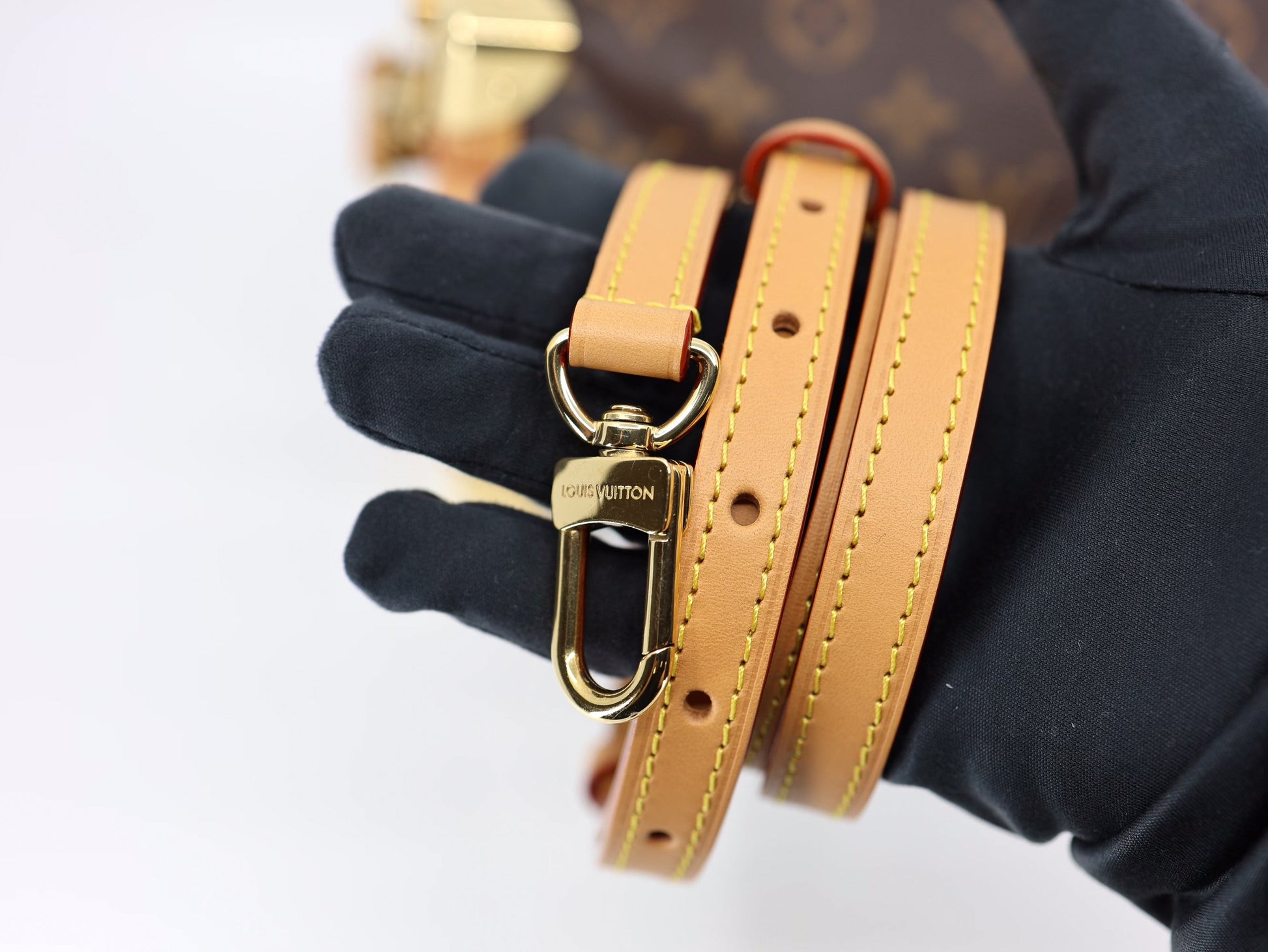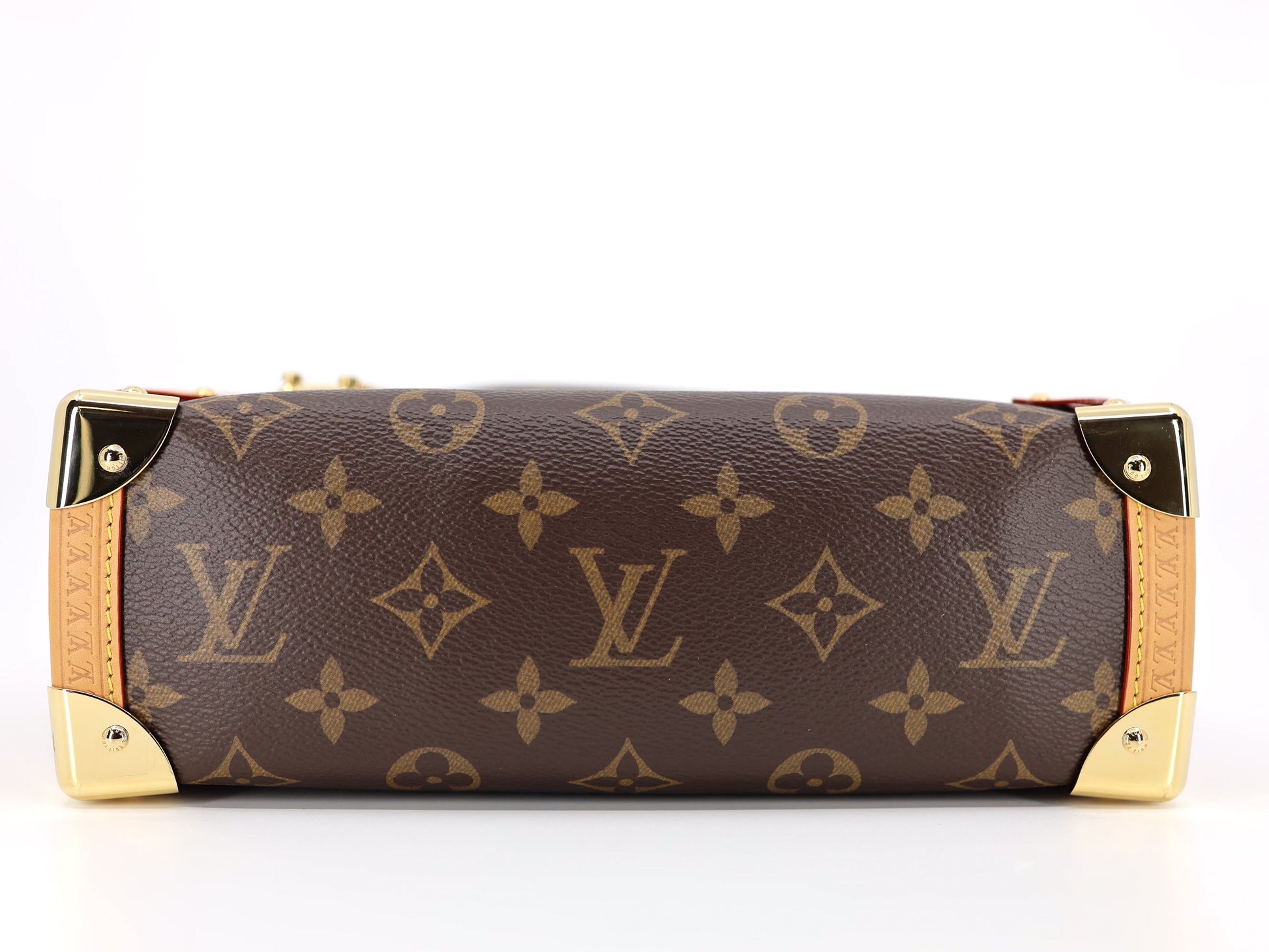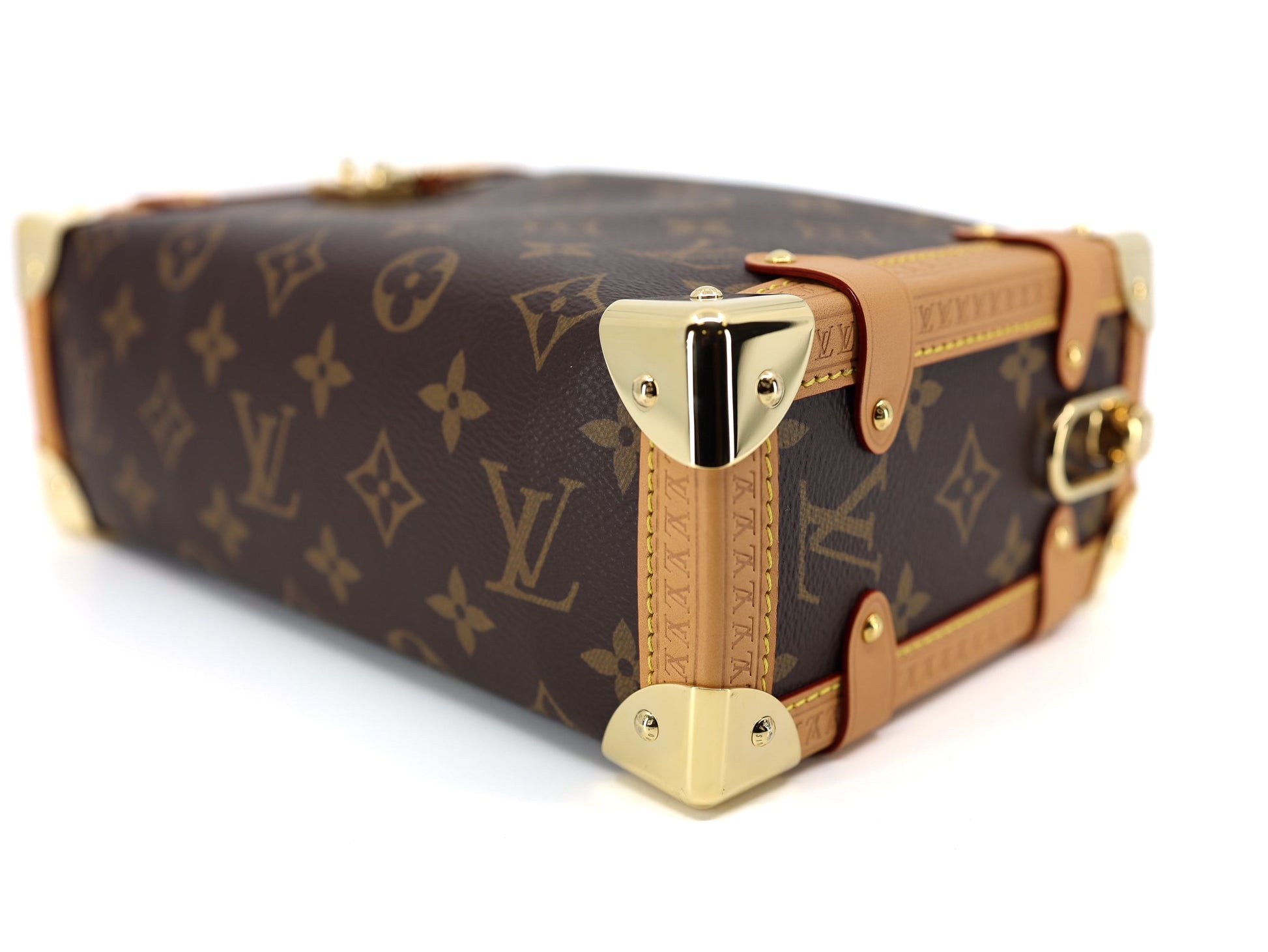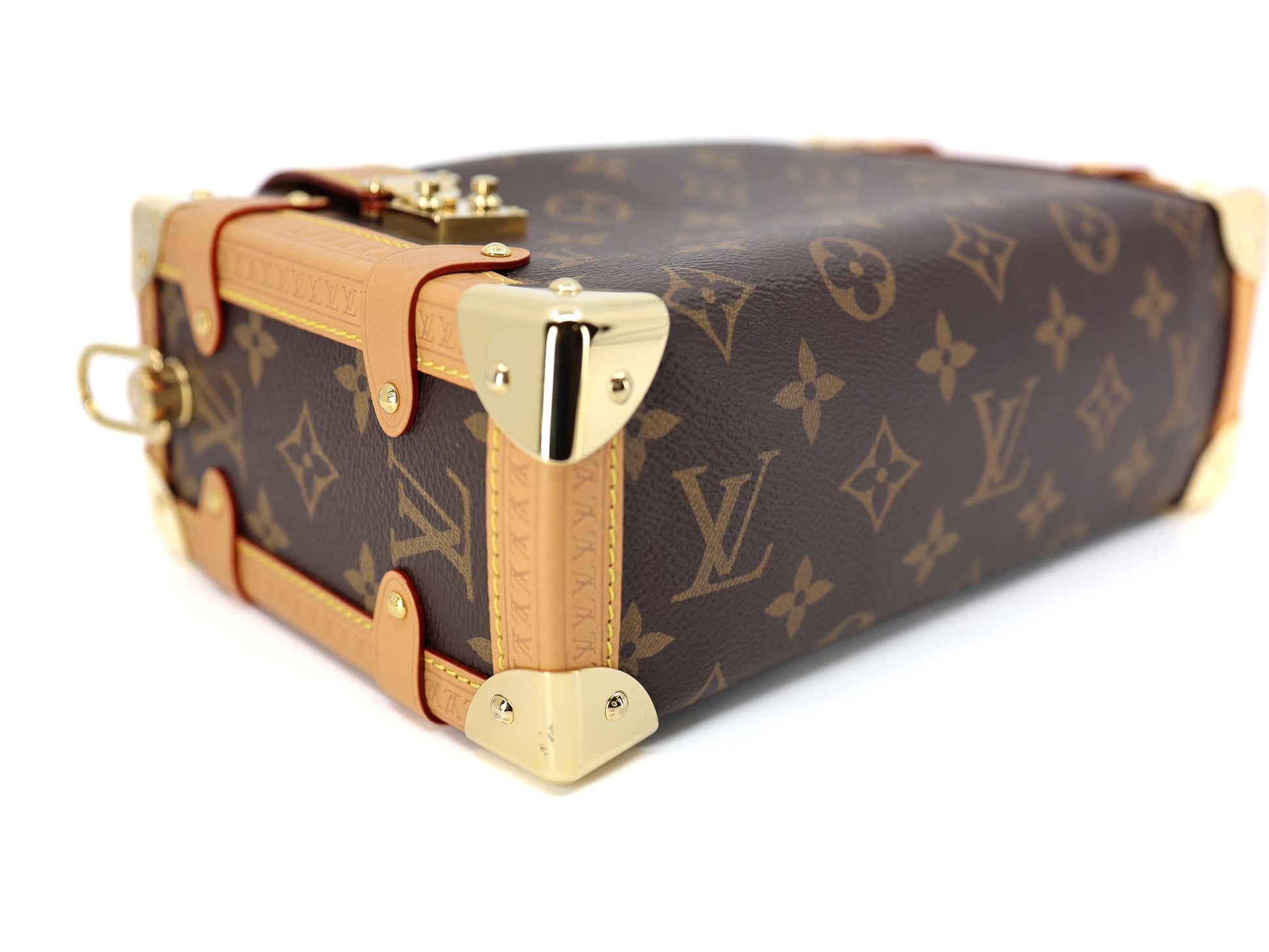 Created by Nicolas Ghesquière, the Side Trunk MM handbag combines Monogram canvas and leather trim, paying homage to the House's trunkmaking origins. The iconic S-lock and reinforced metallic corners adorn the unique leather zip tab. Both the wide top handle and thin leather shoulder strap can be detached for versatility.