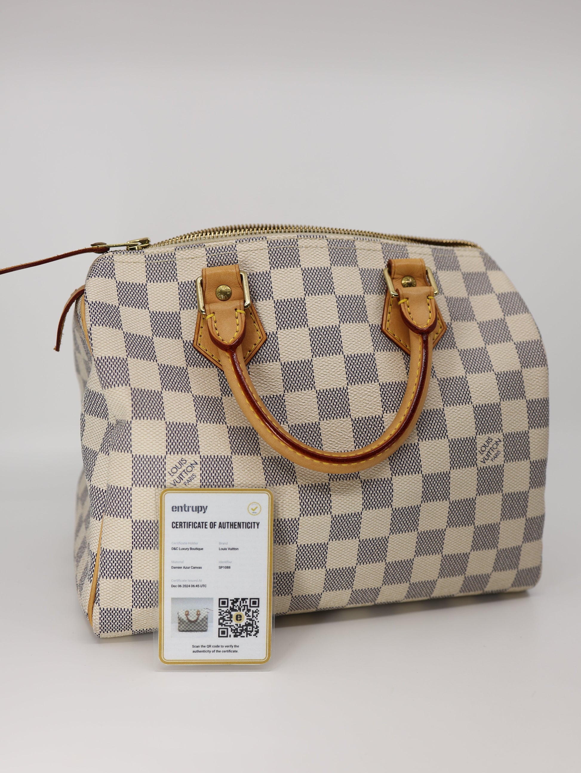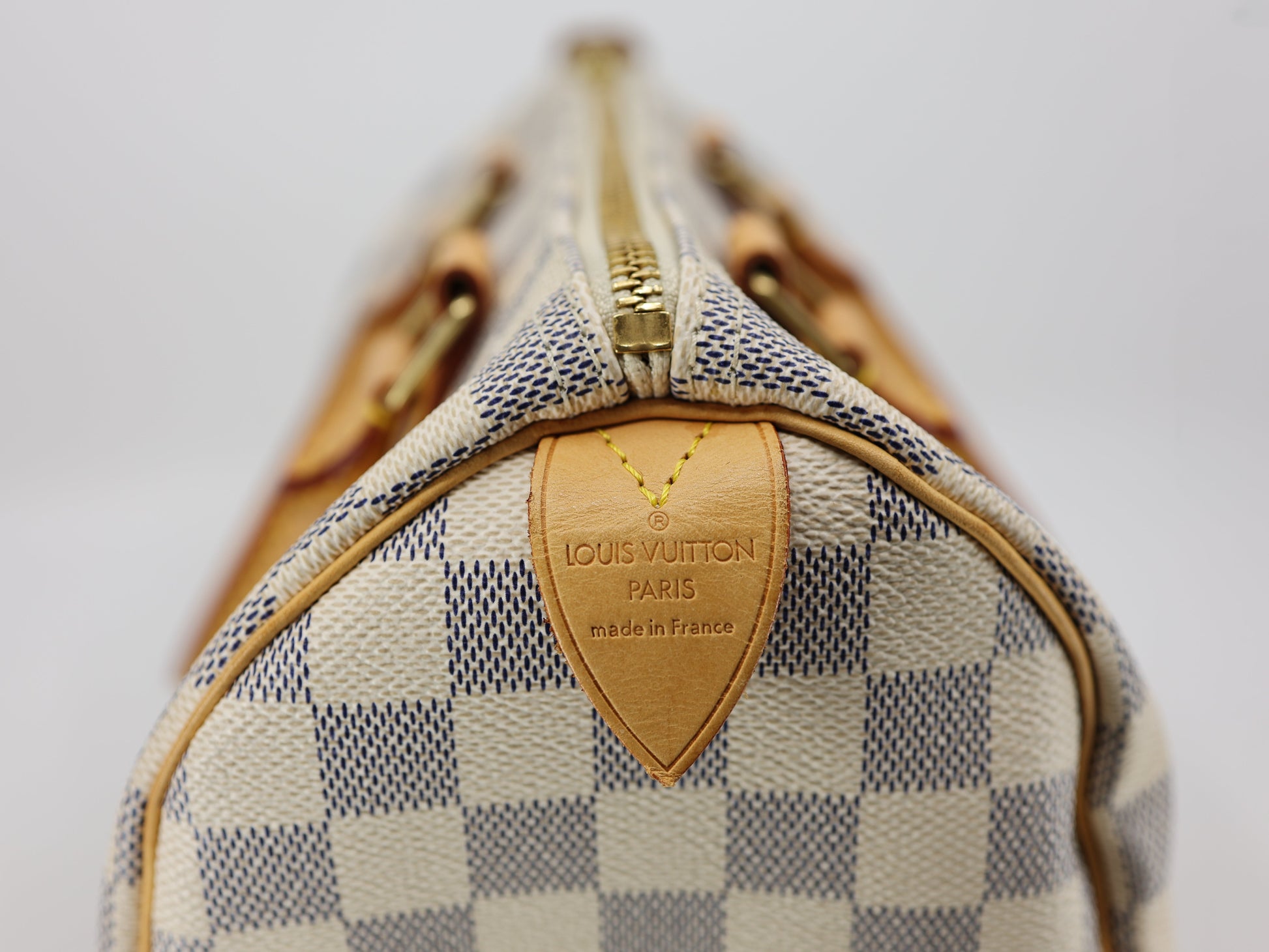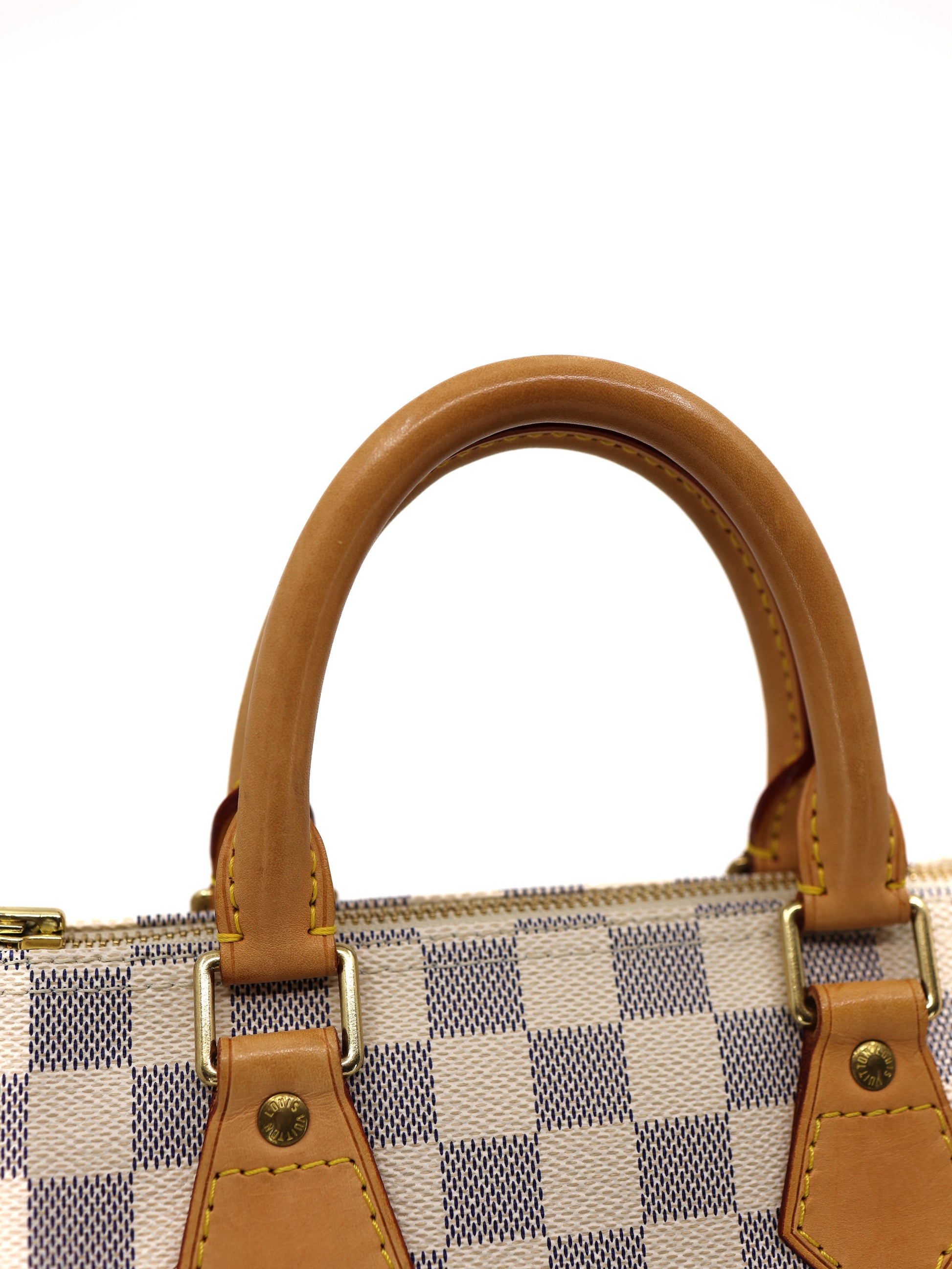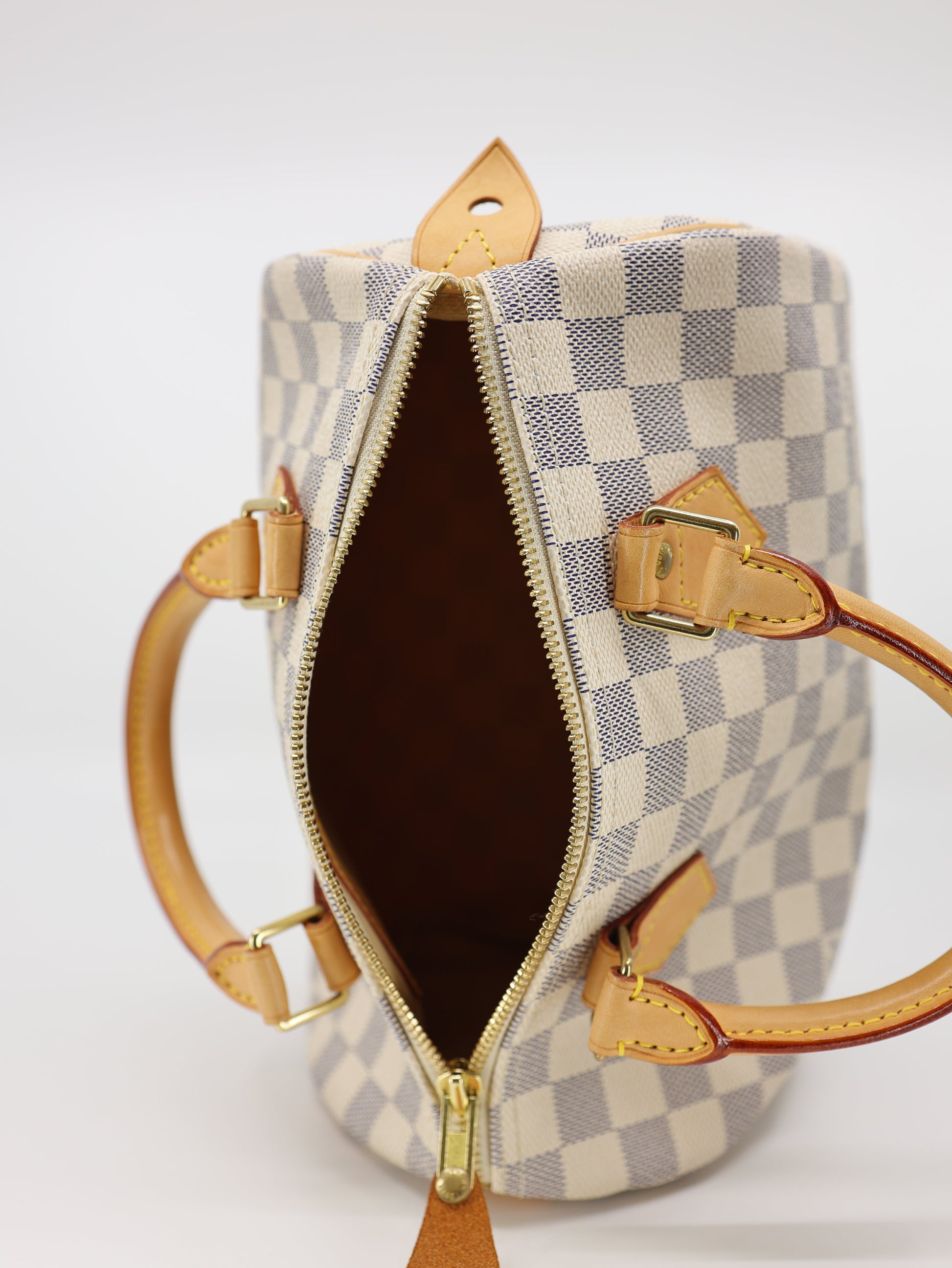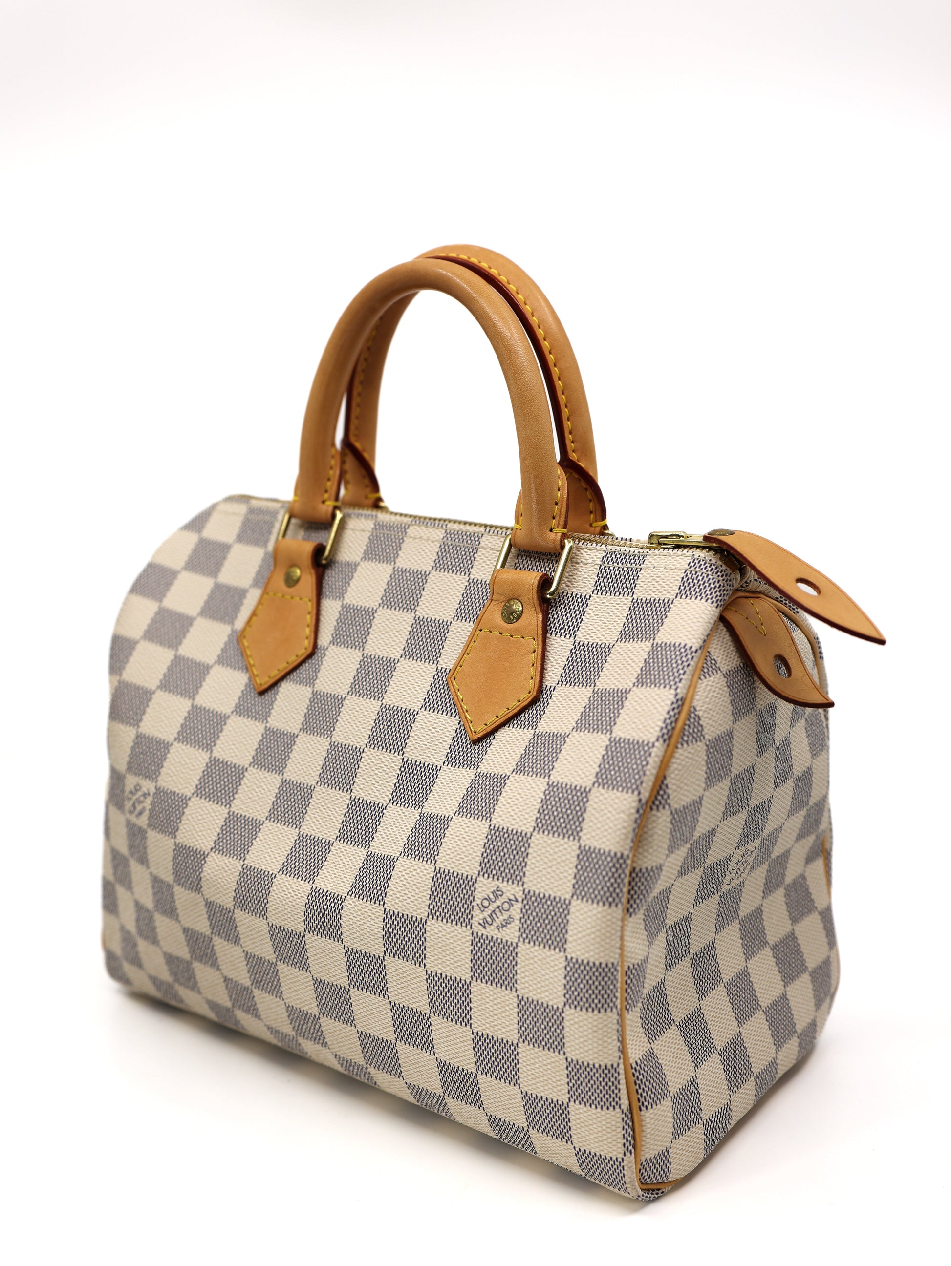 Experience timeless style and functionality with the Speedy 25 handbag in Damier Azur canvas, perfect for summertime in any city. Originally designed for travelers in the 1930s, its iconic shape and rolled leather handles make it a must-have. The Damier Azur coated canvas and smooth cowhide-leather trim are complemented by a textile lining and gold-color hardware. Featuring a double zip, padlock, and inside flat pocket, it can fit your essentials such as a smartphone, wallet, keys, and more.