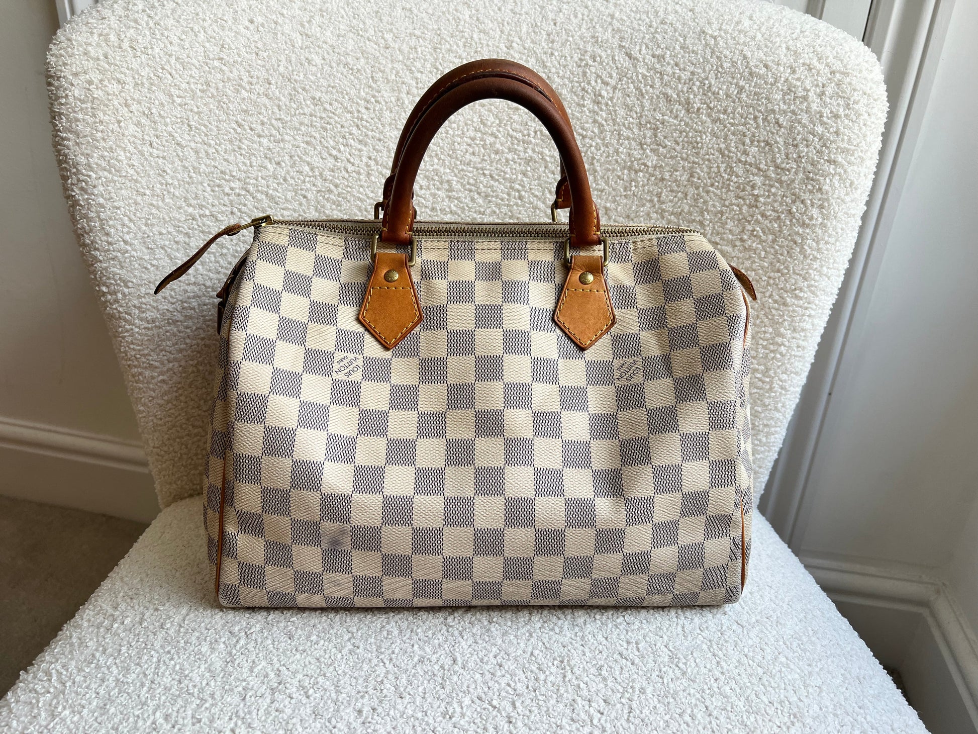 Louis Vuitton Speedy 30 in Damier Azur canvas with gold hardware. The classic speedy style is one of Louis Vuitton's most popular styles. This style is timeless and elegant and is perfect for day to day use. Slightly slouchy in shape, the Speedy features rolled leather handles and signature padlock and can be carried by hand or in the crook of the arm.