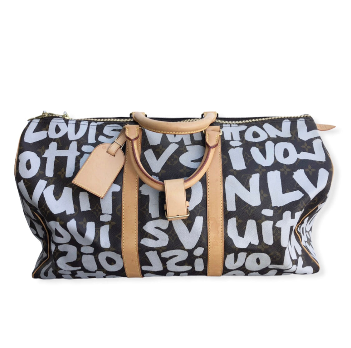A collectable piece from Louis Vuitton's Spring Summer 2001 collection, a collaboration with artist Stephen Sprouse. This Keepall 50 in classic monogram canvas features 'Louis Vuitton' written in white graffiti style throughout.