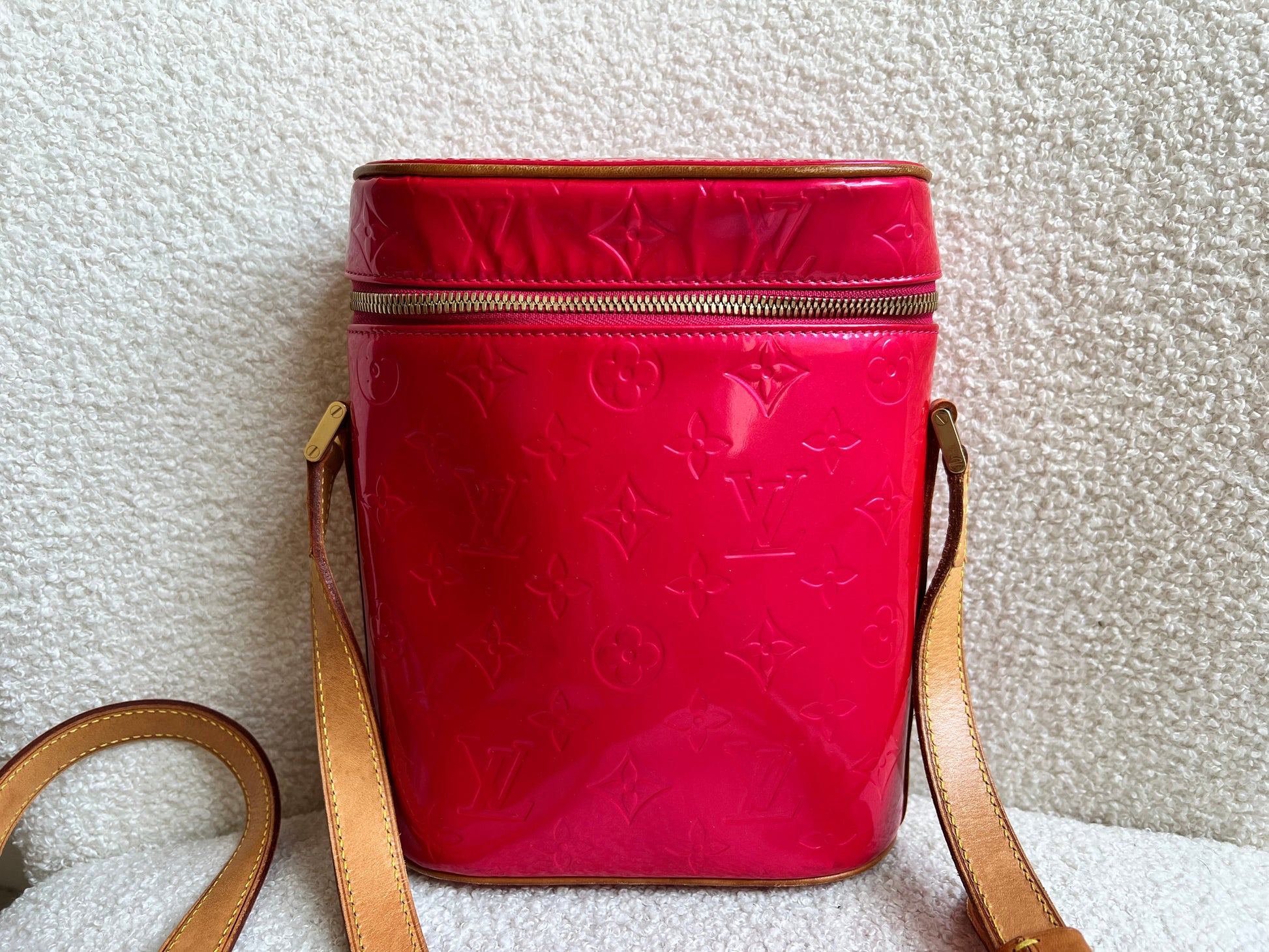 Louis Vuitton Vertical Sullivan in Fuchsia Vernis Patent Monogram Leather with gold hardware. A discontinued style by LV. Vernis translates to varnish, is patent leather embossed with the iconic Monogram and was introduced in 1998. The Sullivan is quite lightweight and has a structured cyclinder shape with a slight slouch when empty. The patent Vernis Leather has a high shine and appears to change colour in different light - the light reflects different on the leather depending on angle. Can be carried in cross body or over shoulder. Perfect colour for summer.