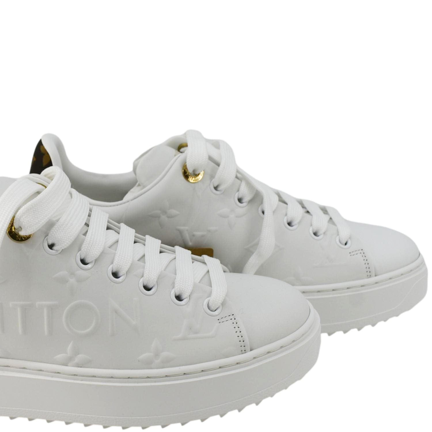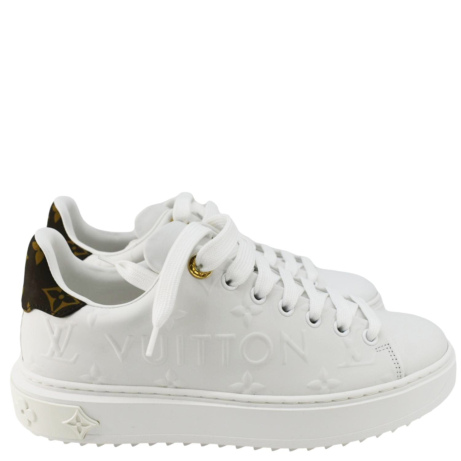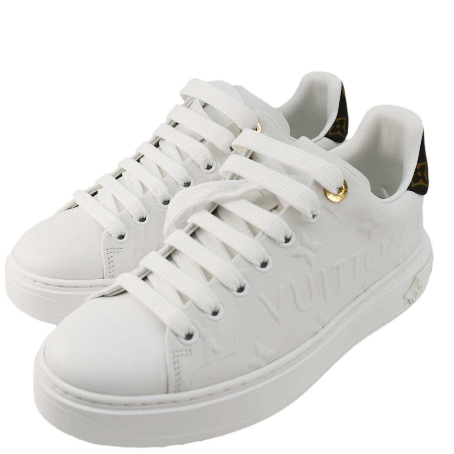 The LOUIS VUITTON Time Out Sneakers in white leather feature a sleek design with subtle Monogram accents and embossed detailing. Comfortable and stylish, they're perfect for a chic, casual look.
