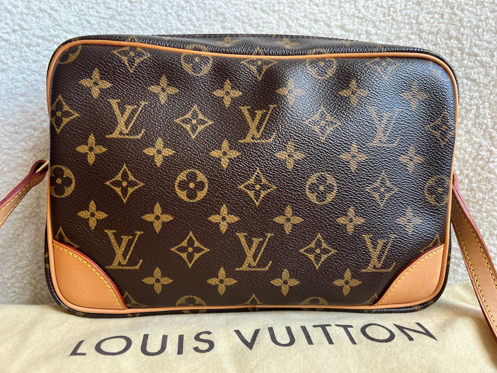 Louis Vuitton Trocadero Bag in Monogram canvas. The cross body style is medium in size and features a leather strap. Front compartment and main compartment with cowhide leather trim. Fairly structured in shape, ideal for day to day use. Can be carried over shoulder or cross body.