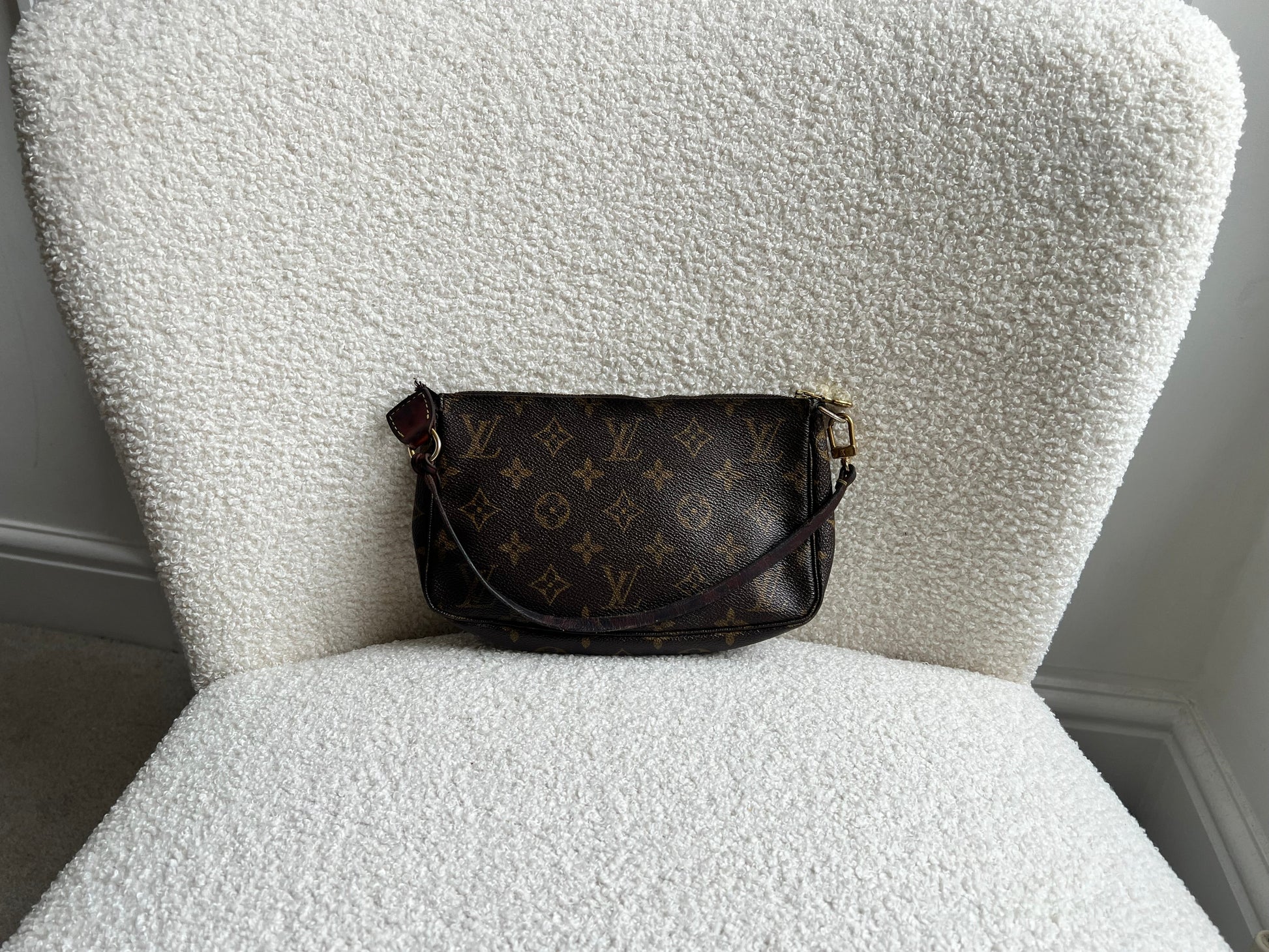 Louis Vuitton Pochette Accessoires in Monogram canvas with gold hardware. This iconic PA is highly sought after and usually sold out at LV. Carries all the daily essentials - can be carried over shoulder or by hand.