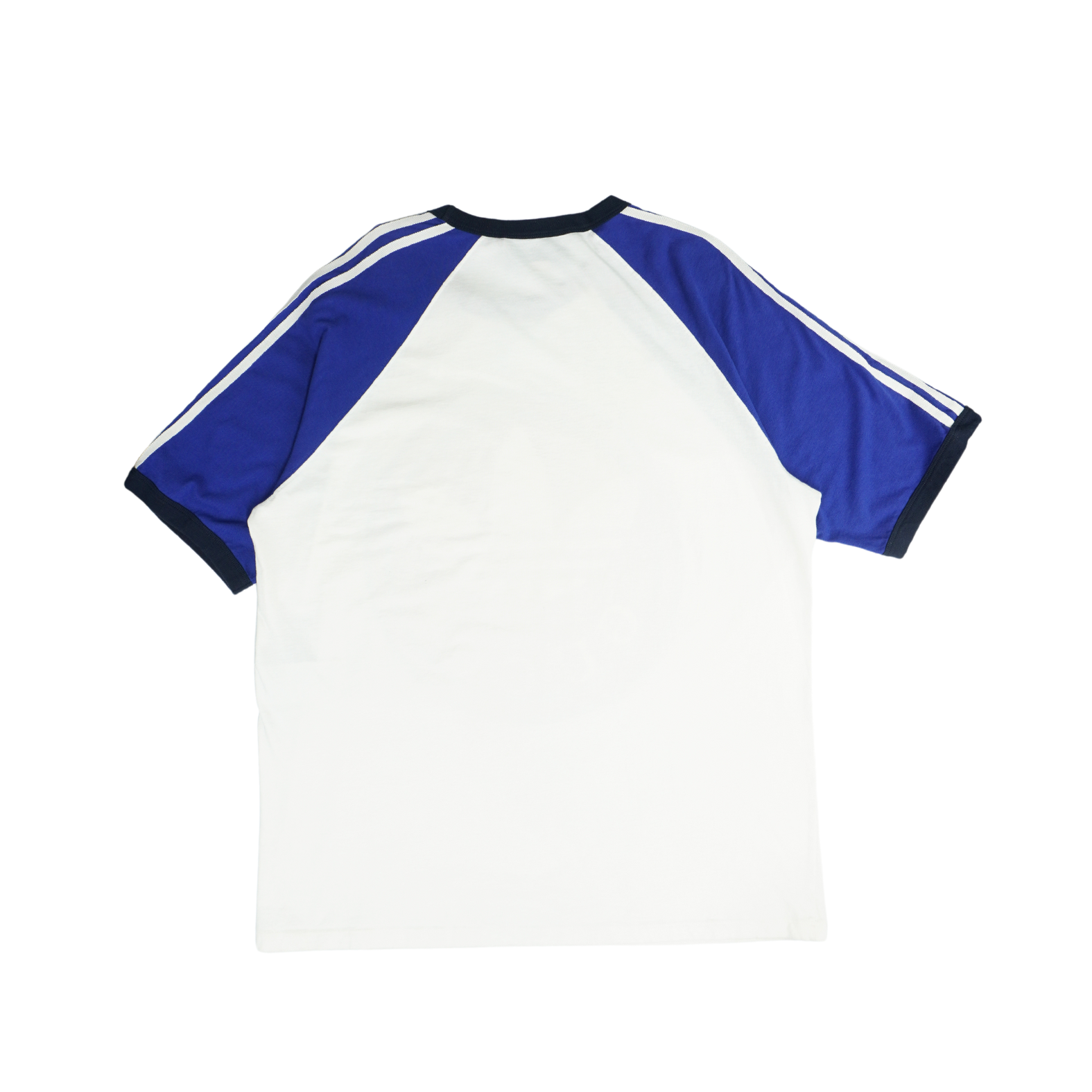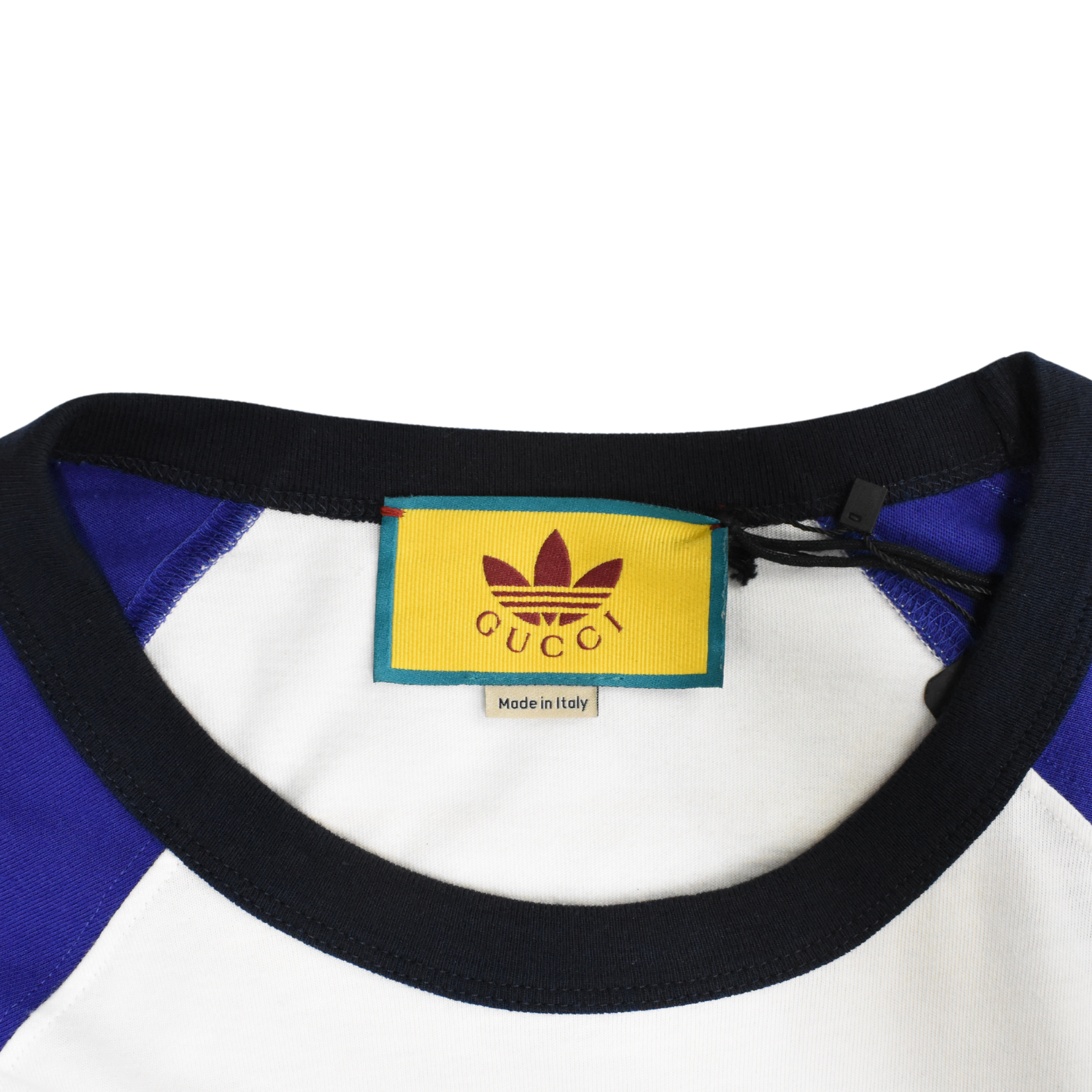 Gucci x Adidas white cotton t-shirt with red and black circle logo graphic and blue sleeves.