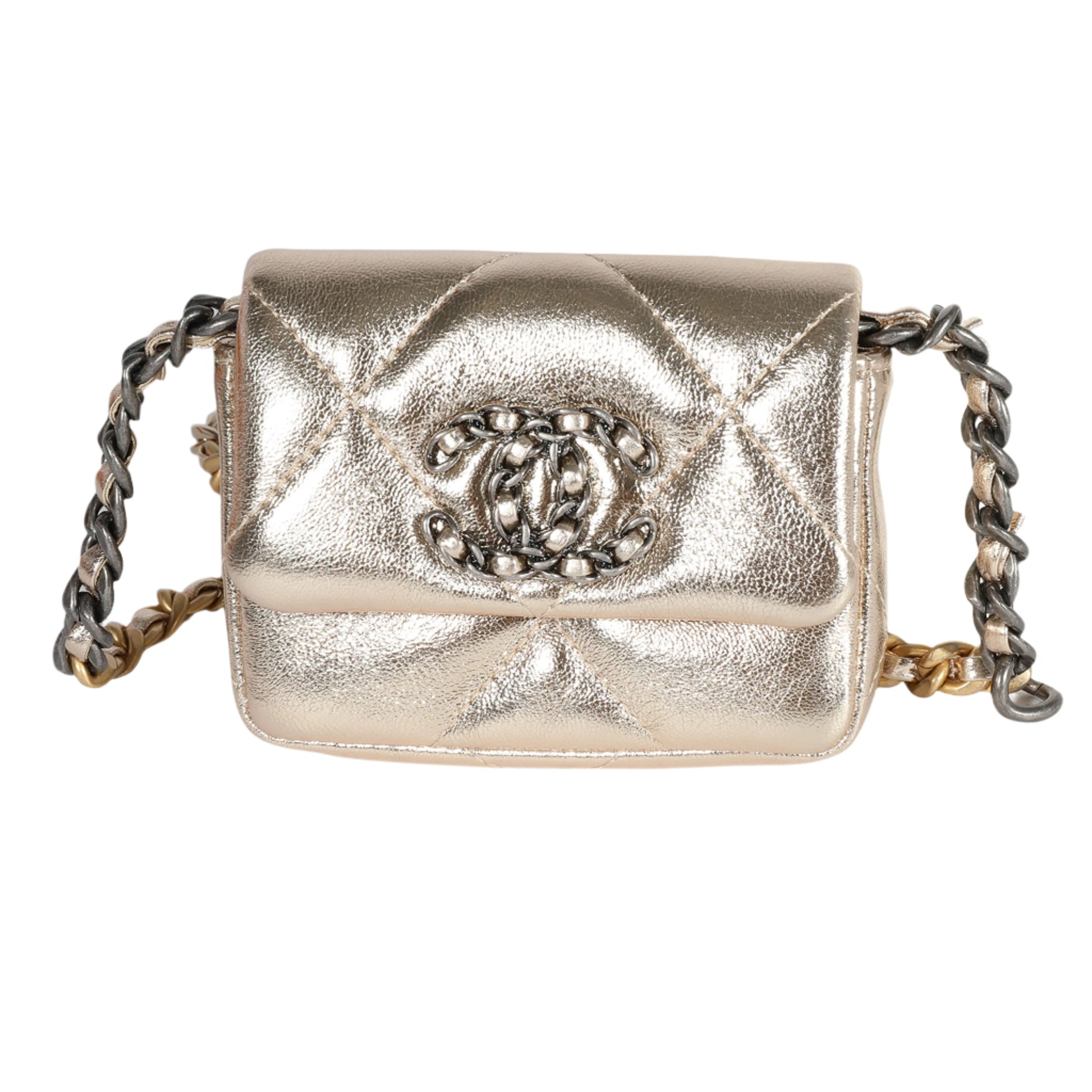 Chanel Metallic Gold Lambskin Chanel 19 Belt Bag with mixed metal hardware. In excellent, preowned condition. Light exterior marks from storage. Interior is clean. No rips, tears or strong, abnormal odors.