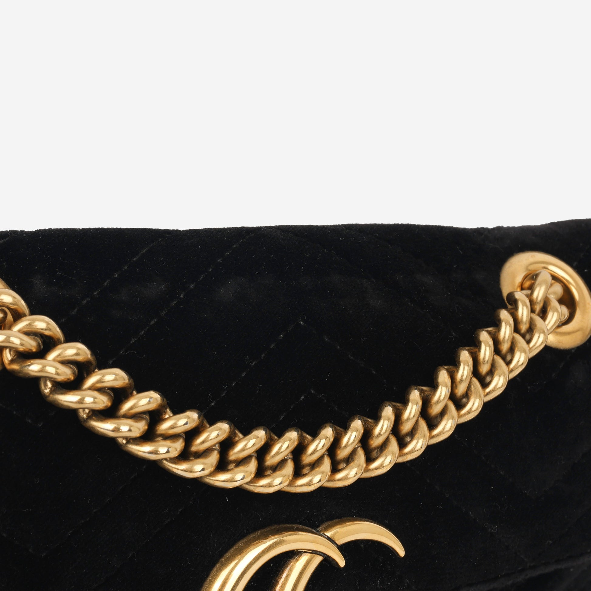 The Gucci mini Marmont has a softly structured shape and an oversized flap closure with Double G hardware. The sliding chain strap can be worn multiple ways, changing between a shoulder and a top handle bag. Made in black velvet with a heart on the back gives this a rich and romantic feel.