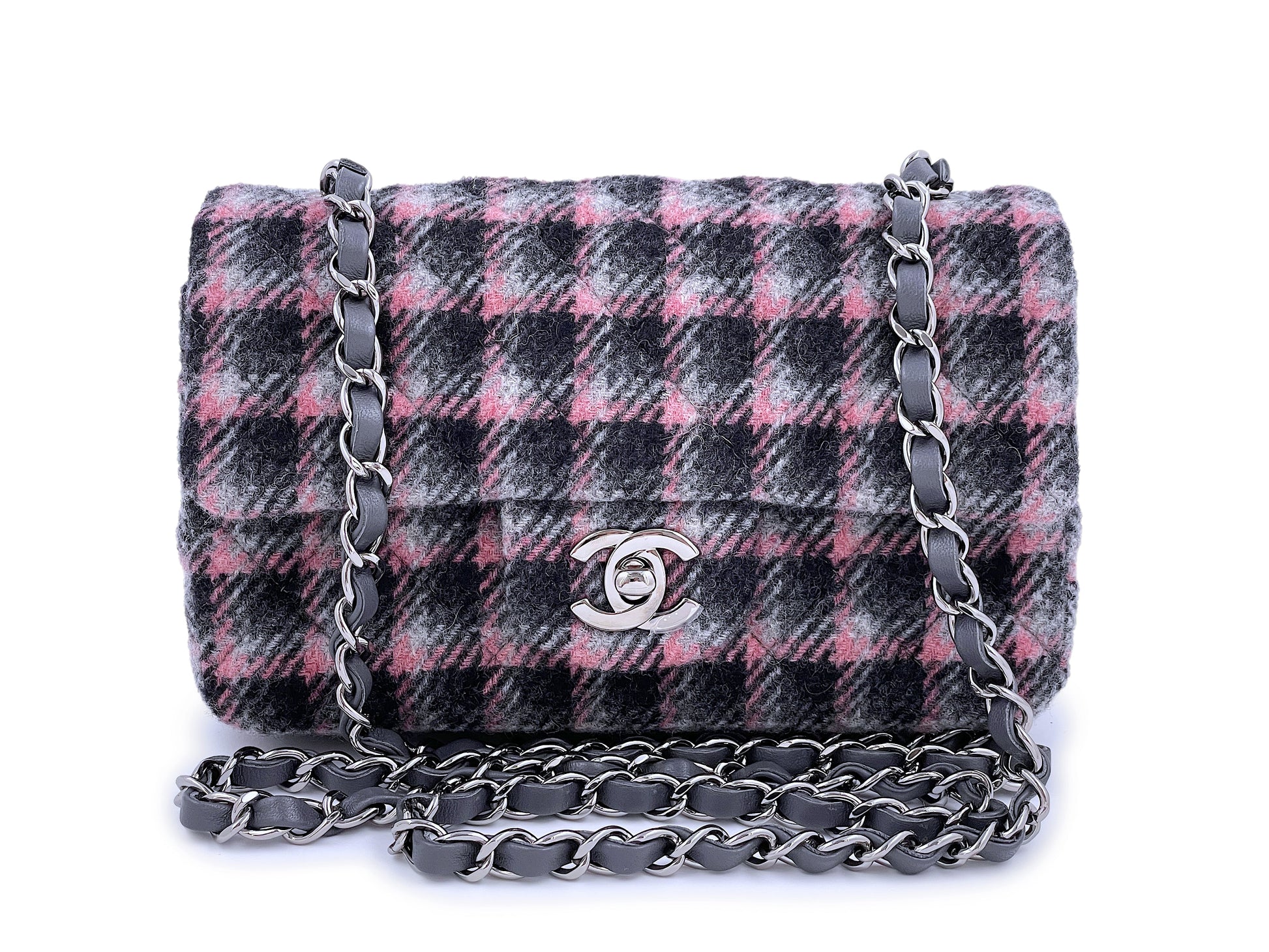 In Black/Pink/Gray checkered wool tweed and silver hardware. Exclusive to 2021 Fall/Winter collection Act I, this pattern and combination will never be seen again. In one of our favorite combinations - dark grays and pinks with a gray lambskin woven chain strap and gray leather interior.