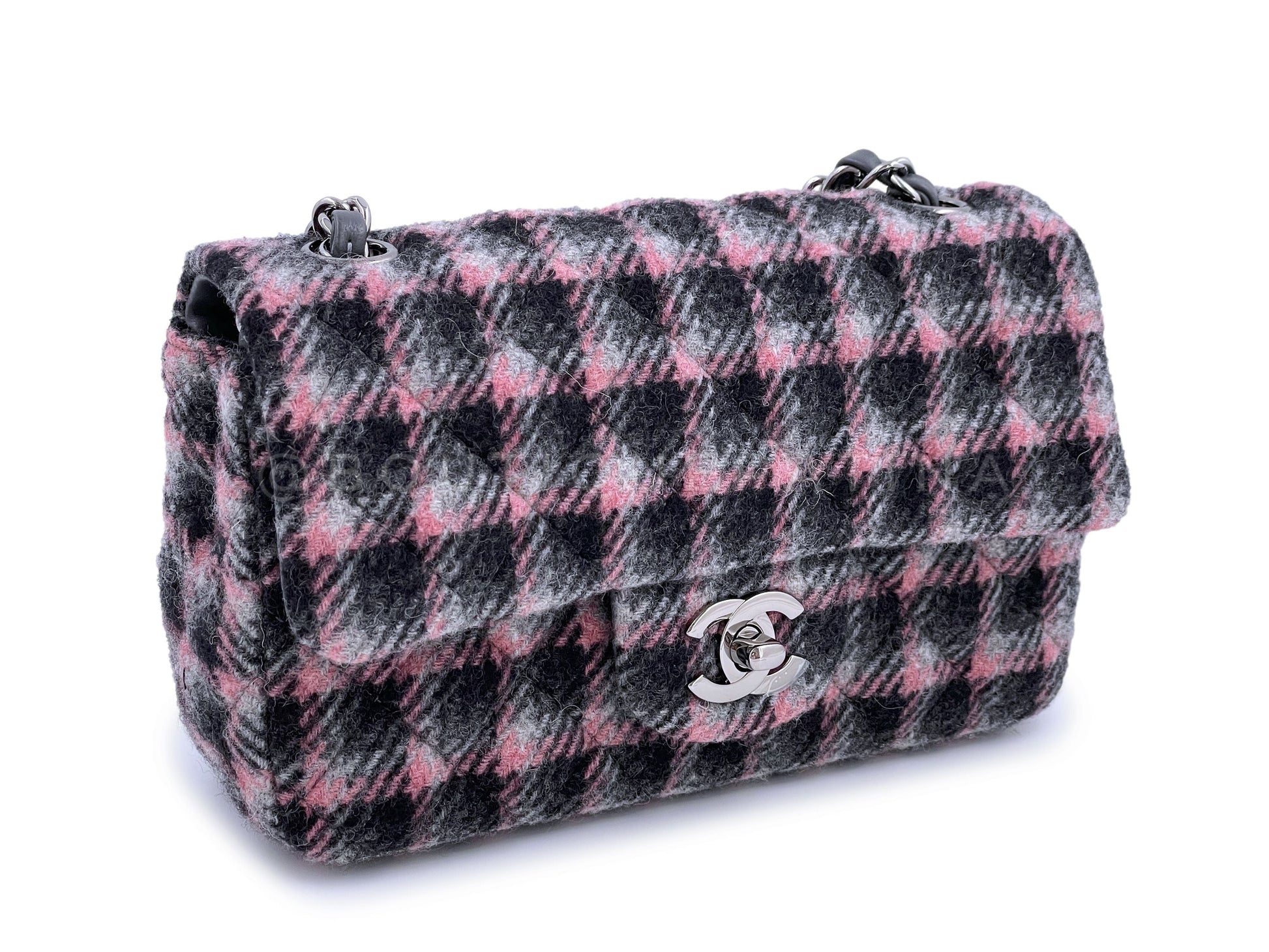 NIB 21B Chanel Rectangular Mini Classic Flap Bag Black/Pink/Gray Tweed Wool SHW