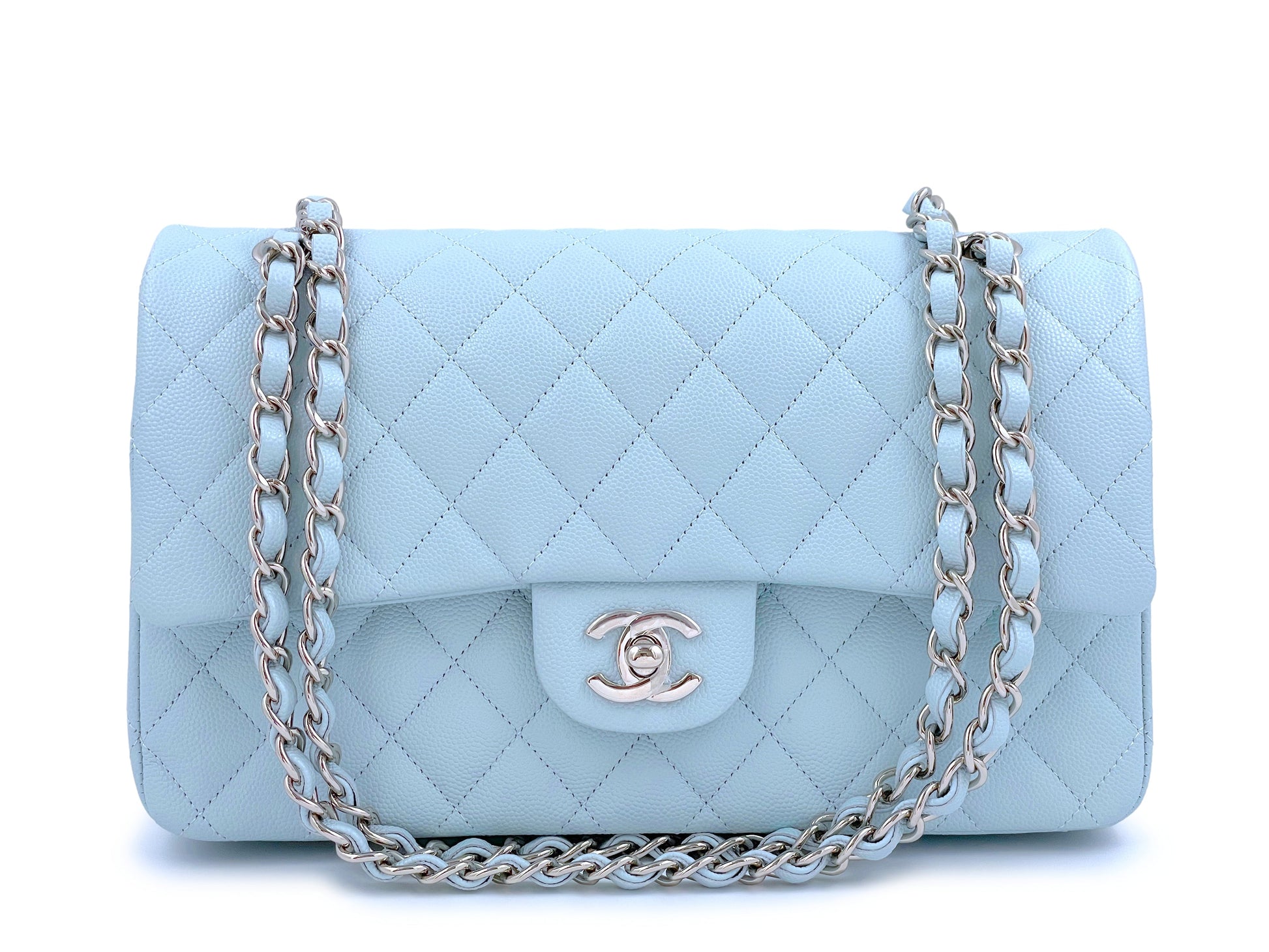 In pale light blue caviar leather and silver hardware. Exclusive to Chanel's 2021 Fall Winter collection, this is a very light, pale blue color in a shiny caviar leather and silver hardware. A stunning light pastel. In caviar leather, the classic flap is durable with the pebbled grain nodes of calfskin leather.