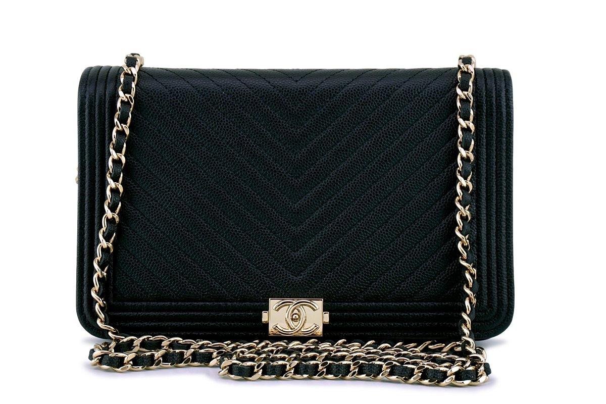 NIB Chanel Black Caviar Chevron Boy Classic WOC Wallet on Chain Flap Bag GHW