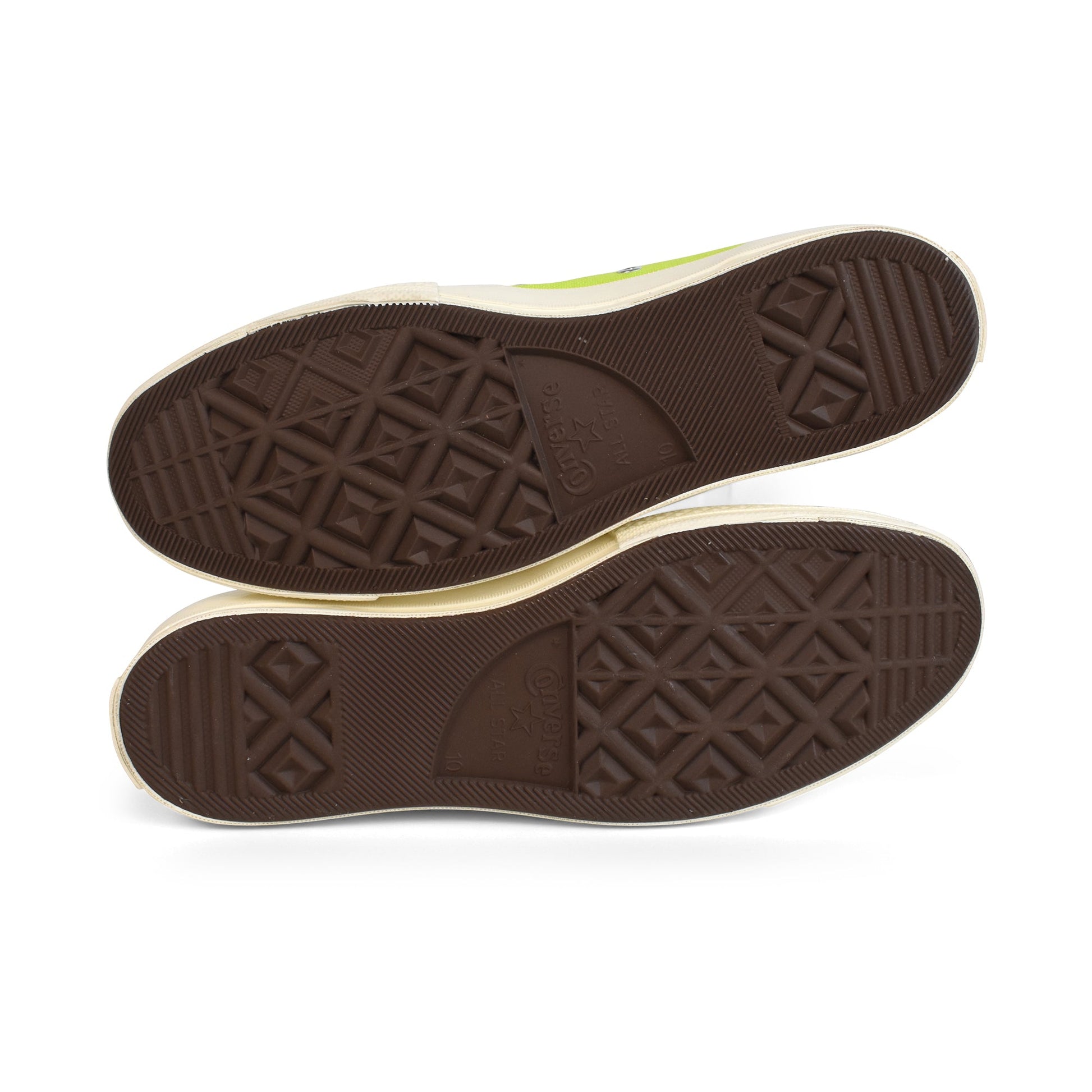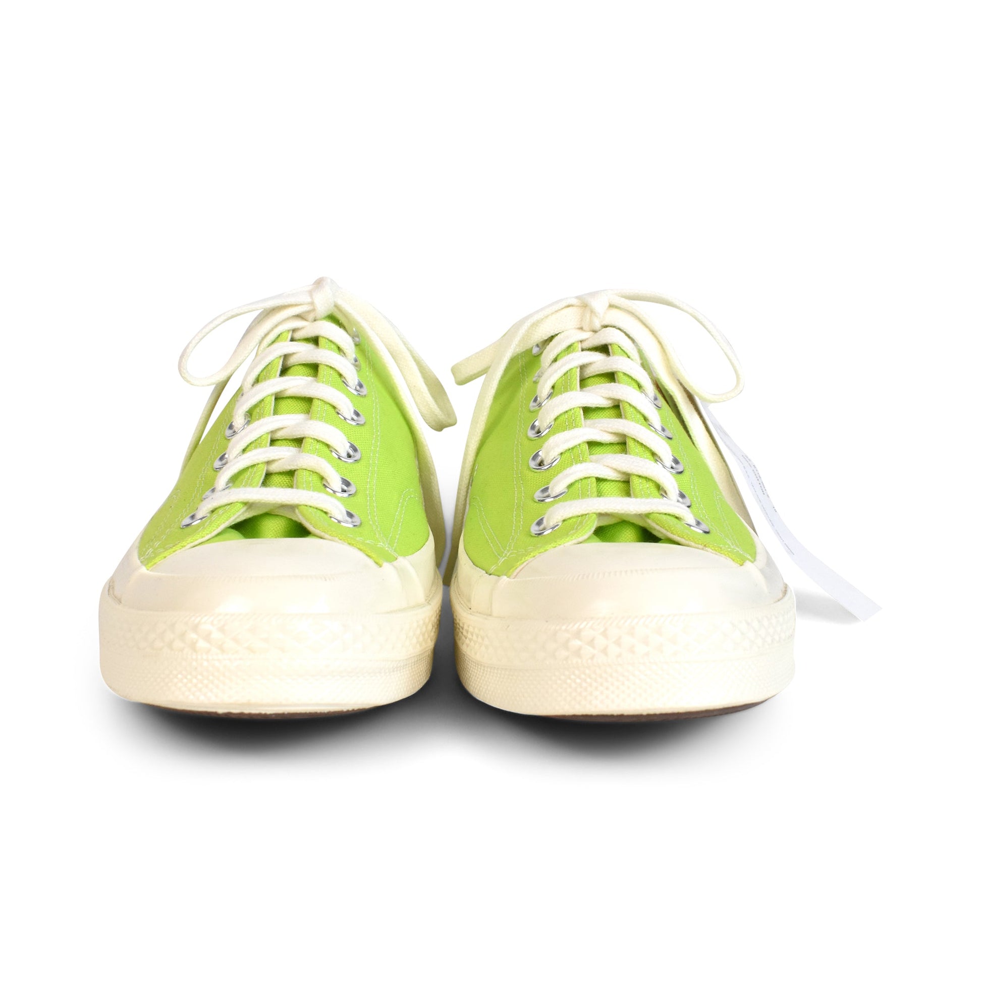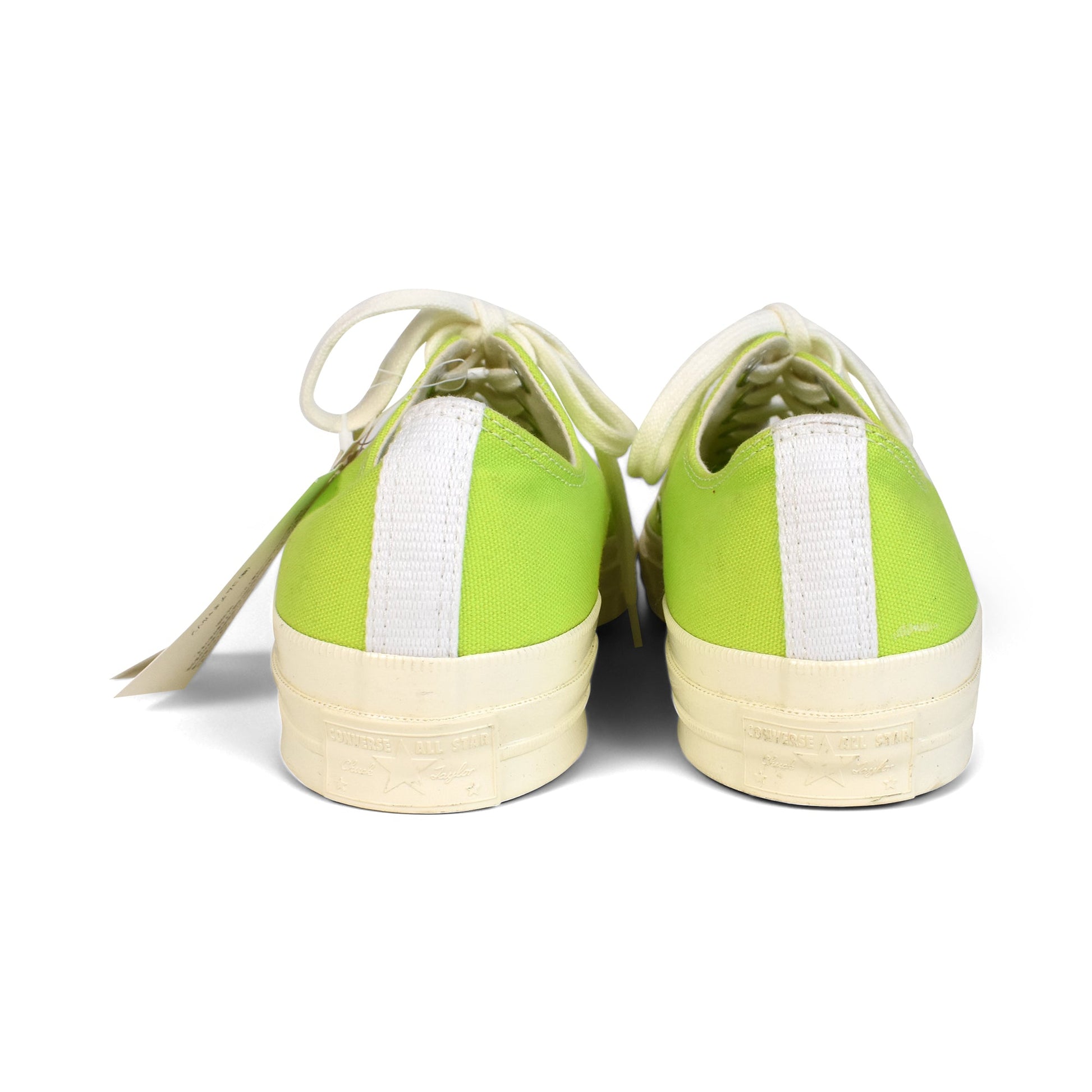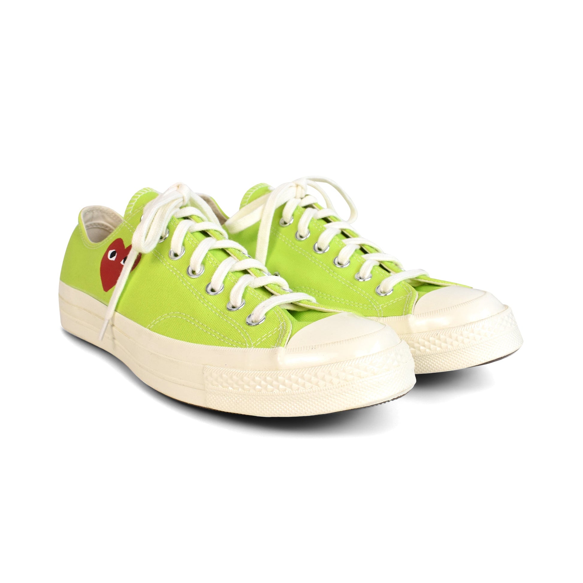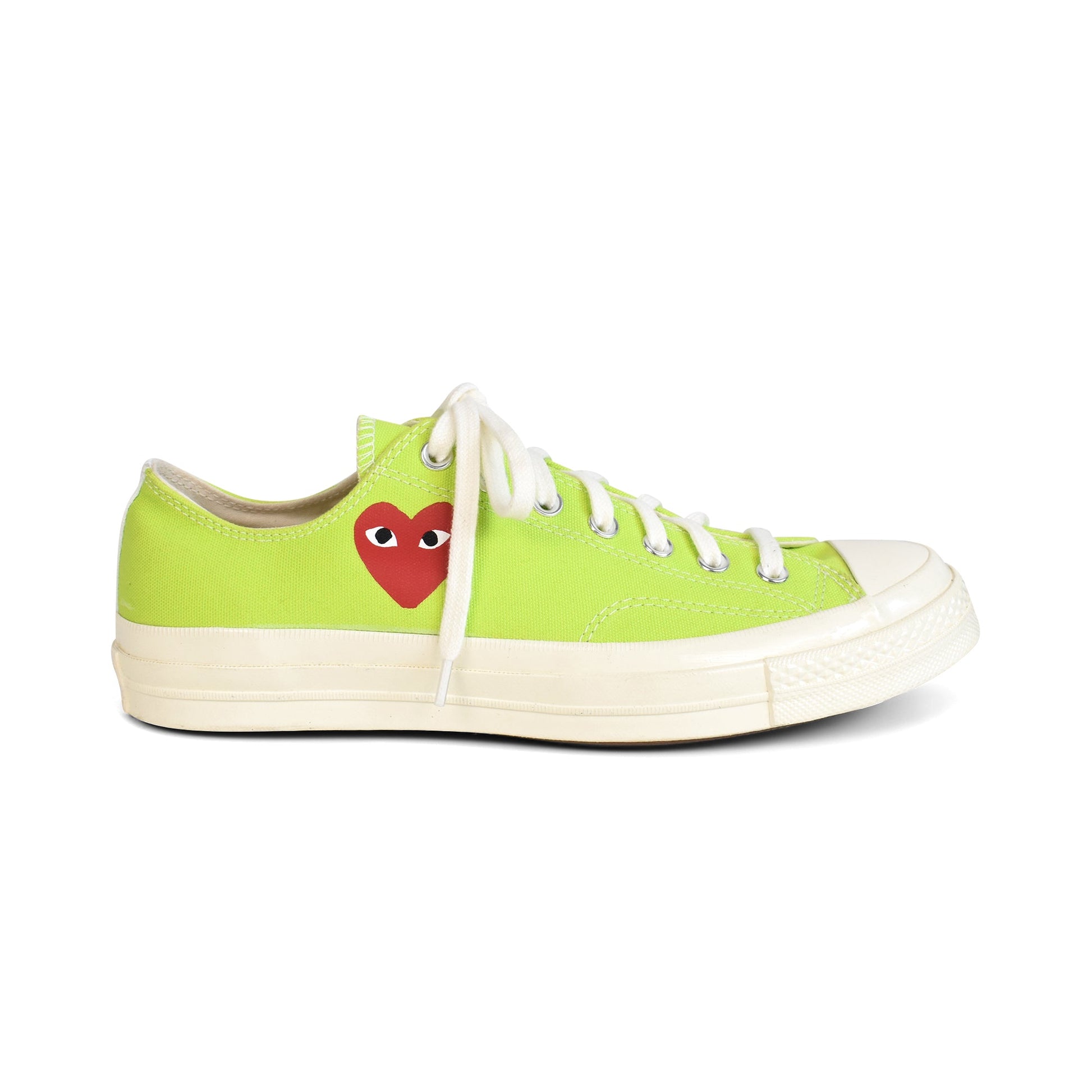 Converse x Play Comme des Garcons low-top sneakers in neon green canvas. Features a white rubber sole, white flat laces, and red logo heart on the sides.