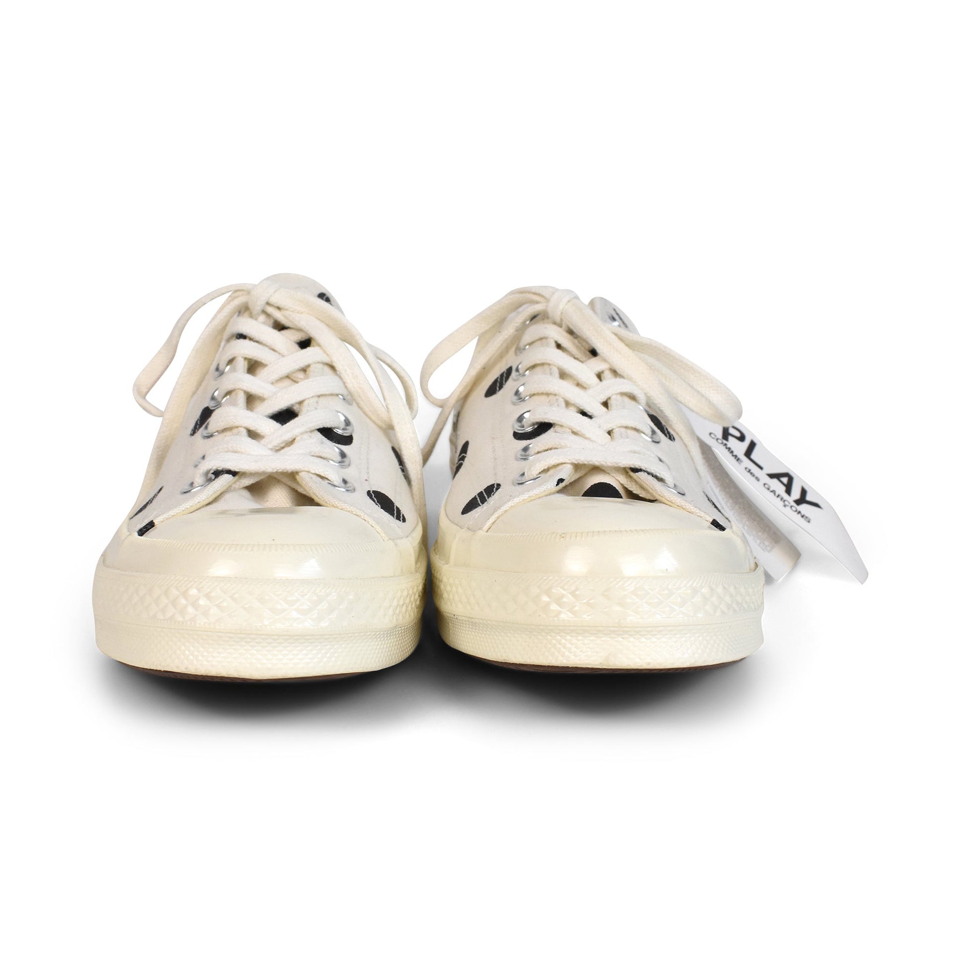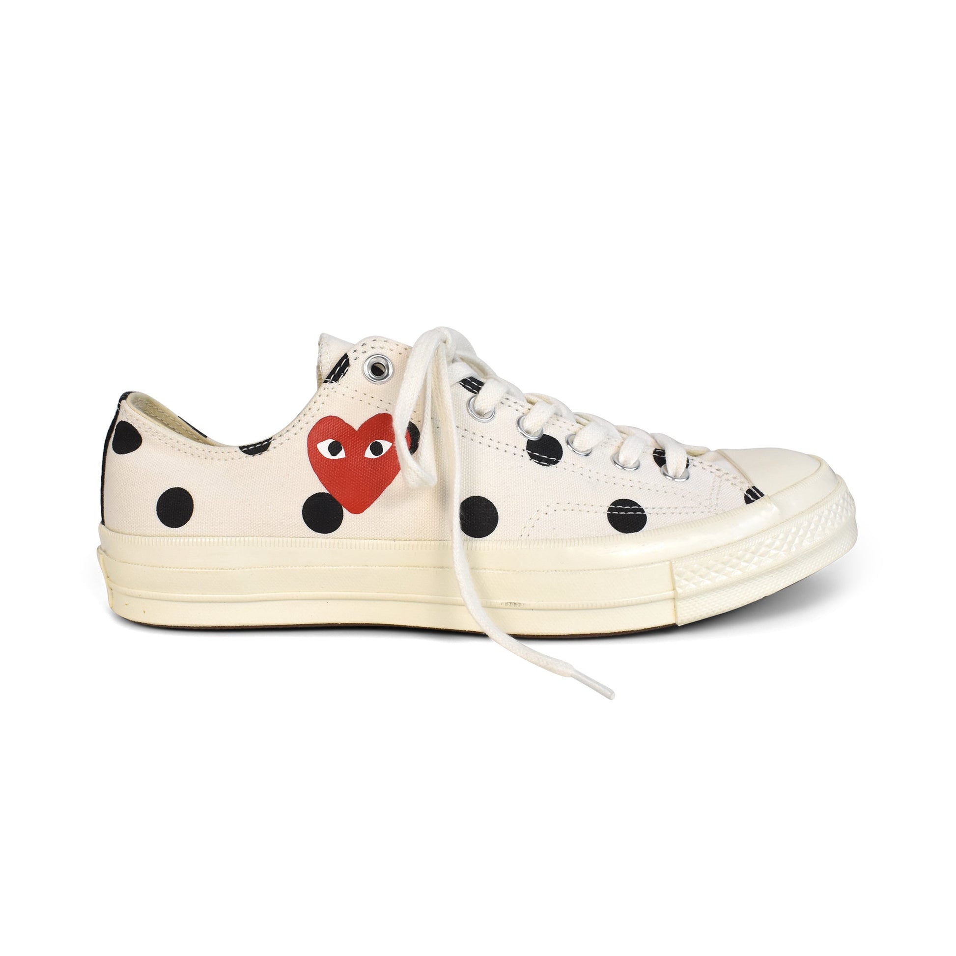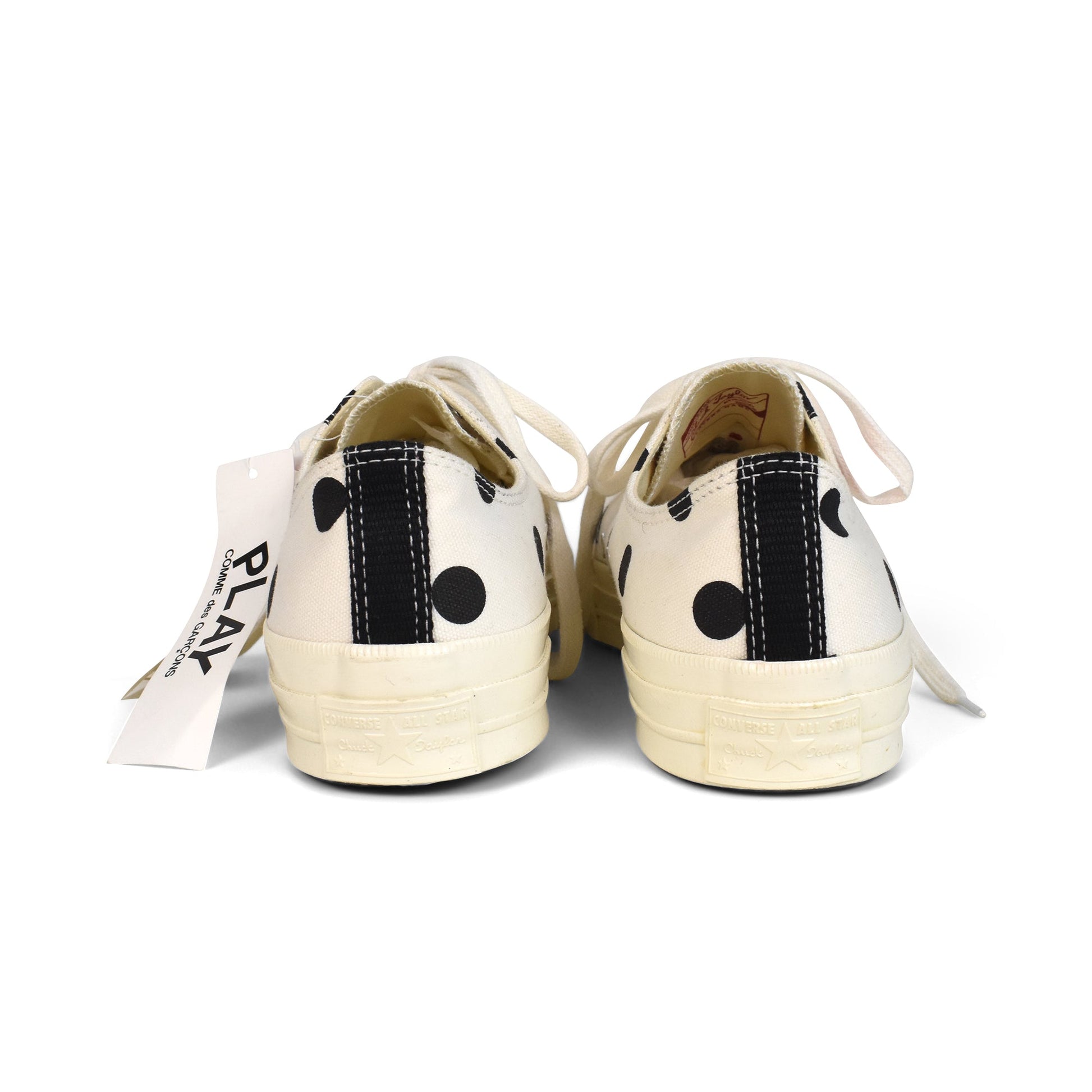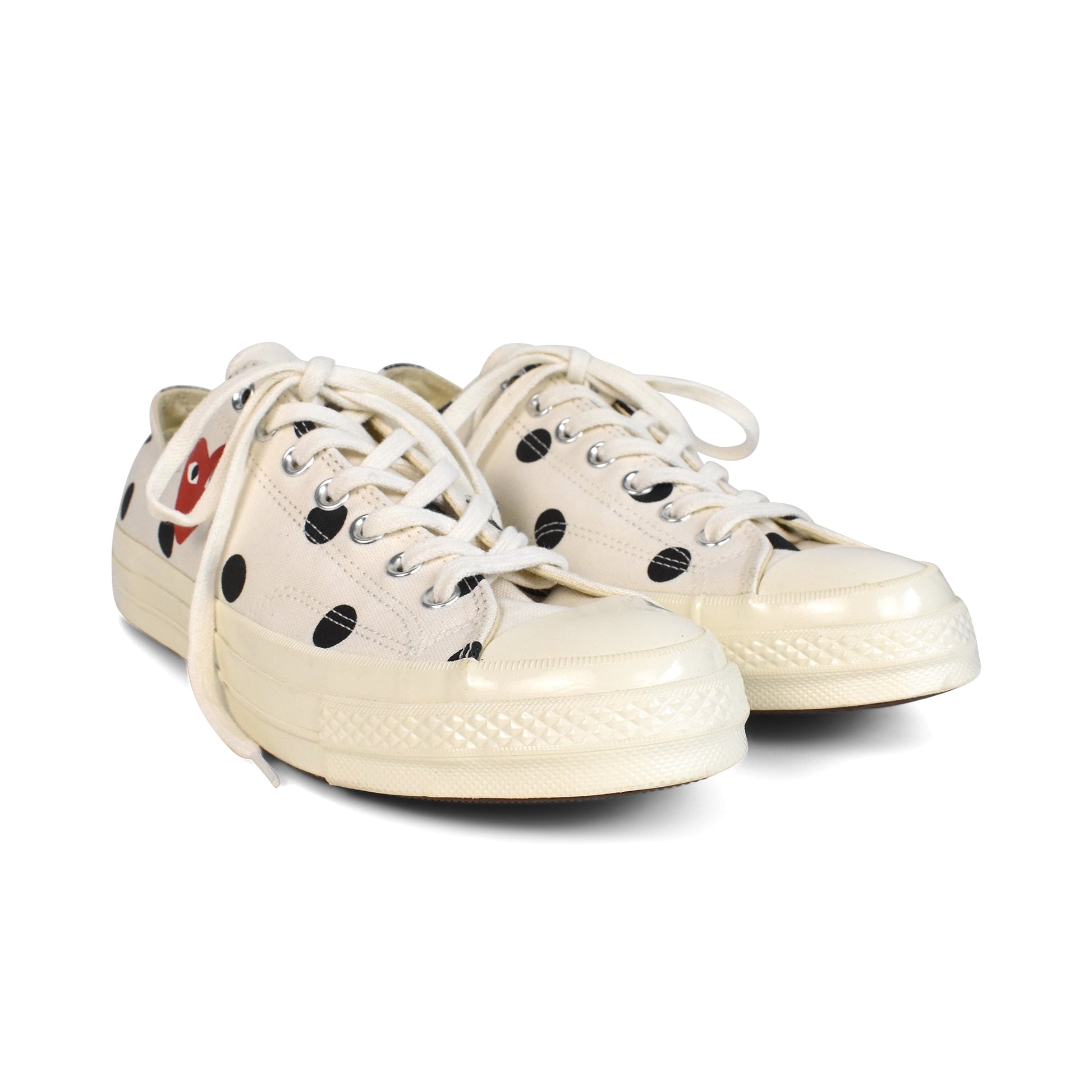 Converse x Play Comme des Garcons low-top sneakers in white canvas with white rubber sole. Features black polka-dot pattern throughout, red logo heart on the outer sides, and flat white laces.