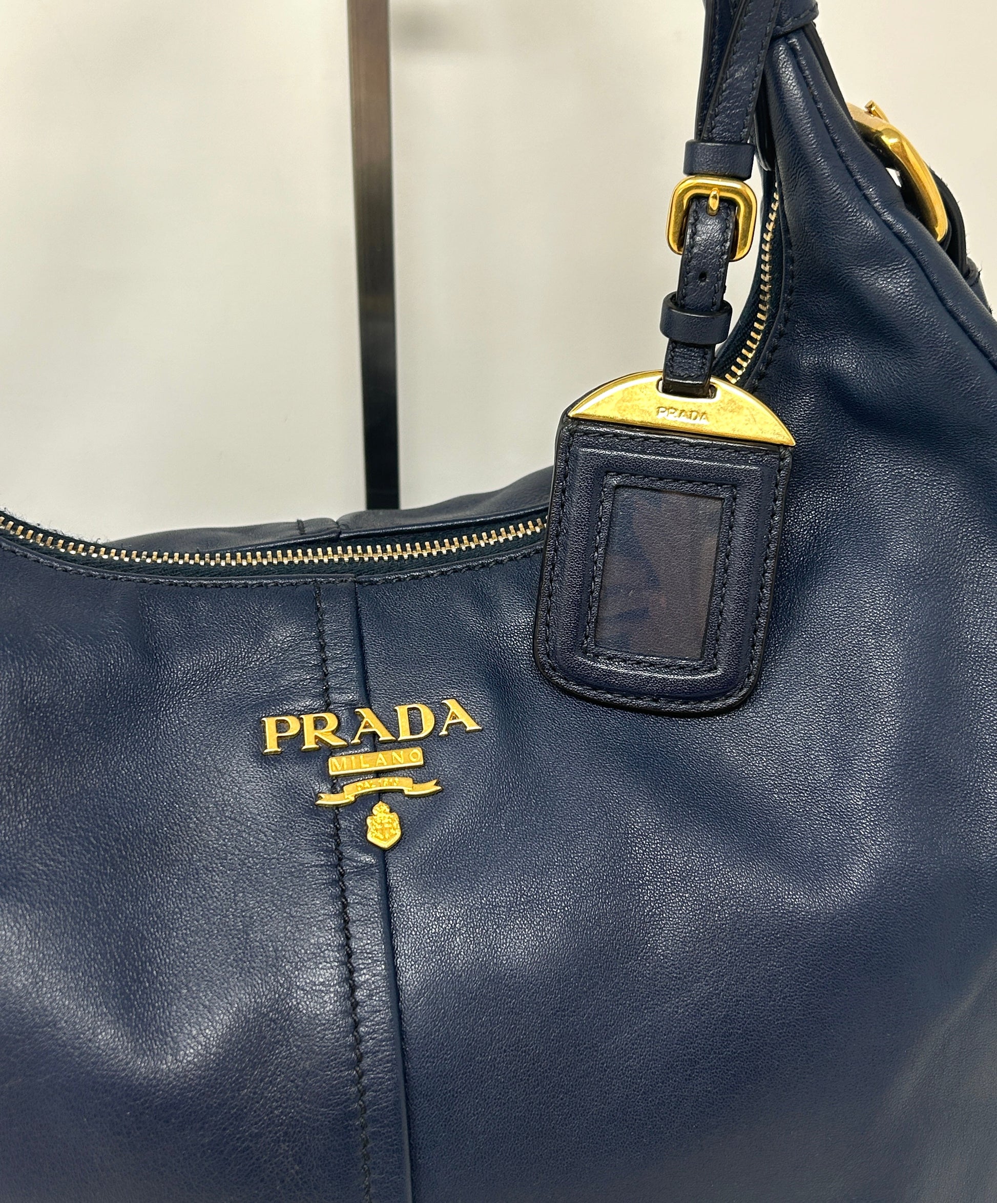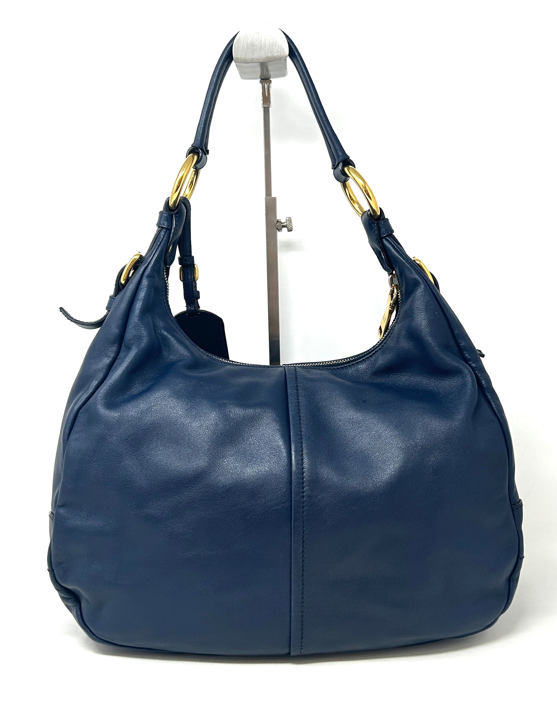 - Navy blue soft calf leather hobo shoulder bag featuring a flat leather strap, gold tone hardware, buckle detailing on the sides, oversized zipper, detachable leather tag