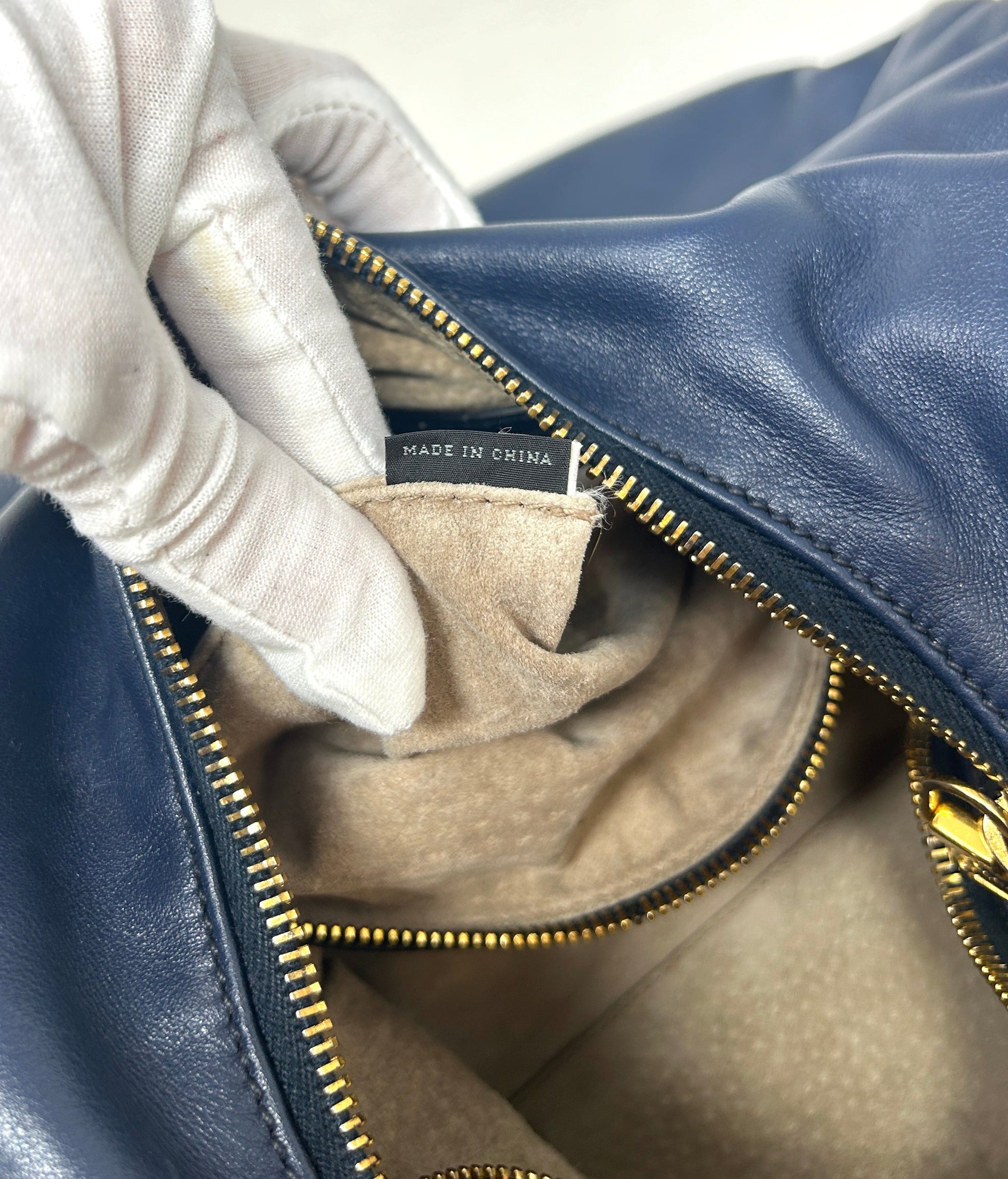 - Interior is crafted from beige suede leather, features one main compartment, one side zip pocket and one side slip pocket
