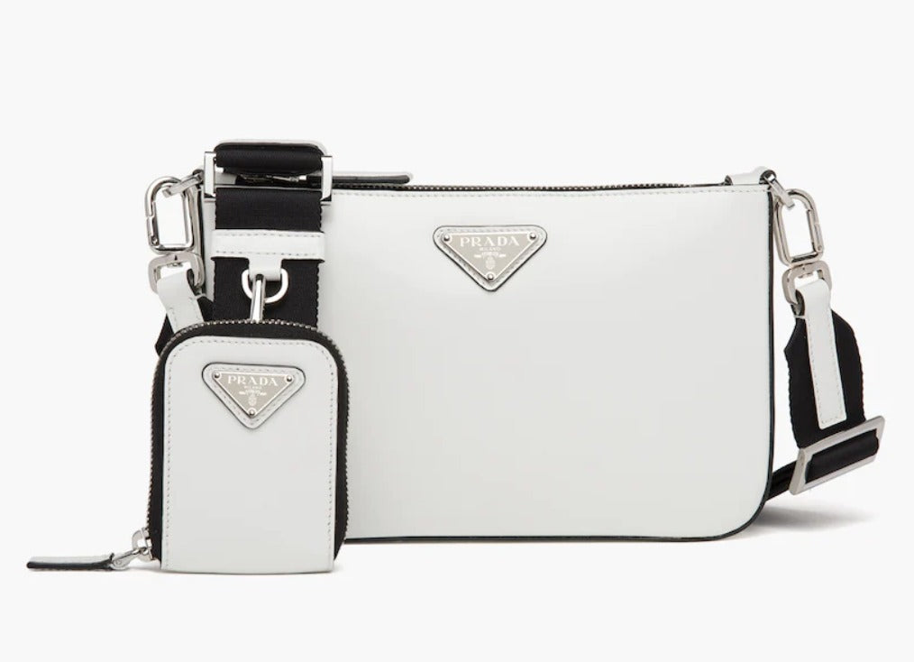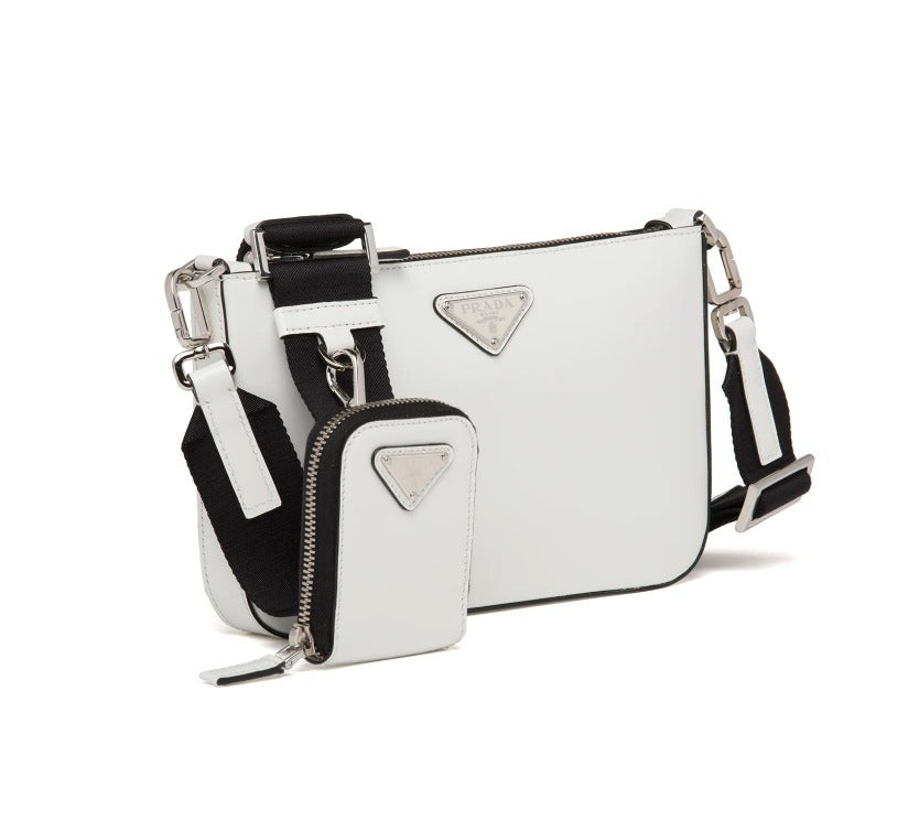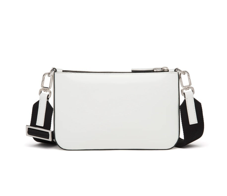 Perfectly combining elegance and practicality, the triangle logo introduced for the first time on trunks designed by Mario Prada accents the accessory, completed by a detachable mini pouch that hooks onto the woven nylon tape shoulder strap.