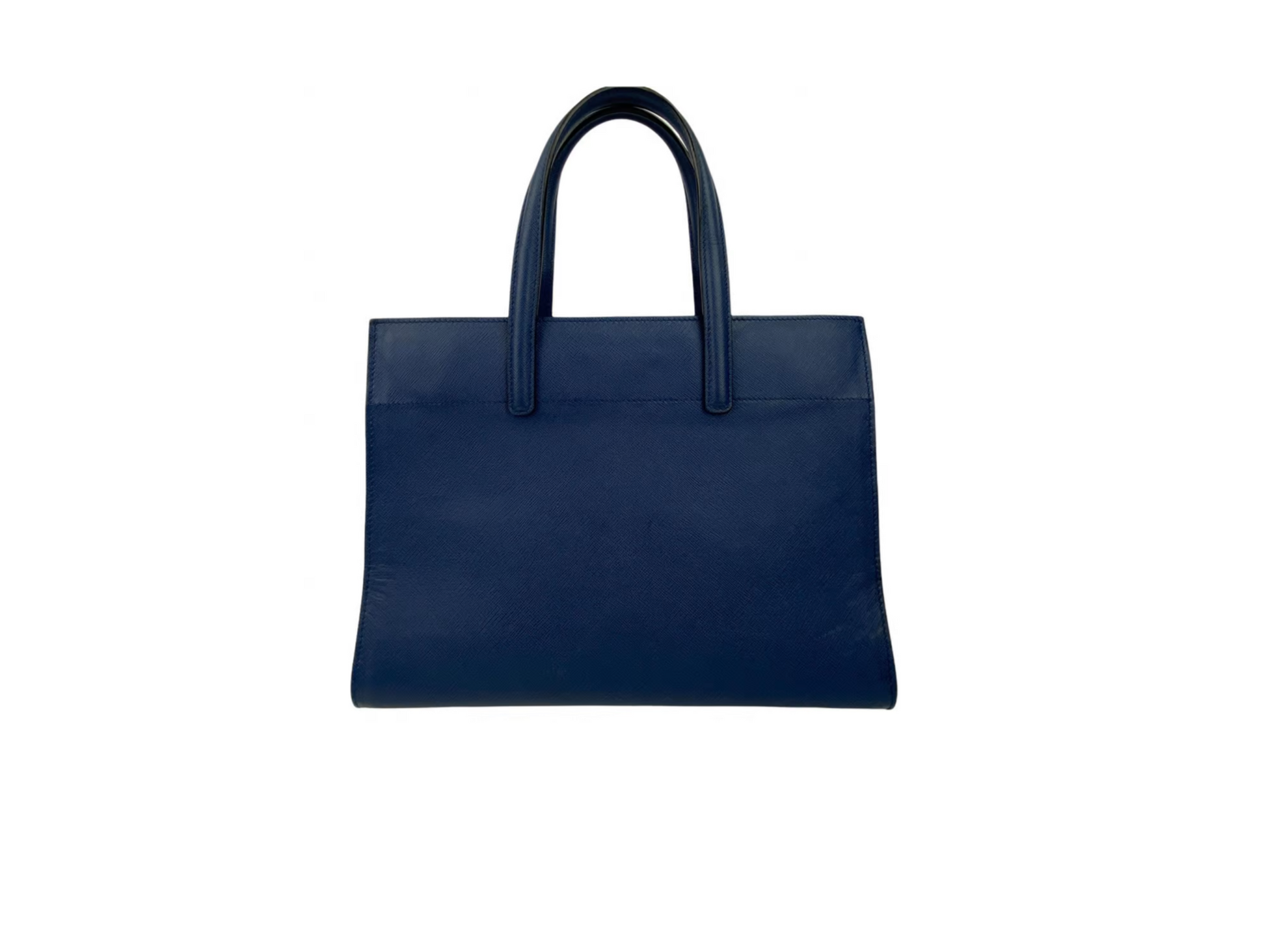 Crafted in Blue Saffiano leather, Features dual top handles, protective base studs, and gold-tone hardware. It opens to a black and blue leather interior with a middle zip compartment, exterior snap compartments, and side slip and zip pockets.