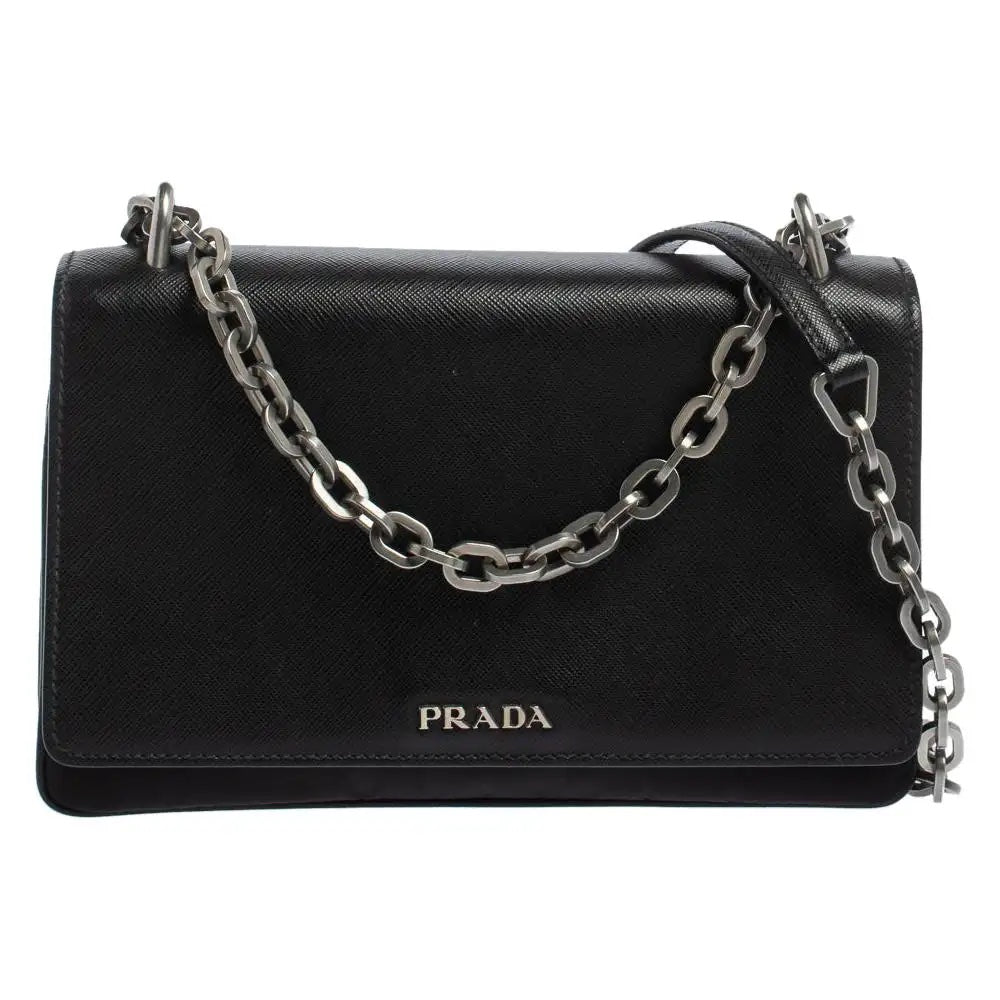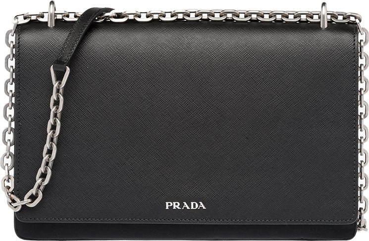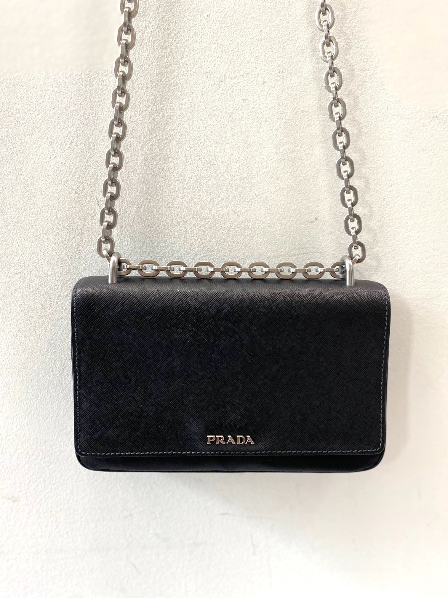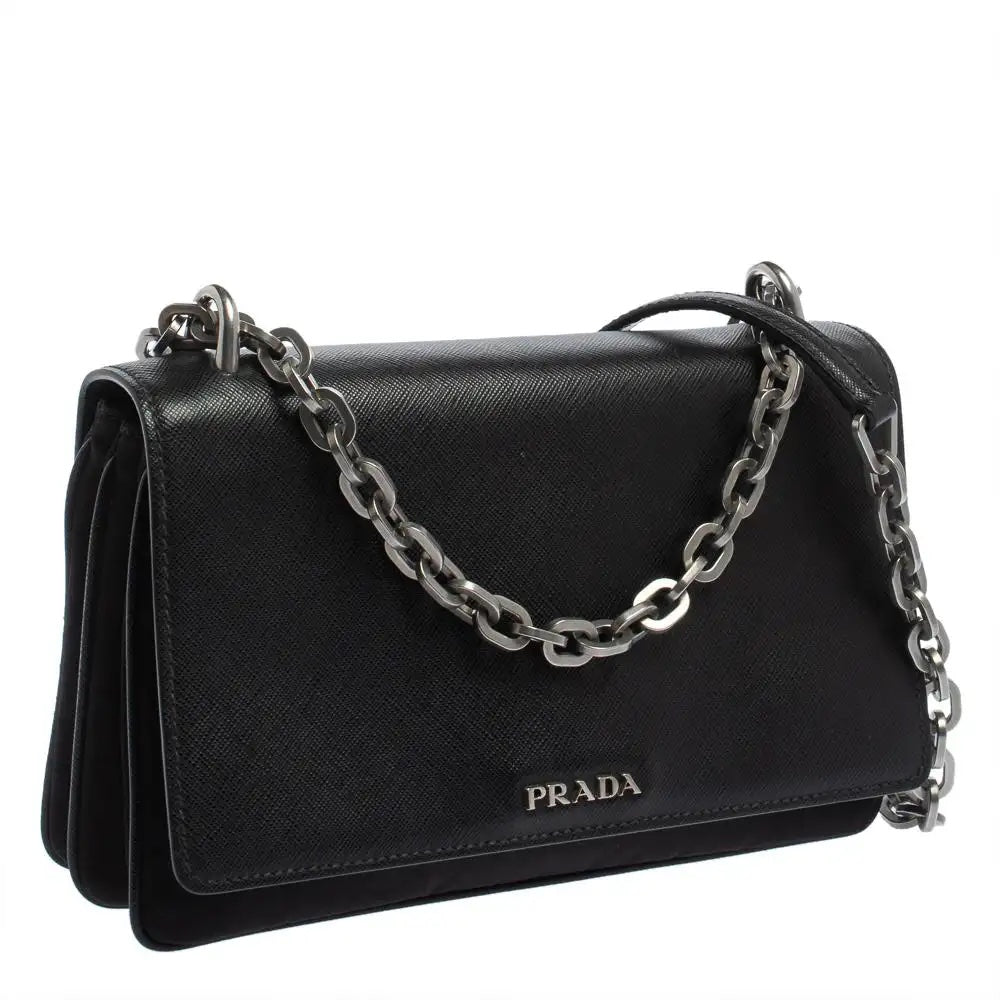 An elegant choice for everyday use or special events is this bag from Prada. It is crafted from Black Saffiano leather and Nylon, features a flap design. It has the logo on the front and a leather-lined interior that is well-sized. The bag is complete with a chain.