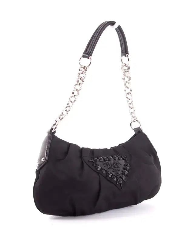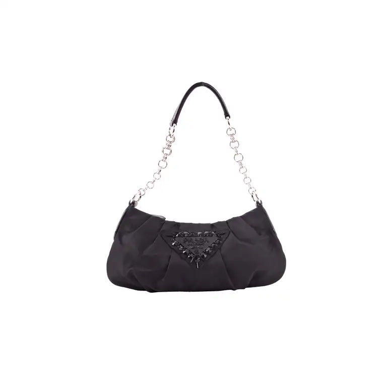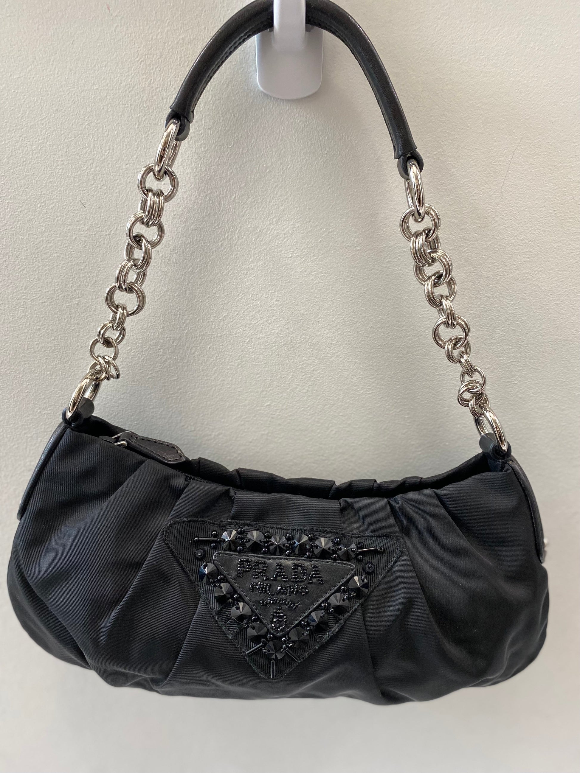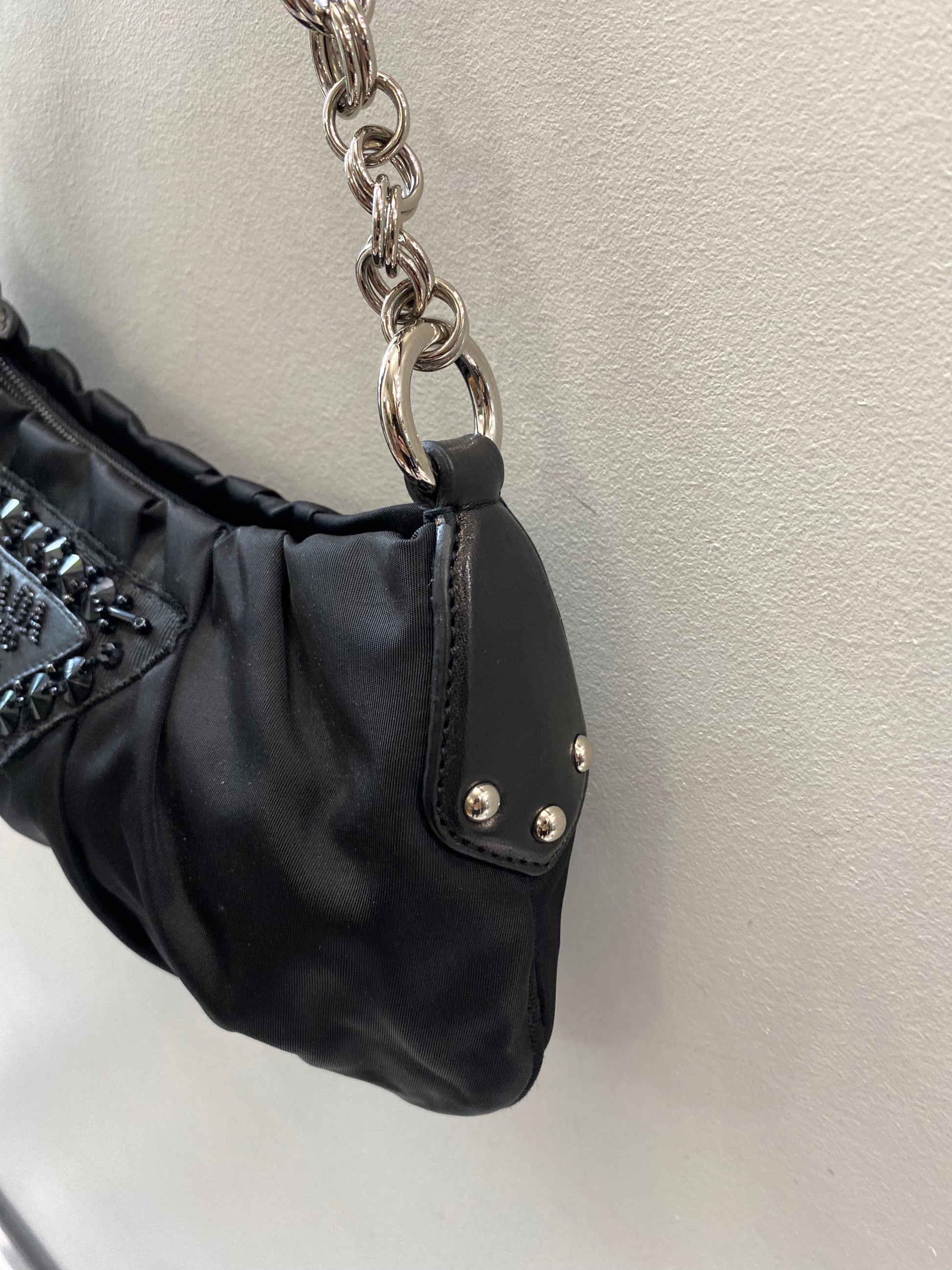 Features a black leather and chain link handle and a beaded/sequined Prada emblem on the front exterior. There is a simple zip closure. The interior is done in a coordinating black nylon lining and includes and side zip pocket.