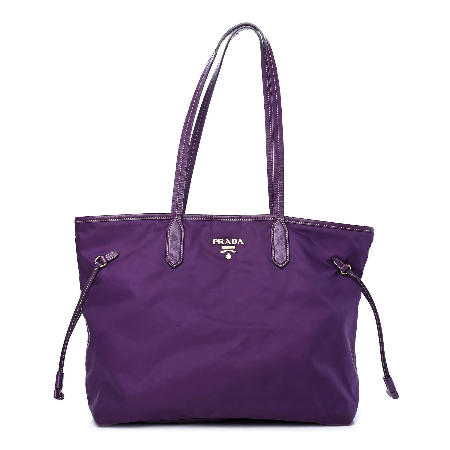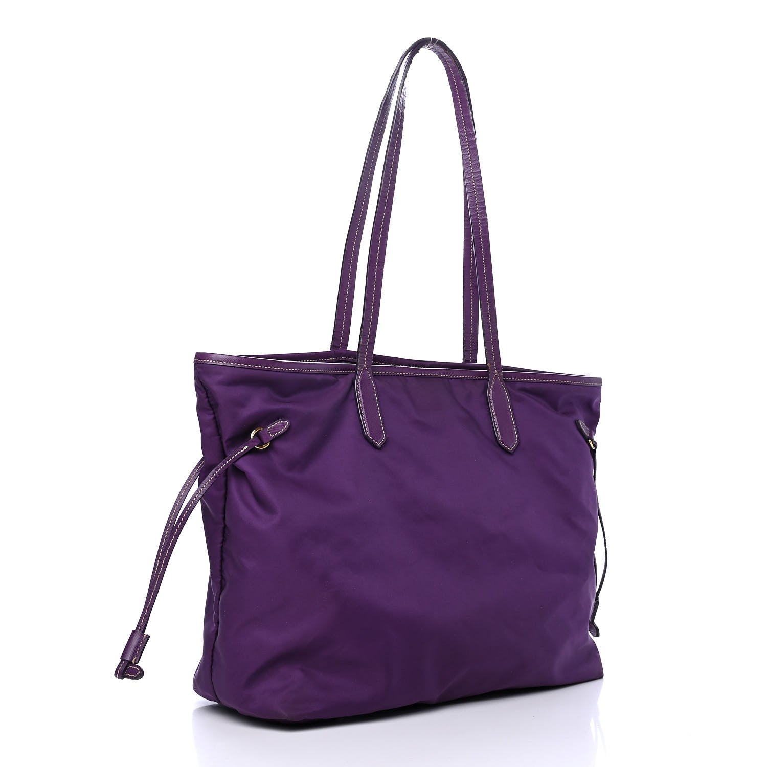 Features purple saffiano cross-grain leather trim, shoulder straps, and side cinch cords with polished gold hardware.