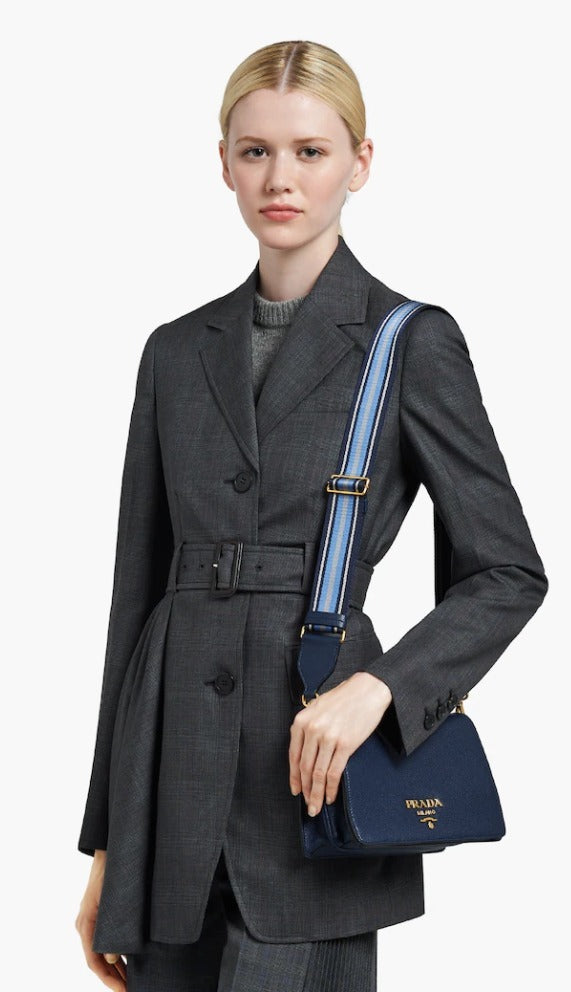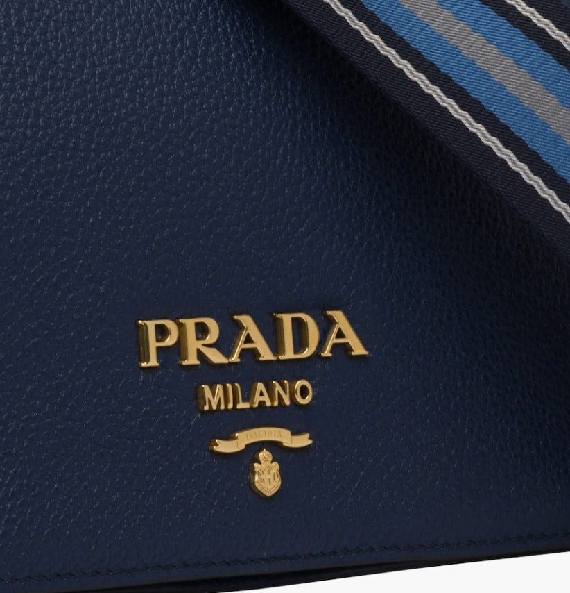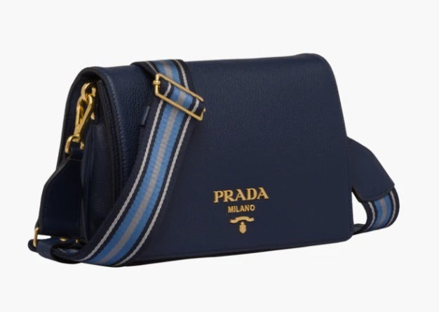 This chic cross body bag is crafted of Prada signature textured calfskin leather in Navy . The bag features a front flap, an adjustable cross body strap with gold hardware, and a multicolor nylon strap. The top opens to a Prada monogram interior spacious for everyday necessities with the sophisticated chic only from Prada!
