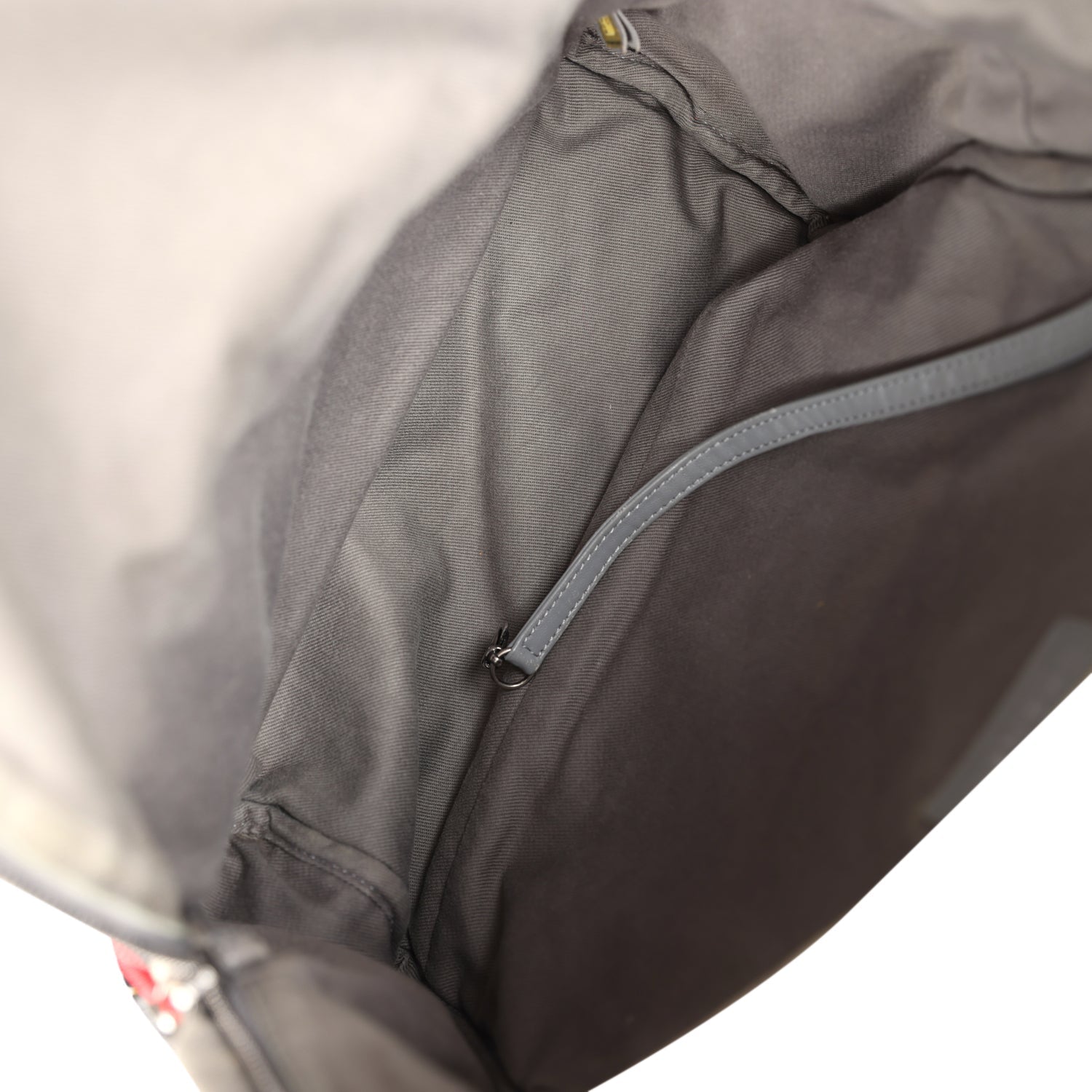The interior is lined in grey grossgrain fabric and has one zip pocket on the rear wall with logo pull.