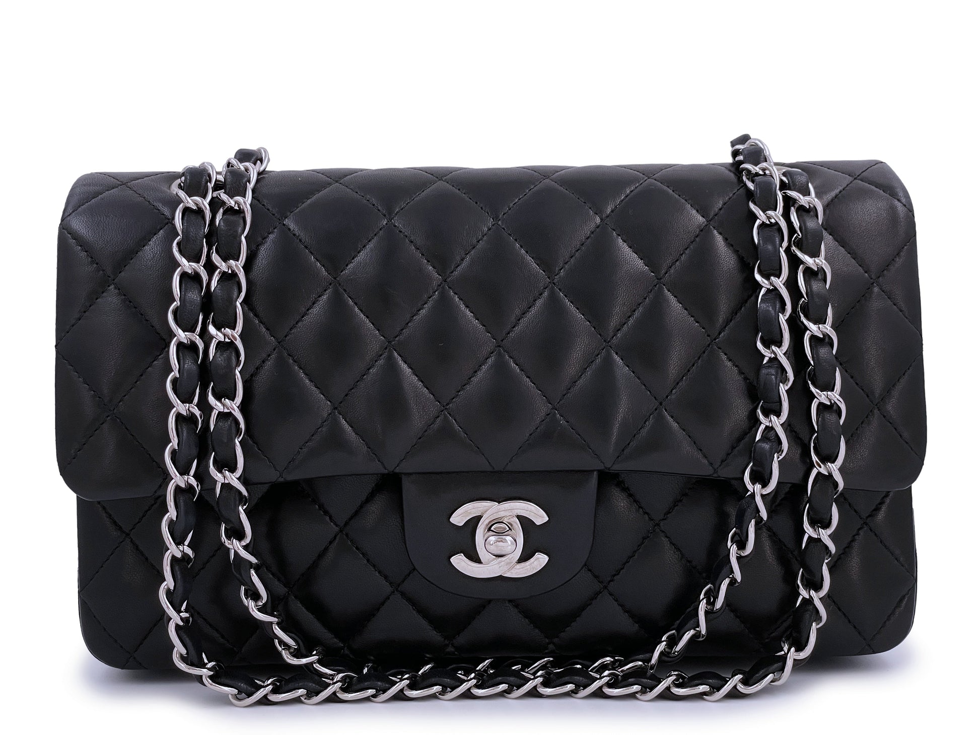 In Black lambskin leather and silver hardware. In lambskin leather, the original classic flap in all its glory with its petal soft quilts, true luxury. Boutique Patina specializes in sourcing and curating the best condition preowned vintage Chanel leather treasures by searching closets around the world.