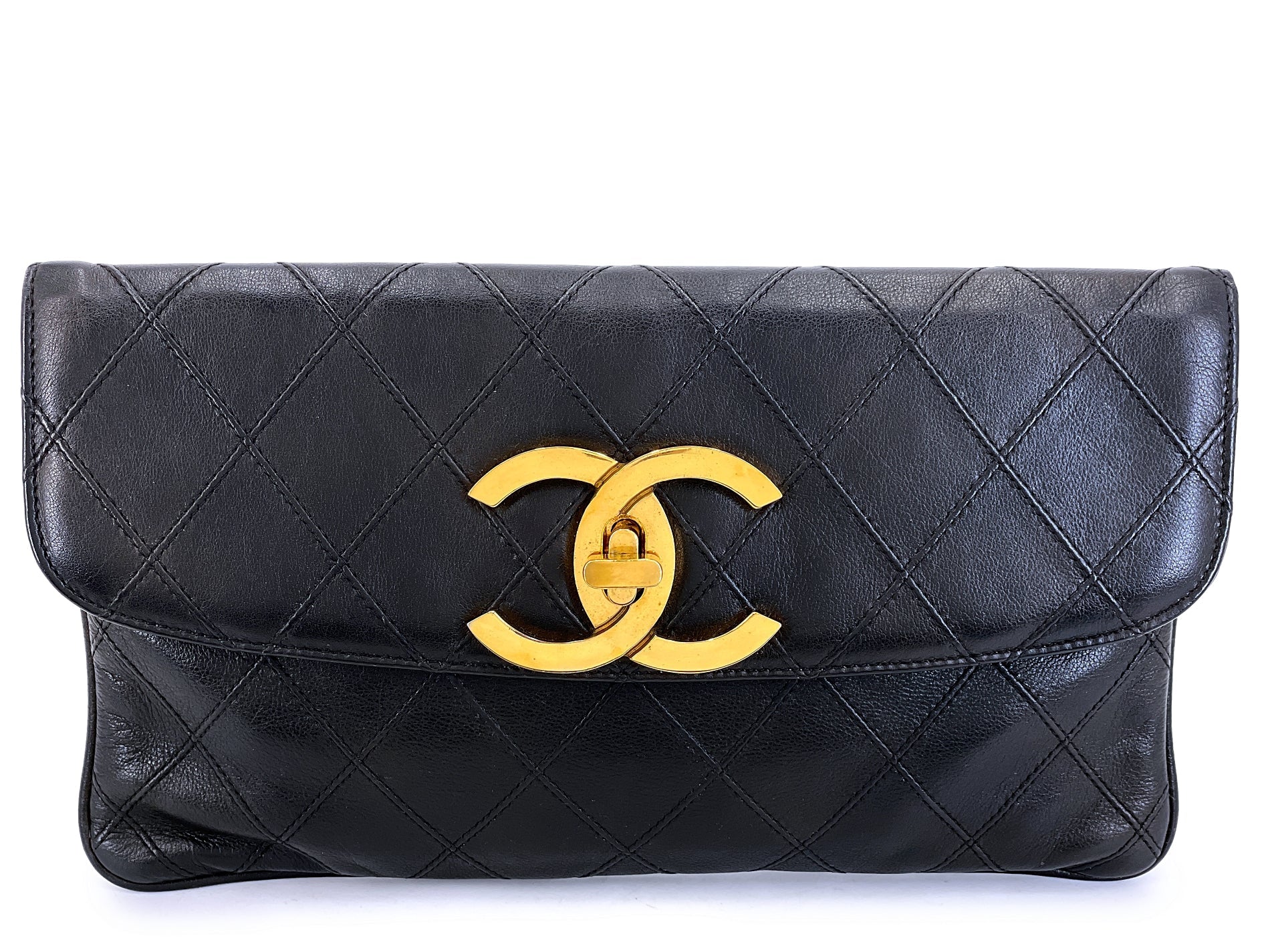 Rare Chanel 1988 Vintage Black Evening Clutch Bag Diamond Stitched 24k GHW 5OO