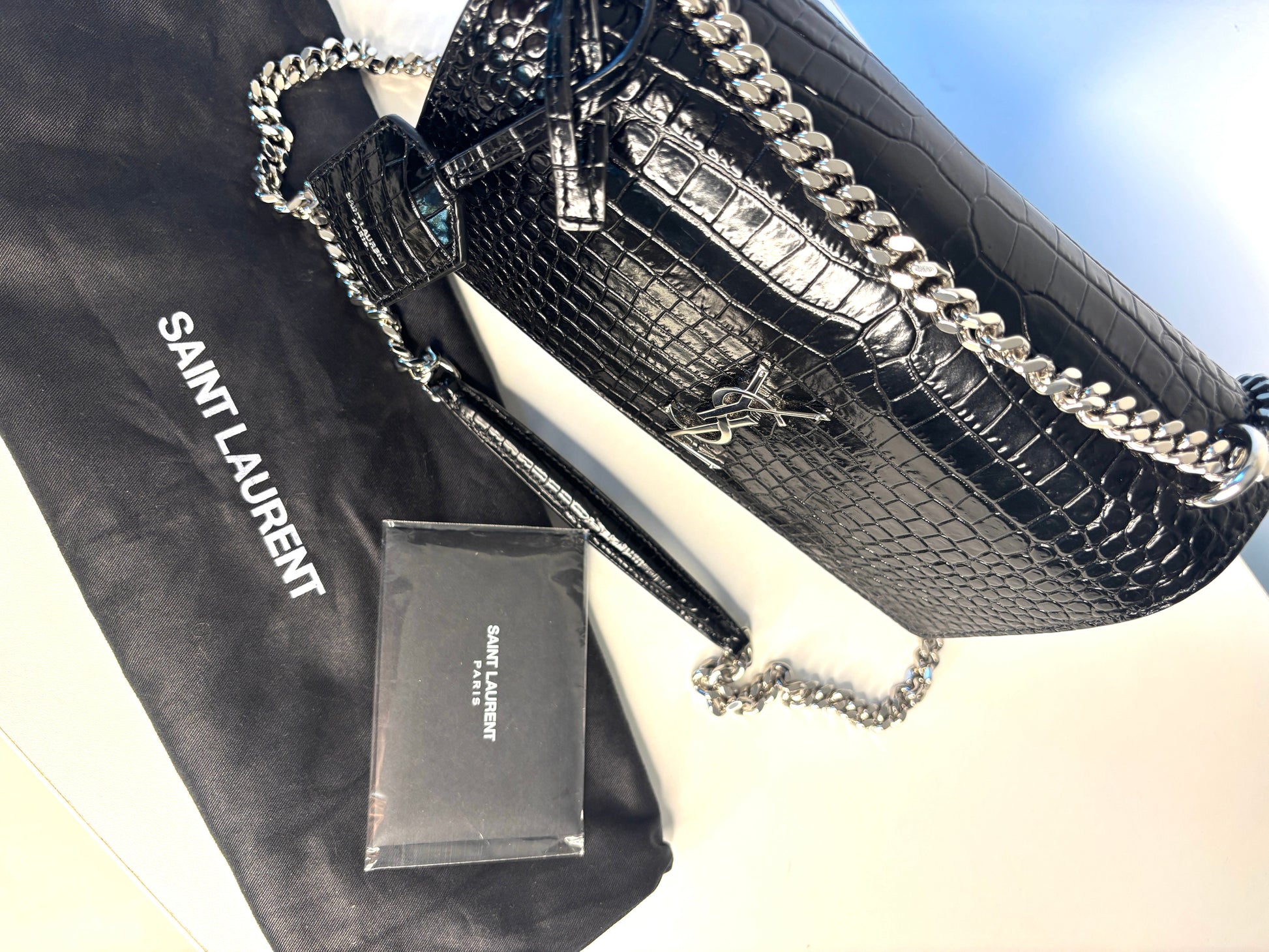 - YSL silver-tone metal logo on front flap