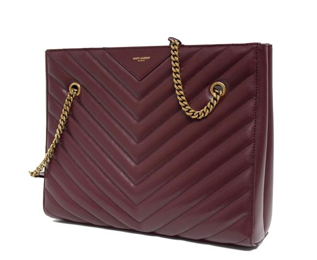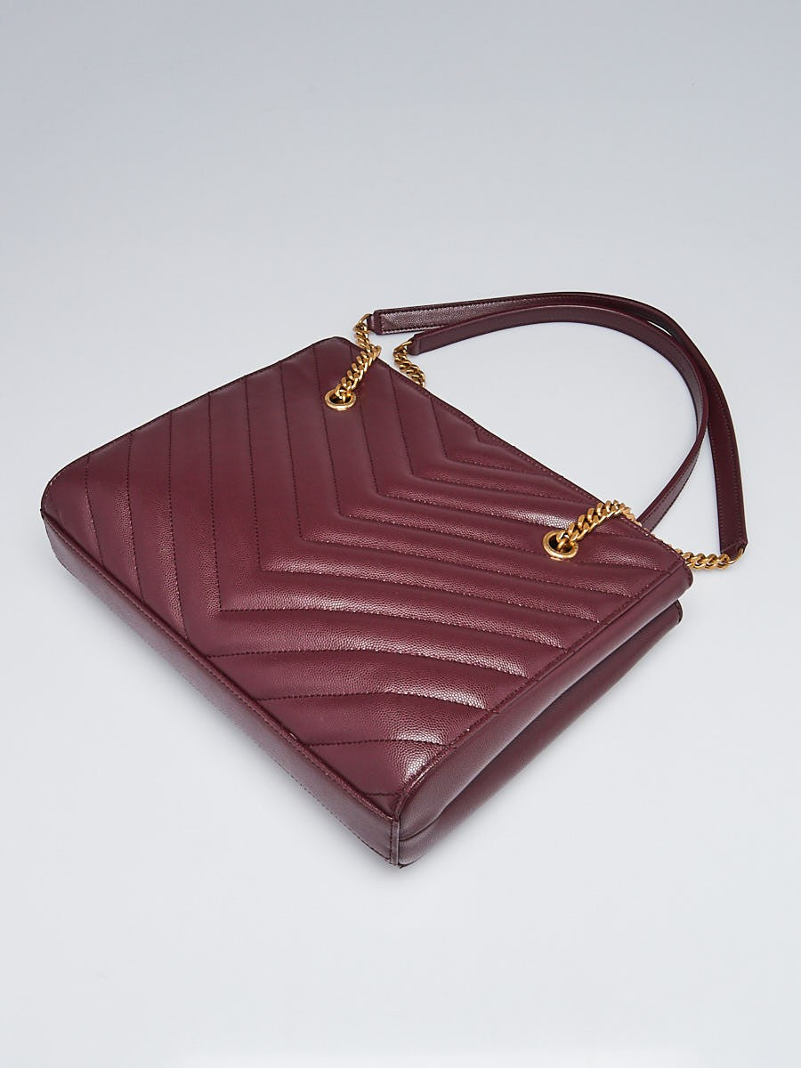 Saint Laurent's Tribeca shoulder bag is reimagined in this elegant burgundy iteration with Art Deco-inspired chevron quilting.