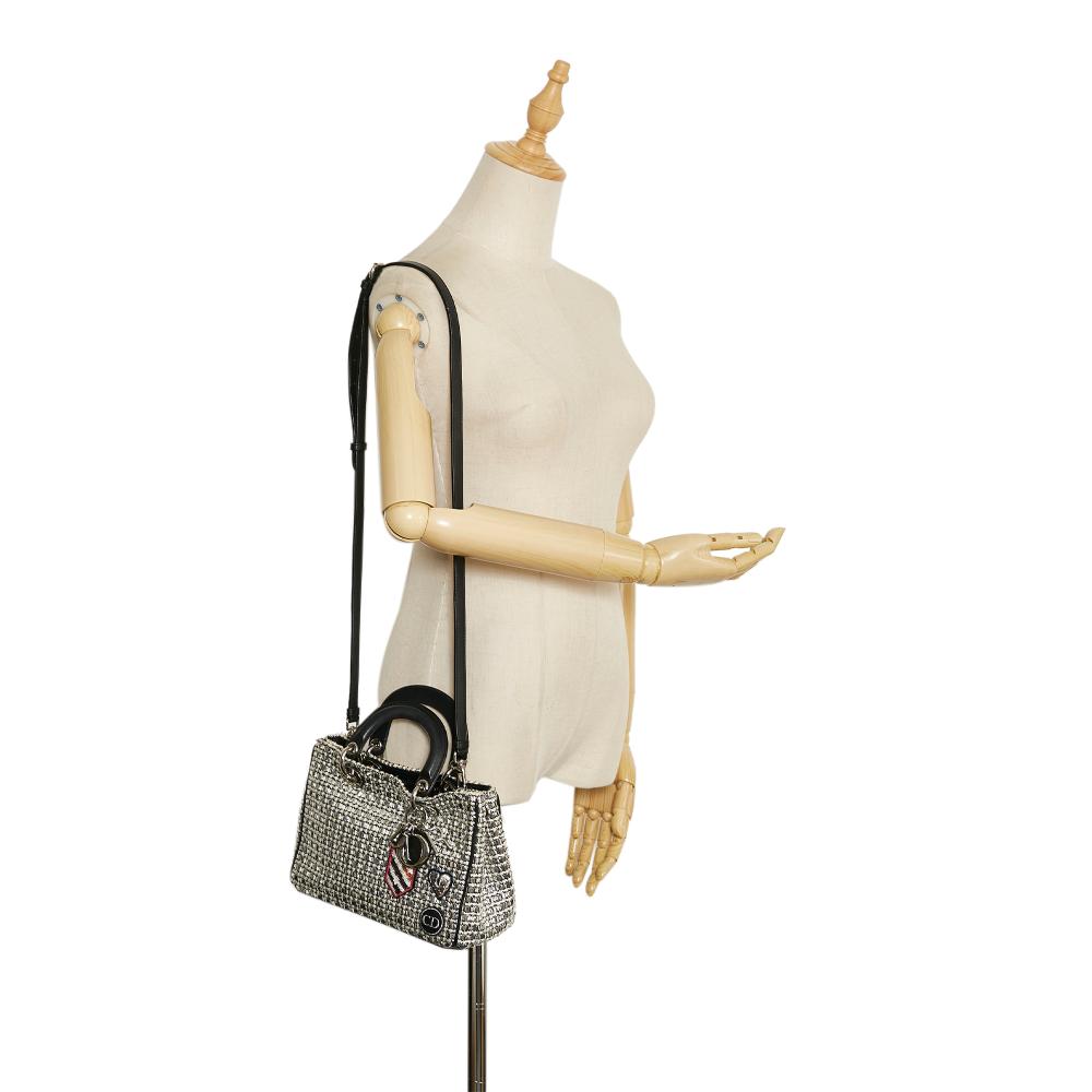 The Lady Dior features a metallic tweed body, flat handles, an adjustable flat strap, an open top with magnetic snap closure, and an interior slip pocket. It carries a B+ condition rating.Exterior Front Out Of Shape, Worn. Exterior Back Out Of Shape, Worn. Exterior Bottom Out Of Shape, Scratched, Worn. Exterior Handle Out Of Shape, Worn. Exterior Corners Worn. Exterior Side Out Of Shape, Worn. Exterior Top Out Of Shape, Worn. Exterior Top stained with Other. Interior Lining Out Of Shape, Worn. Interior Pocket Out Of Shape, Worn. Lock Scratched. Embellishment Scratched. Practical Attachment Scratched. Dimensions:Length 22cmWidth 10cmHeight 16cmHand Drop 7cmShoulder Drop 62cmOriginal Accessories: ity Card, Charm, Shoulder StrapColor: SilverBlackBlackMaterial: Fabric x TweedLeather x CalfLeather x Calf