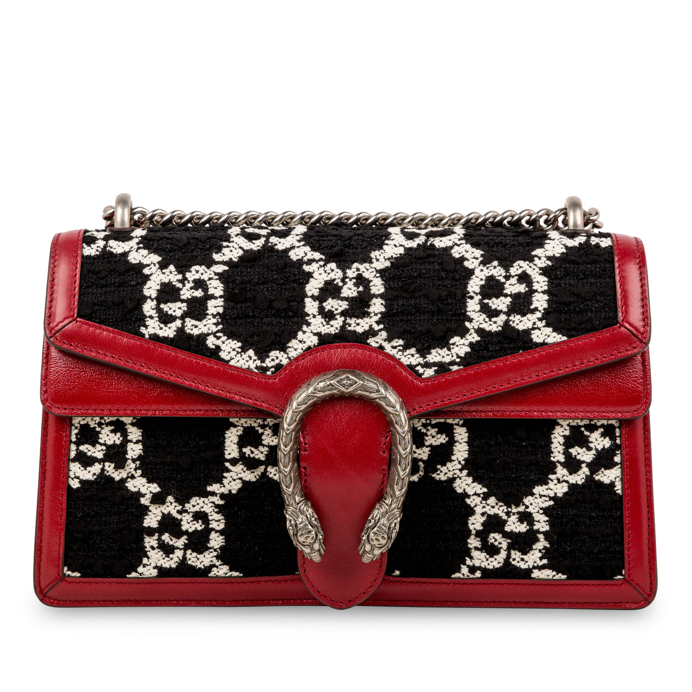 Inspired by the Greek God of wine and celebration, the Gucci Dionysus is an absolute must have for any woman with a love for luxury and a special spot for monograms. An instant classic, the Dionysus has become one of the most coveted bags of the past five years. The perfect companion for any and every occasion, you can easily pair your Dionysus with anything in your wardrobe. Decorated with the GG Supreme print, in a playful twist combining different materials and fabrics for this limited edition piece. Crafted from whitened black tweed fabrics and finished with a red leather trim, and of course the signature tiger clasp, this shoulder bag can easily fit all your every day essentials comfortably inside. Sleek, stylish and sophisticated, this stunning bag is the perfect balance between feminine and edgy. A classic piece you'll have for life, the Dionysus is one you'll never fall out of love with.
